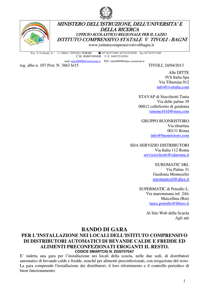 0.5 MINISTERO DELL’ISTRUZIONE, DELL’UNIVERSITA’ E DELLA RICERCA UFFICIO SCOLASTICO REGIONALE PER IL LAZIO ISTITUTO COMPRENSIVO STATALE V TIVOLI - BAGNI www.istitutocomprensivotivolibagni.it Via C.Collodi, 6 - 00011 TIVOLI TERME 0774/371991-0774/353928 C.M. RMIC89000B C.F. 94032510581 mail: [email protected] fax 0774/371305 PEC [email protected] reg. albo n. 107 Prot. N. 3663 b/15 TIVOLI, 24/04/2013 Alle DITTE IVS Italia Spa Via Tiburtina 912 [email protected] STAVAP di Stacchiotti Tania Via delle palme 39 00012 collefiorito di guidonia [email protected] GRUPPO BUONRISTORO Via tiburtina 00131 Roma [email protected] SDA SERVIZIO DISTRIBUTORI Via Italia 112 Roma [email protected] EUROMATIC SRL Via Palme 31 Guidonia Montecelio [email protected] SUPERMATIC di Petrullo L. Via maremmana inf. 24/e Marcellina (Rm) [email protected] Al Sito Web della Scuola Agli atti BANDO DI GARA PER L’INSTALLAZIONE NEI LOCALI DELL'ISTITUTO COMPRENSIVO DI DISTRIBUTORI AUTOMATICI DI BEVANDE CALDE E FREDDE ED ALIMENTI PRECONFEZIONATI EROGANTI IL RESTO. CODICE SMARTCIG N. Z0207570A7 E’ indetta una gara per l’installazione nei locali della scuola, nelle due sedi, di distributori automatici di bevande calde e fredde, nonché per alimenti preconfezionati, con erogazione del resto. La gara comprende l'installazione dei distributori, il loro rifornimento e il controllo periodico di buon funzionamento. 1 La durata del servizio è di anni 3 (tre) con inizio dal 01/09/2013 Non sarà ammesso alcun rinnovo tacito di questo contratto come previsto dalla L. 62/2005, art. 23 e non è previsto l’inoltro di alcuna disdetta da parte di questa amministrazione, in quanto il contratto s’intende automaticamente risolto alla scadenza naturale dell’anno. Alla gara possono partecipare i soggetti in possesso dei previsti requisiti: si rimanda alla sezione apposita per l'ulteriore specifica dei requisiti richiesti. Tutti gli oneri e responsabilità d’istallazione e gestione dei distributori sono a carico della ditta aggiudicataria. Si precisa che a totale carico e responsabilità della ditta sono anche: l'espletamento di ogni adempimento previsto dal “Regolamento di pulizia per la disciplina e l'esercizio del commercio al dettaglio in sede fissa” del Comune di TIVOLI, nonché le comunicazioni all'autorità sanitaria eventualmente necessarie; la dimostrazione del possesso delle licenze amministrative e igienico-sanitarie di legge. La Ditta aggiudicataria dovrà fornire il servizio dall’01/09/2013 conformemente a quanto riportato nel presente bando e nella bozza di convenzione (allegato C); dovrà inoltre versare alla Scuola, anticipatamente, per ogni anno di contratto, i seguenti contributi: 1.500 Euro annui di base per canone di concessione dei servizi; Per ogni quota di 100 Euro in eccesso – rispetto ai 1.500 euro - in base alle risultanze della tabella comparativa circa il rapporto qualità/prezzo, verrà assegnato un punteggio di 10 punti. La gestione dei servizi potrà essere soggetta a controlli periodici da parte del Dirigente Scolastico, del D.S.G.A. o di una eventuale Commissione nominata dal Consiglio d’Istituto. PRESENTAZIONE DELLE OFFERTE E DOCUMENTAZIONE RICHIESTA Le ditte interessate dovranno far pervenire in formato cartaceo l'offerta (via posta o brevi-manu), entro e non oltre le ore 12 del 23.05.2013 presso la segreteria dell’Istituto Comprensivo V Tivoli Bagni Via Collodi 6 00011 Tivoli (Rm). Le offerte dovranno, pena la non ammissibilità, pervenire alla scuola entro tale termine e comunque ogni responsabilità per la mancata consegna nei termini è da addebitarsi alla società interessata (non farà fede il timbro postale). Il plico contenente l’offerta dovrà pervenire in busta chiusa recante la dicitura esterna “Contiene Offerta Distributori Automatici Bevande” e dovrà includere due buste come di seguito specificato: - una busta chiusa denominata “BUSTA 1” recante la dicitura “DOCUMENTI AMMISSIONE” che dovrà contenere una dichiarazione/autocertificazione, corredata da fotocopia semplice di valido documento di identità del sottoscrittore, relativa al possesso dei requisiti per l’ammissione alla gara; - una busta chiusa denominata “BUSTA 2” recante la dicitura “OFFERTA” che dovrà contenere l’offerta economica (modulo di formulazione offerta, conforme al modello “allegato B” ), con specifica indicazione dei prezzi offerti per i singoli prodotti e dell'eventuale contributo aggiuntivo alla scuola; I prezzi dell‘offerta dovranno essere quelli finali del consumatore per acquisti a moneta (comprensivi di IVA e ogni altro onere). A PENA DI ESCLUSIONE dovrà essere utilizzato l’unito “Modulo di formulazione Offerta’’. Tale modulo potrà essere scaricato dal sito dell'Istituto o fornito a richiesta da questa istituzione scolastica anche in formato elettronico, per poter essere trascritto su carta intestata dell’offerente. Sempre in tale modulo, al fine di una corretta e agevole valutazione e comparazione, l’offerta dovrà essere presentata rispondendo pedissequamente a tutte le richieste e dovrà essere sottoscritta dal legale rappresentante della ditta. Potranno essere allegate eventuali note esplicative sulle caratteristiche dell’offerta. La data prevista per l'apertura delle buste è il 24.05.2013 alle ore 10. Tale termine non è ordinatorio. Si aprirà per prima la BUSTA 1 e, se essa contiene quanto richiesto, si procederà all’apertura della BUSTA 2. 2 La valutazione avverrà secondo il sistema dell’offerta economicamente più vantaggiosa, sulla base dei parametri di riferimento e caratteristiche richieste. L‘offerta presentata non può essere ritirata, modificata o sostituita con altra. REQUISITI PER L'AMMISSIBILITA' DELLA DITTA ALL'OFFERTA (BUSTA 1) Sono ammesse a partecipare alla gara le ditte in possesso dei seguenti requisiti: a) Iscrizione al Registro delle Imprese istituito presso la Camera di Commercio, Industria, Artigianato ed Ag