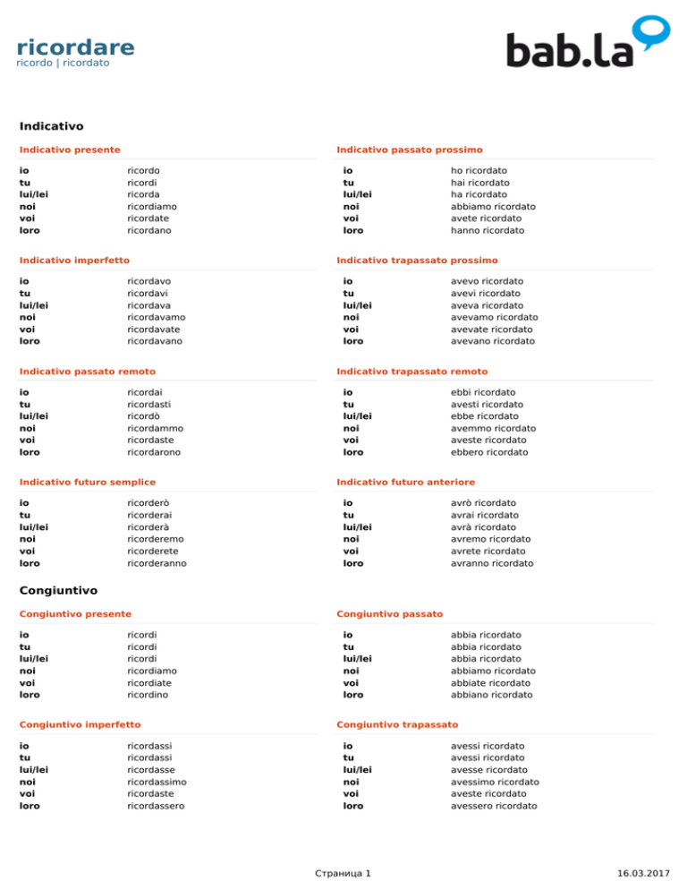 ricordare ricordo | ricordato Indicativo Indicativo presente io tu lui/lei noi voi loro Indicativo passato prossimo ricordo ricordi ricorda ricordiamo ricordate ricordano Indicativo imperfetto io tu lui/lei noi voi loro ricordavo ricordavi ricordava ricordavamo ricordavate ricordavano Indicativo passato remoto io tu lui/lei noi voi loro ricordai ricordasti ricordò ricordammo ricordaste ricordarono Indicativo futuro semplice io tu lui/lei noi voi loro ricorderò ricorderai ricorderà ricorderemo ricorderete ricorderanno io tu lui/lei noi voi loro ho ricordato hai ricordato ha ricordato abbiamo ricordato avete ricordato hanno ricordato Indicativo trapassato prossimo io tu lui/lei noi voi loro avevo ricordato avevi ricordato aveva ricordato avevamo ricordato avevate ricordato avevano ricordato Indicativo trapassato remoto io tu lui/lei noi voi loro ebbi ricordato avesti ricordato ebbe ricordato avemmo ricordato aveste ricordato ebbero ricordato Indicativo futuro anteriore io tu lui/lei noi voi loro avrò ricordato avrai ricordato avrà ricordato avremo ricordato avrete ricordato avranno ricordato Congiuntivo Congiuntivo presente io tu lui/lei noi voi loro ricordi ricordi ricordi ricordiamo ricordiate ricordino Congiuntivo imperfetto io tu lui/lei noi voi loro ricordassi ricordassi ricordasse ricordassimo ricordaste ricordassero Congiuntivo passato io tu lui/lei noi voi loro abbia ricordato abbia ricordato abbia ricordato abbiamo ricordato abbiate ricordato abbiano ricordato Congiuntivo trapassato io tu lui/lei noi voi loro Страница 1 avessi ricordato avessi ricordato avesse ricordato avessimo ricordato aveste ricordato avessero ricordato 16.03.2017 ricordare ricordo | ricordato Condizionale Condizionale presente io tu lui/lei noi voi loro ricorderei ricorderesti ricorderebbe ricorderemmo ricordereste ricorderebbero Condizionale passato io tu lui/lei noi voi loro avrei ricordato avresti ricordato avrebbe ricordato avremmo ricordato avreste ricordato avrebbero ricordato Imperativo Imperativo tu lui/lei noi voi loro ricorda ricordi ricordiamo ricordate ricordino Infinito Infinito Infinito passato Participio Participio presente Participio passato Gerundio Gerundio Gerundio passato Страница 2 Powered by TCPDF (www.tcpdf.org) 16.03.2017