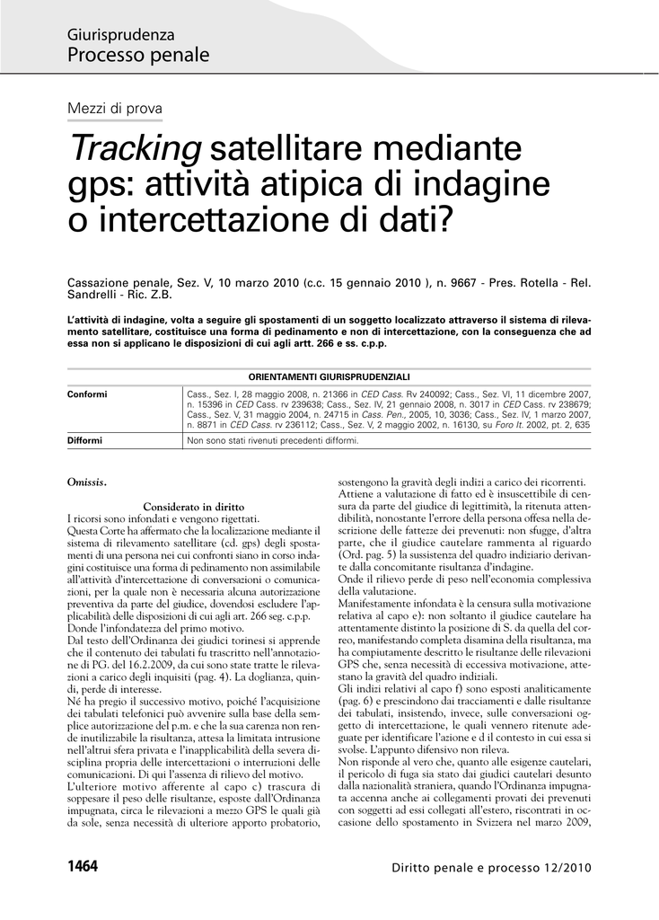 Giurisprudenza Processo penale Mezzi di prova Tracking satellitare mediante gps: attività atipica di indagine o intercettazione di dati? Cassazione penale, Sez. V, 10 marzo 2010 (c.c. 15 gennaio 2010 ), n. 9667 - Pres. Rotella - Rel. Sandrelli - Ric. Z.B. L’attività di indagine, volta a seguire gli spostamenti di un soggetto localizzato attraverso il sistema di rilevamento satellitare, costituisce una forma di pedinamento e non di intercettazione, con la conseguenza che ad essa non si applicano le disposizioni di cui agli artt. 266 e ss. c.p.p. ORIENTAMENTI GIURISPRUDENZIALI Conformi Cass., Sez. I, 28 maggio 2008, n. 21366 in CED Cass. Rv 240092; Cass., Sez. VI, 11 dicembre 2007, n. 15396 in CED Cass. rv 239638; Cass., Sez. IV, 21 gennaio 2008, n. 3017 in CED Cass. rv 238679; Cass., Sez. V, 31 maggio 2004, n. 24715 in Cass. Pen., 2005, 10, 3036; Cass., Sez. IV, 1 marzo 2007, n. 8871 in CED Cass. rv 236112; Cass., Sez. V, 2 maggio 2002, n. 16130, su Foro It. 2002, pt. 2, 635 Difformi Non sono stati rivenuti precedenti difformi. Omissis. Considerato in diritto I ricorsi sono infondati e vengono rigettati. Questa Corte ha affermato che la localizzazione mediante il sistema di rilevamento satellitare (cd. gps) degli spostamenti di una persona nei cui confronti siano in corso indagini costituisce una forma di pedinamento non assimilabile all’attività d’intercettazione di conversazioni o comunicazioni, per la quale non è necessaria alcuna autorizzazione preventiva da parte del giudice, dovendosi escludere l’applicabilità delle disposizioni di cui agli art. 266 seg. c.p.p. Donde l’infondatezza del primo motivo. Dal testo dell’Ordinanza dei giudici torinesi si apprende che il contenuto dei tabulati fu trascritto nell’annotazione di PG. del 16.2.2009, da cui sono state tratte le rilevazioni a carico degli inquisiti (pag. 4). La doglianza, quindi, perde di interesse. Né ha pregio il successivo motivo, poiché l’acquisizione dei tabulati telefonici può avvenire sulla base della semplice autorizzazione del p.m. e che la sua carenza non rende inutilizzabile la risultanza, attesa la limitata intrusione nell’altrui sfera privata e l’inapplicabilità della severa disciplina propria delle intercettazioni o interruzioni delle comunicazioni. Di qui l’assenza di rilievo del motivo. L’ulteriore motivo afferente al capo c) trascura di soppesare il peso delle risultanze, esposte dall’Ordinanza impugnata, circa le rilevazioni a mezzo GPS le quali già da sole, senza necessità di ulteriore apporto probatorio, 1464 sostengono la gravità degli indizi a carico dei ricorrenti. Attiene a valutazione di fatto ed è insuscettibile di censura da parte del giudice di legittimità, la ritenuta attendibilità, nonostante l’errore della persona offesa nella descrizione delle fattezze dei prevenuti: non sfugge, d’altra parte, che il giudice cautelare rammenta al riguardo (Ord. pag. 5) la sussistenza del quadro indiziario derivante dalla concomitante risultanza d’indagine. Onde il rilievo perde di peso nell’economia complessiva della valutazione. Manifestamente infondata è la censura sulla motivazione relativa al capo e): non soltanto il giudice cautelare ha attentamente distinto la posizione di S. da quella del correo, manifestando completa disamina della risultanza, ma ha compiutamente descritto le risultanze delle rilevazioni GPS che, senza necessità di eccessiva motivazione, attestano la gravità del quadro indiziali. Gli indizi relativi al capo f) sono esposti analiticamente (pag. 6) e prescindono dai tracciamenti e dalle risultanze dei tabulati, insistendo, invece, sulle conversazioni oggetto di intercettazione, le quali vennero ritenute adeguate per identificare l’azione e d il contesto in cui essa si svolse. L’appunto difensivo non rileva. Non risponde al vero che, quanto alle esigenze cautelari, il pericolo di fuga sia stato dai giudici cautelari desunto dalla nazionalità straniera, quando l’Ordinanza impugnata accenna anche ai collegamenti provati dei prevenuti con soggetti ad essi collegati all’estero, riscontrati in occasione dello spostamento in Svizzera nel marzo 2009, Diritto penale e processo 12/2010 Giurisprudenza Processo penale circostanza che connota di concretezza la prognosi effettuata dal tribunale torinese. Né la circostanza che il soggiorno elvetico del K. fosse stato consentito dalla sosta in albergo esclude l’assunto, presupponendo - comunque legame di conoscenza ed amicizia in quel territorio. Non è obbligo del giudice valutare ogni doglianza o rilievo difensivo, quando il complesso della motivazione sostenga l’assunto giudiziale: sulla posizione di Z. il provve- dimento impugnato ha dedicato sufficienti osservazioni motivazionali a sostegno delle esigenze cautelari, con passai esaurienti e logici. Al rigetto dei ricorsi segue la condanna di ciascun ricorrente al pagamento delle spese processuali. La cancelleria è delegata agli adempimenti di cui all’art. 94 disp. att. c.p.p. Omissis. Il commento di Daniela Gentile L’attività di monitoraggio degli spostamenti di un soggetto indagato mediante il sistema gps costituisce una forma di pedinamento, sia pure elettronico, e resta esclusa, pertanto, dalla disciplina delle intercettazioni di conversazioni o comunicazioni. Di conseguenza tale attività, in quanto ricompresa nell’ambito delle attività investigative c.d. “atipiche” riconducibili all’art. 189 c.p.p., è pienamente legittima pur in assenza di un decreto autorizzativo del giudice per le indagini preliminari. La decisione tuttavia solleva non pochi rilievi critici, in particolar modo per la mancanza di una compiuta regolamentazione della materia che si pone così in contrasto con la tutela di diritti costituzionalmente garantiti. La questione L’incessante progresso scientifico e tecnologico impone di tenere in debita considerazione gli apporti gnoseologici provenienti dalle scienze e di far così entrare i postulati nel m