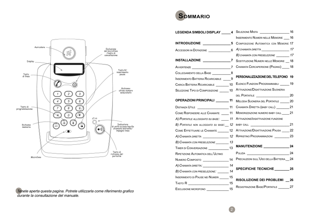 SOMMARIO LEGENDA SIMBOLI DISPLAY _____ 4 SELEZIONE MISTA ________________ 16 INSERIMENTO NUMERI NELLE MEMORIE ___ 16 INTRODUZIONE _______________ 5 C OMPOSIZIONE AUTOMATICA CON MEMORIE 17 ACCESSORI IN DOTAZIONE ____________ 6 A) CHIAMATA DIRETTA _______________ 17 B) CHIAMATA CON PRESELEZIONE _______ 17 INSTALLAZIONE _______________ 7 SOSTITUZIONE NUMERI NELLE MEMORIE __ 18 AVVERTENZE _____________________ 7 CHIAMATA CERCAPERSONE (PAGING) ____ 18 COLLEGAMENTO DELLA BASE __________ 8 INSERIMENTO BATTERIA RICARICABILE ____ 9 PERSONALIZZAZIONE DEL TELEFONO 19 CARICA BATTERIA RICARICABILE _______ 10 ELENCO FUNZIONI PROGRAMMABILI _____ 19 SELEZIONE TIPO DI COMPOSIZIONE _____ 10 ATTIVAZIONE/DISATTIVAZIONE SUONERIA DEL PORTATILE __________________ 20 OPERAZIONI PRINCIPALI _______ 11 MELODIA SUONERIA DEL PORTATILE _____ 20 DISTANZA UTILE _________________ 11 CHIAMATA DIRETTA (BABY CALL) _______ 21 COME RISPONDERE ALLE CHIAMATE ____ 11 MEMORIZZAZIONE NUMERO BABY CALL ____ 21 A) PORTATILE ALLOGGIATO SU BASE: ____ 11 ATTIVAZIONE/DISATTIVAZIONE FUNZIONE B) PORTATILE NON ALLOGGIATO SU BASE: __ 12 BABY CALL _____________________ 21 COME EFFETTUARE LE CHIAMATE ______ 12 ATTIVAZIONE/DISATTIVAZIONE PAUSA ____ 22 A) CHIAMATA DIRETTA ______________ 12 RIPRISTINO PROGRAMMAZIONI ________ 23 B) CHIAMATA CON PRESELEZIONE _______ 13 TIMER DI CONVERSAZIONE ___________ 13 MANUTENZIONE ______________ 24 PULIZIA _______________________ 24 RIPETIZIONE AUTOMATICA DELL’ULTIMO NUMERO COMPOSTO ______________ 14 PRECAUZIONI SULL’USO DELLA BATTERIA __ 24 A) CHIAMATA DIRETTA: ______________ 14 B) CHIAMATA CON PRESELEZIONE: ______ 14 INSERIMENTO DI PAUSE NEI NUMERI _____ 15 SPECIFICHE TECNICHE ________ 25 RISOLUZIONE DEI PROBLEMI __ 26 TASTO R ______________________ 15 Tenete aperta questa pagina. Potrete utilizzarla come riferimento grafico durante la consultazione del manuale. ESCLUSIONE MICROFONO ____________ 15 2 REGISTRAZIONE BASE/PORTATILE ______ 27 I NTRODUZIONE L EGENDA S IMBOLI D ISPLAY Gentile Cliente, innanzitutto desideriamo ringraziarLa per la preferenza accordataci nell'acquisto del cordless CT1 Decò. Si tratta di un prodotto di alta qualità e dotato di prestazioni innovative e funzionali di cui citiamo le più salienti: LAMPEGGIANTE: • Comunicazione chiara e garanzia di protezione sicura da intrusioni nella Vostra linea. • Display multifunzione LCD sul quale verranno visualizzati i numeri composti e i simboli indicanti lo stato operativo del telefono. LINEA ATTIVA E DURANTE LA CONVERSAZIONE. • 24 ore in attesa di chiamate senza dovere ricaricare la batteria. DURANTE IL COLLEGAMENTO RADIO TRA PORTATILE E BASE QUANDO SI • Visualizzazione della durata della conversazione • Segnalazione acustica e visiva delle chiamate in arrivo. • Chiamata con pre-selezione. • Ripetizione automatica dell'ultimo numero composto con possibilità di inserimento manuale delle cifre iniziali. • Possibilità di inserimento pausa automatica dopo la prima cifra digitata. • Tasto R (Flash) per l’accesso ai Servizi Telefonici di Telecom Italia. • Possibilità di composizione mista (es.: decadico + multifrequenza). • Esclusione del microfono. • 10 memorie telefoniche ad accesso indiretto con possibilità di inserimento pause. • Chiamata diretta (baby call): consente a bambini, persone anziane o disabili di comporre un numero prioritario o di emergenza alla semplice DURANTE IL COLLEGAMENTO RADIO TRA PORTATILE E BASE; QUANDO È IN ARRIVO UNA CHIAMATA ESTERNA O DALLA BASE (FUNZIONE "CERCAPERSONE"). FISSO: LAMPEGGIANTE: ATTIVA LA PROGRAMMAZIONE. FISSO: DURANTE LA PROGRAMMAZIONE DELLE FUNZIONI DISPONIBILI E DELLE MEMORIE TELEFONICHE. LAMPEGGIANTE: QUANDO È ATTIVA L'ESCLUSIONE DEL MICROFONO. LAMPEGGIANTE: BATTERIA IN VIA D'ESAURIMENTO. FISSO: QUANDO IL PORTATILE È COLLOCATO SULLA BASE IN CARICA. RAGGIUNGIMENTO LIMITE AREA COPERTURA RADIO TRA BASE / PORTATILE DURANTE LA CONVERSAZIONE. pressione di qualsiasi tasto (ad esclusione di 4 ). • Selezione del tipo di suoneria del portatile (4 melodie). • Possibilità di esclusione della suoneria. • Funzione di chiamata cercapersone da base a unità portatile. 5 • Indicazione sul display di batteria scarica. • Indicazione visiva e acustica di fuori copertura radio. Il costruttore, nell’impegno di migliorare costantemente la qualità dei propri prodotti, si riserva la facoltà di variare le caratteristiche del telefono senza preavviso. I NSTALLAZIONE AVVERTENZE Decò è un telefono cordless di qualità e Vi garantirà anni di perfetto ed affidabile funzionamento se osserverete queste semplici regole, valide per qualsiasi dispositivo domestico elettrico o elettronico: ACCESSORI IN DOTAZIONE IMPORTANTE! Seguite scrupolosamente tutte le istruzioni di installazione, in particolar modo quelle relative alla carica della batteria da effettuarsi prima dell’uso e subito dopo l’installazione. La confezione comprende: • Una unità base per Decò con caricabatterie incorporato. • Una unità portatile Decò. • Un cavo telefonico lungo con spina/presa. • Una clip da trasporto per il portatile. • Un alimentatore da 230V – 50Hz / 11Vc.c. - 110mA, 8,5Vc.a. - 60mA. • Una batteria ricaricabile Ni-Mh 3.6V 280mAh da installare nel portatile. • Il presente manuale d’uso. • Il certificato di garanzia. Se qualcuno di questi elementi dovesse mancare, contattate immediatamente il rivenditore. 6 • Collocate la base del telefono su una superficie piana e stabile, in un luogo asciutto, poco polveroso ed al riparo dai raggi solari diretti. • Per l’installazione scegliete un luogo dal quale possiate agevolmente accedere ad una presa telefonica e ad una presa di rete 220V. • Tanto la base che il portatile sono sensibili all’umidità, polvere e vibrazioni eccessive nonché alle forti cadute; entrambi i fattori possono danneggiarli seriamente. • Non installate la base del Vostro telefono vicino ad apparecchi che possono produrre forti disturbi elettrici (es