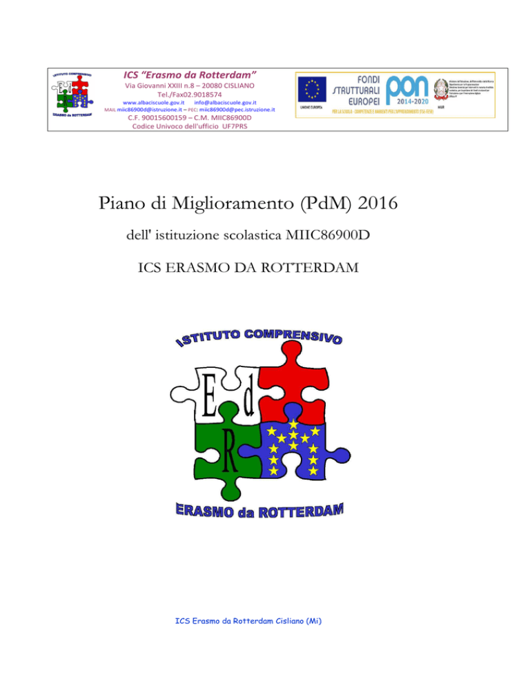 ICS “Erasmo da Rotterdam” Via Giovanni XXIII n.8 – 20080 CISLIANO Tel./Fax02.9018574 www.albaciscuole.gov.it [email protected] MAIL [email protected] – PEC: [email protected] C.F. 90015600159 – C.M. MIIC86900D Codice Univoco dell'ufficio UF7PRS Piano di Miglioramento (PdM) 2016 dell' istituzione scolastica MIIC86900D ICS ERASMO DA ROTTERDAM ICS Erasmo da Rotterdam Cisliano (Mi) PRIMA SEZIONE SCENARIO DI RIFERIMENTO A seguito del DPR n. 80/2013, nel quale viene richiesto alle scuole il procedimento di autovalutazione, dopo la compilazione e la revisione del Rapporto di Autovalutazione, è stato accertato che: nell’area CONTESTO E RISORSE la situazione è buona sia per il contesto socioeconomico sia per le opportunità di collaborazione con le Amministrazioni comunali, l’associazione genitori e le agenzie educative presenti; nell’area ESITI DEGLI STUDENTI i risultati sono positivi per la maggior parte (si sono verificate pochissime bocciature) anche grazie alla personalizzazione dei percorsi educativi. Emerge però, nonostante medie superiori a quelle nazionale e lombarda, una certa disomogeneità tra i risultati delle prove Invalsi nei diversi plessi dell’Istituto nell’APROCESSI E PRATICHE EDUCATIVE E DIDATTICHE buone sono le iniziative per differenziazione (corsi di recupero, didattica personalizzata per alunni con DSA o BES, attuazione progetto GiADA a partire dal termine della classe prima della scuola primaria per l’individuazione di alunni con DSA). nell’AREA PROCESSI–PRATICHE GESTIONALI ED ORGANIZZATIVE è positiva l’organizzazione curato il passaggio delle informazioni alle famiglie anche attraverso il sito web. E’ previsto un piano di aggiornamento e formazione per il personale docente e non docente. ICS Erasmo da Rotterdam Cisliano (Mi) SECONDA SEZIONE ELABORARE UN PIANO DI MIGLIORAMENTO BASATO SUL RAPPORTO DI AUTOVALUTAZIONE GRUPPO DI MIGLIORAMENTO I componenti del Gruppo di Miglioramento sono stati individuati dal Dirigente Scolastico, in base al deliberato collegiale, per quel che riguarda il gruppo di miglioramento e le Funzioni Strumentali, e in base al gruppo di autovalutazione costituito per l’elaborazione del RAV, nonché in rapporto alla disponibilità ed alla motivazione evidenziate dai Docenti ad impegnarsi in un percorso progettuale particolarmente impegnativo. Si è privilegiato il principio dell’ottimizzazione delle risorse umane e finanziarie, stabilendo così un rapporto di stretta connessione tra Piano di Miglioramento e Piano Triennale dell’Offerta Formativa. ICS Erasmo da Rotterdam Cisliano (Mi) Tabella 1 Nome Ruolo Perini Flavia Docente scuola primaria e funzione strumentale. Coordinare le attività della scuola primaria e collaborare per la realizzazione del piano di miglioramento, con particolare attenzione al gruppo di lavoro per la predisposizione del PTOF. Cislaghi Luisella Docente scuola primaria e referente di plesso. Coordinare le attività della scuola primaria e collaborare per la realizzazione del piano di miglioramento. Costa Guglielmina Docente scuola dell'infanzia e referente di plesso. Coordinare le attività della scuola dell'infanzia e collaborare per la realizzazione del piano di miglioramento. Beolchi Marialuisa Collaboratore vicario docente scuola secondaria. Coordinare le attività svolte dall'istituto con particolare riferimento alla scuola secondaria.Confrontarsi con il DS e i referenti di plesso. Giorgi Luciano Dirigente scolastico Vabanesi Elena Docente scuola primaria e funzione strumentale. Coordinare le attività e collaborare per la realizzazione del piano di miglioramento, con particolare attenzione al gruppo di lavoro per l'integrazione e l'inclusione degli alunni DVA, DSA e BES Portalupi Viviana Colombo Carla Docente scuola primaria e referente di plesso. Coordinare le attività della scuola primaria e collaborare per la realizzazione del piano di miglioramento. Dsga. Coordinare e armonizzare tutti gli aspetti amministrativo-contabili e attuare le procedure normative richieste ICS Erasmo da Rotterdam Cisliano (Mi) RELAZIONE TRA RAV E PdM Il Dirigente Scolastico, pienamente consapevole dei fattori di criticità, emersi dalla compilazione del RAV, ha integrato, all’inizio dell’anno scolastico, il Gruppo di Miglioramento con altri componenti motivati e in possesso di idonee competenze, con l’impegno di definire il Piano di Miglioramento (PdM), tenendo presenti soprattutto il contesto socio-economico e culturale in cui l’Istituzione opera, e le linee progettuali del PTOF. L’autovalutazione ha avuto la funzione di introdurre modalità riflessive sull’intera organizzazione dell’offerta educativa e didattica della scuola, ai fini del suo continuo miglioramento. Attraverso i dati di rendicontazione appare necessario che la Scuola affini la didattica per competenze superando la didattica basata sulle conoscenze, attraverso la riproposizione non sterile e meccanica delle discipline, e attraverso un potenziamento della lezione laboratoriale, così da rendere lo studente protagonista dei processi di apprendimento. INTEGRAZIONE TRA PIANO E PTOF (Il PTOF è stato approvato dal Consiglio di Istituto nella seduta del 14/01/2016). Il presente Piano di Miglioramento si colloca su una linea di stretta correlazione e coerenza con le attività, i progetti e gli obiettivi inseriti nel PTOF, essendone parte integrante e fondamentale: il PdM rappresenta la politica strategica dell’Istituzione per intraprendere un’azione di qualità, alla luce di quanto emerso dal RAV. QUICK WINS Azioni di rapida attuazione e ad effetto immediato poste in essere nel periodo tra l’autovalutazione e la definizione del piano e riproposte per il futuro. Pubblicazione del PTOF, del RAV e del Piano di Miglioramento sul sito web dell’Istituto Disseminazione di informazioni nei riunioni dei Collegi dei docenti e del Consiglio di Istituto Discussioni e informazioni nei Dipartimenti disciplinari, nel Consiglio di Intersezi