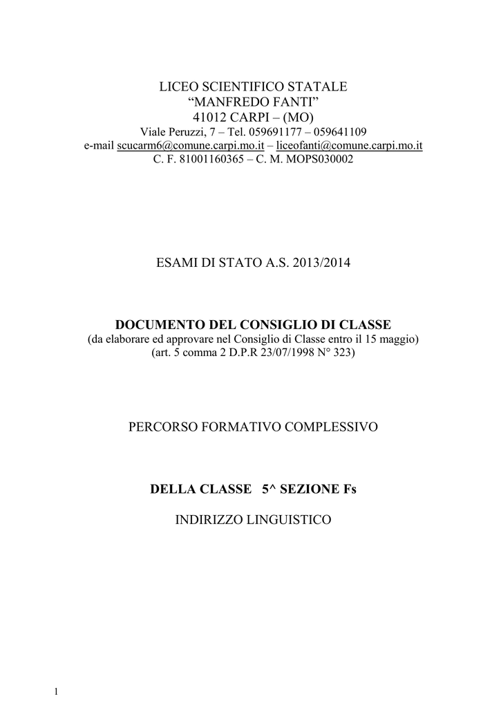LICEO SCIENTIFICO STATALE “MANFREDO FANTI” 41012 CARPI – (MO) Viale Peruzzi, 7 – Tel. 059691177 – 059641109 e-mail [email protected] – [email protected] C. F. 81001160365 – C. M. MOPS030002 ESAMI DI STATO A.S. 2013/2014 DOCUMENTO DEL CONSIGLIO DI CLASSE (da elaborare ed approvare nel Consiglio di Classe entro il 15 maggio) (art. 5 comma 2 D.P.R 23/07/1998 N° 323) PERCORSO FORMATIVO COMPLESSIVO DELLA CLASSE 5^ SEZIONE Fs INDIRIZZO LINGUISTICO 1 SOMMARIO 1. LE FINALITA' FORMATIVE DELLA SCUOLA 2. LE FINALITA' SPECIFICHE DELL'INDIRIZZO 3. PROFILO FORMATIVO IN USCITA 4. PIANO DI STUDIO DELLA CLASSE 5. CONTINUITA' DIDATTICA NEL TRIENNIO 6. STORIA DELLA CLASSE 7. GLI OBIETTIVI COMUNI DEL CONSIGLIO DI CLASSE obiettivi comportamentali obiettivi cognitivi 8 IL PERCORSO FORMATIVO 8.1 8.2 8.3 8.4 8.5 8.6 8.7 8.8 I CONTENUTI LE ATTIVITA' INTER- ED EXTRACURRICOLARI I METODI I MEZZI GLI SPAZI GLI STRUMENTI DI VERIFICA LE TIPOLOGIE DI VERIFICA I CRITERI DI VALUTAZIONE 9. GIUDIZIO SULLA CLASSE 10. I DOCENTI DEL CONSIGLIO DI CLASSE 11. LA COMMISSIONE PER L'ESAME DI STATO 12. ALLEGATI 2 1. LE FINALITÀ FORMATIVE DELLA SCUOLA Le finalità formative esplicitano i valori a cui si ispirano le scelte della scuola e che la scuola intende promuovere negli studenti. Esse definiscono il quadro di riferimento entro cui si collocano i singoli interventi formativi e didattici; si traducono negli obiettivi che vengono fissati in sede di programmazione dai Dipartimenti, dai Consigli di Classe e dagli insegnanti delle diverse discipline. Finalità e obiettivi si distinguono per i tempi di realizzazione, per il grado di specificità, di precisione e di verificabilità. Mentre le finalità sono traguardi a lungo termine verso cui tendere, che non necessariamente si conseguono nell'arco del quinquennio e che comunque non è possibile definire, osservare e misurare in modo preciso, gli obiettivi sono comportamenti precisi, osservabili e misurabili e coincidono con ciò che lo studente deve saper fare al termine di ogni tappa (unità didattica, quadrimestre, anno di corso, biennio, triennio) del percorso formativo e didattico. Finalità Formative Strategie di Intervento Valorizzare la cultura della democrazia e della pace Favorire la conoscenza storica e civile dei valori democratici Offrire occasioni di dibattito democratico Sostenere la partecipazione attiva agli organi della scuola come punto di partenza di una cultura civica 2. Educare al rispetto e alla valorizzazione della diversità Favorire la comprensione delle altre culture attraverso l‟apprendimento linguistico Attivare esperienze educative che promuovano il senso di solidarietà e scoraggino atteggiamenti pregiudiziali Realizzare esperienze concrete che stimolino la conoscenza e il rispetto delle diversità 3. Educare alla salute e al rispetto Attuare programmi di prevenzione (contro dell‟ambiente alcolismo, fumo, droga, AIDS, ecc.) in collaborazione con le strutture socio-sanitarie competenti Individuare la valenza formativa di ciascuna disciplina in relazione ai vari programmi di prevenzione attuati Realizzare programmi di raccolta differenziata e di risparmio energetico Valorizzare gli spazi verdi 4. Stimolare la motivazione Valorizzare la valenza formativa di ogni disciplina all‟apprendimento e allo studio Favorire attraverso i contenuti disciplinari lo sviluppo e il riconoscimento di attitudini e potenzialità individuali 3 5. Prevenire l‟insuccesso scolastico e favorire la prosecuzione degli studi Acquisire tutte le informazioni utili per la valutazione del curricolo degli studenti (fascicolo personale, P.O.F. delle scuole di provenienza, programmi ministeriali, etc.) Attivare progetti di accoglienza Individuare strategie di sostegno e attività di potenziamento Armonizzare la programmazione fra biennio e triennio Facilitare occasioni di colloqui, anche individuali, fra studenti e insegnanti 6. Promuovere la progettualità e l‟autonomia degli studenti Fornire occasioni per imparare a progettare Fornire metodologie per il reperimento e l‟utilizzo delle informazioni Sostenere la realizzazione di progetti verificabili Stimolare l‟acquisizione del senso di responsabilità personale 7. Promuovere l‟autovalutazione e l‟autostima Illustrare agli studenti gli obiettivi educativi/didattici e i criteri di valutazione adottati Favorire la consapevolezza degli studenti in merito alla dinamica del loro processo di apprendimento e al livello di competenza raggiunto 8. Sviluppare competenze relazionali e disponibilità all‟apprendimento permanente Stimolare le modalità di lavoro di gruppo, nel gruppo classe o in un contesto di classi aperte Favorire il dibattito democratico fra pari Educare all‟ascolto e alla riflessione 9. Valorizzare ed indirizzare attitudini ed interessi personali Stimolare attività creative ed espressive (teatro, musica, etc.) Sostenere attività di laboratorio (fisica, chimica, informatica) Favorire la realizzazione di prodotti multimediali 10. Assicurare un raccordo fra scuola e realtà socio-culturale circostante Predisporre spazi e tempi di scambio con la realtà socio-culturale circostante, con particolare riferimento agli interessi giovanili (corsi, incontri, partecipazione a spettacoli, ecc.) Sviluppare il concetto di cittadinanza europea e globale e di comunità di pari opportunità 11. Favorire la prosecuzione degli studi Organizzare attività di orientamento implicito ed esplicito Predisporre contatti con Università ed Enti preposti alla formazione Sviluppare capacità di ricerca e gestione delle informazioni Educare alla scelta 4 2. LE FINALITA' SPECIFICHE DELL'INDIRIZZO LICEO SCIENTIFICO INDIRIZZO LINGUISTICO (C.M.27/91) L'indirizzo linguistico, attraverso lo studio delle lingue straniere più richieste, offre gli strumenti necessari per partecipare in modo attivo ai processi di globalizzazione in atto nel mondo delle professioni e delle culture. L'insegnamento delle lingue è supportato per tutto il 