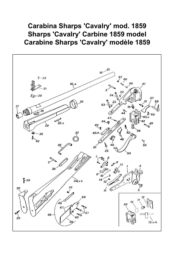 Carabina Sharps 'Cavalry' mod. 1859 Sharps 'Cavalry' Carbine 1859 model Carabine Sharps 'Cavalry' modèle 1859 No. Nomenclatura / List / Liste English Italiano Français Codice Reference Référence 1 Cartella Lock plate Platine 2 Vite posteriore cartella Rear lock plate screw Vis postérieure de platine M70AFM0225 3 Vite anteriore cartella Front lock plate screw Vis antérieure de platine M70AFM0226 4 Cane Hammer Chien 5 Vite cane Hammer screw Vis du chien 6 Braghetta Bridle Bride 7 Vite braghetta Bridle screw Vis de bride 8 Leva scatto Sear Gâchette 0800000232 9 Tirantino Stirrup Chaînette 0800000233 10 Vite tirantino Stirrup screw Vis de chaînette 11 Molla cane Mainspring Grand ressort 12 Vite molla cane Mainspring screw Vis du grand ressort 13 Noce Tumbler Noix 0800001182 14 Farfallina Fly Papillon 0800001205 15 Luminello Nipple Cheminée 0800000185 16 Canna Barrel Canon 0800000207 16a Canna completa Barrel with spares Canon complet 080000207B 17 Camerina flottante Sleeve Chambre flottant 0800001169 18 Supporto molla elevatore Barrel stud Support du ressort élévateur 0800000217 19 Mirino Front sight Guidon 0800000211 20 Supporto alzo Rear sight base Support de l'hausse 21 Alzo completo Rear sight, assembled Hausse complète 22 Vite base alzo Rear sight screw Vis de fixation embase hausse 23 Grano chiusura fori diottra Screw for diopter mounting hole Vis du trou montage dioptre M70AST0190 24 Virte anteriore codettone Front tang screw Vis antérieure de queue de culasse M70AFM0212 25 Vite posteriore sottoguardia Rear trigger guard screw Vis postérieure de sous-garde M70LFM5324 26 Vite molla tabacchiera Patch-box spring screw Vis du ressort du patch-box M70AFC1212 27 Vite tabacchiera Patch-box screw Vis du patch-box M70LFC5392 28 Vite calciolo Butt plate screw Vis de queue de cilasse M70LFM5324 29 Astina Forend Fût ou devant 0800000270 30 Ghiera zigrinata Forend screw bush Rosette de vis du fût ou devant 0800000220 31 Vite anteriore cavallotto Front saddle ring bar screw Vis antérieure du crampillon M70AFM5414 32 Molla fascetta Band spring Ressort de bande du canon 32a Spina molla fascetta Band spring pin Goupille de ressort du bande du canon 0800000222 M70COP5800 33 Fascetta Band Bande du canon 34 Calcio Stock Crosse 0800000254 34a Calcio finito Stock finished Crosse ouvragé 080000254A 34b Calcio completo Stock with spares Crosse complet 080000254B 35 Calciolo Butt plate Plaque de couche 0800000247 36 Cavallotto Saddle ring bar Crampillon 0800000248 37 Anello sella Saddle ring Anneau pour la selle 0800000250 38 Controcartella Side plate Contre-platine 0800000253 39 Sportello tabacchiera Patch-box Patch-box 800001573 40 Molla tabacchiera Patch-box spring Ressort du patch-box 0800001570 41 Bascula Frame Carcasse 0800000257 42 Blocco elevatore (vecchia versione) Breech block (old version) Bloc de culasse (veille version) 0800000181 43 Piastra tagliabossolo (vecchia versione) Gas seal (old version) Plate tranche-cartouche (veille version) 43a Distanziale piastrina tagliabossolo (vecchia versione) Gas seal plate washer (old version) Entretoise plate tranche-cartouche (veille version) 0800000182 0800000271 44 Vite focone Vent screw Vis de contre-lumière M70APC0183 45 Vite superiore ginocchiera Upper toggle link screw Vis supérieure de genouillère M70AFM0184 46 Grilletto Trigger Détente 47 Vite grilletto Trigger screw Vis de détente 48 Bottone sicura Lever catch Bouton de la sûreté 49 Molla bottone sicura Lever catch spring Ressort bouton de la sûreté 49a Perno bottone sicura Lever catch pin Pivot du bouton de la sûreté 0800000189 M70SPC6125 50 Vite molla leva armamento Lever spring screw Vis du ressort du levier d'armement M70AFC0196 51 Sottoguardia Trigger plate Sous-garde 0800000193 52 Vite anteriore sottoguardia Front trigger plate screw Vis antérieure de sous-garde M70AFC0194 53 Vite posteriore codettone Rear tang screw Vis postérieure de queue de culasse M70AFM0197 54 Leva armamento Lever Levier d'armement 55 Vite inferiore ginocchiera Lower toggle link screw Vis inférieure de genouillère 56 Ginocchiera Toggle Genouillère 0800000200 57 Molla leva armamento Lever spring Ressort du levier d'armement 0800000201 58 Perno leva armamento Lever pin Pivot du levier d'armement 59 Perno arresto leva Lever plunger pin Pivot d'arrêt du levier d'armement 60 Molla arresto Lever plunger pin spring Ressort du pivot d'arrêt 0800000205 61 Vite fermo molla arresto Lever plunger pin spring screw Vis du ressort du pivot d'arrêt M70AFC0206 62 Vite astina Forend screw Vis du fût ou devant M70AFC0221 63 Vite molla bottone sicura Lever catch spring screw Vis du ressort du bouton de la sûreté M70AFC0192 64 Vite bottone sicura Lever catch screw Vis bouton de la sûreté M70AFC0191 S. 766 0800000224 0800000227 M70AFM0228 0800000230 M70AFM0231 M70AFM0234 0800000260 M70AFM0236 USA 420 0800000223 0800000186 M70AFM0187 0800000188 0800000208 M70AFM0199 0800000214 M70APC0204 No. Italiano Nomenclatura / List / Liste English Français Codice Reference Référence 65 Spina tabacchiera Patch-box pins Goupille du patch-box 66 Supporto tabacchiera Patch-box block Patch-box Support du patch-box 0800001569 Patch-box 080G001569 080G001572 67 Corpo tabacchiera M70COP5772 68 Tabacchiera completa Patch-box assembly Patch-box complet 69 Blocco elevatore per sistema a focone rimovibile Breech block for removable touch hole system Bloc de culasse pour nouveau system avec lumiére amovible 0800000281 70 Anello OR per sistema a focone rimovibile O ring for the new system Anneau pour le nouveau system 0800000288 71 Focone per sistema a focone rimovibile Touch hole for the removable system Lumiére pour le system amovible 0800000282 72 Piastra tagliabossolo per sistema a focone rimovibile Seal plate for the new removable system Plate tranche-cartouche pour le nouveau system amovible 0800000284 Touch hole wrench for the new system Clef pour la lumiére du nouveau system amovible 080G000283 73 Chiave focone p