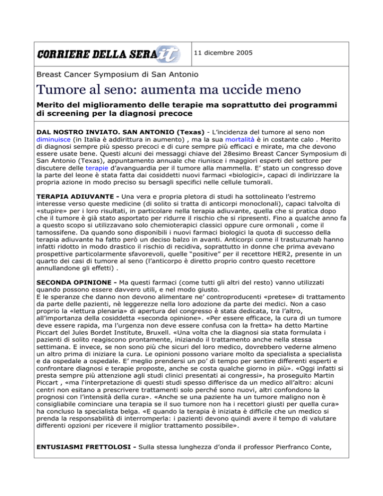 11 dicembre 2005 Breast Cancer Symposium di San Antonio Tumore al seno: aumenta ma uccide meno Merito del miglioramento delle terapie ma soprattutto dei programmi di screening per la diagnosi precoce DAL NOSTRO INVIATO. SAN ANTONIO (Texas) - L’incidenza del tumore al seno non diminuisce (in Italia è addirittura in aumento) , ma la sua mortalità è in costante calo . Merito di diagnosi sempre più spesso precoci e di cure sempre più efficaci e mirate, ma che devono essere usate bene. Questi alcuni dei messaggi chiave del 28esimo Breast Cancer Symposium di San Antonio (Texas), appuntamento annuale che riunisce i maggiori esperti del settore per discutere delle terapie d’avanguardia per il tumore alla mammella. E’ stato un congresso dove la parte del leone è stata fatta dai cosiddetti nuovi farmaci «biologici», capaci di indirizzare la propria azione in modo preciso su bersagli specifici nelle cellule tumorali. TERAPIA ADIUVANTE - Una vera e propria pletora di studi ha sottolineato l’estremo interesse verso queste medicine (di solito si tratta di anticorpi monoclonali), capaci talvolta di «stupire» per i loro risultati, in particolare nella terapia adiuvante, quella che si pratica dopo che il tumore è già stato asportato per ridurre il rischio che si ripresenti. Fino a qualche anno fa a questo scopo si utilizzavano solo chemioterapici classici oppure cure ormonali , come il tamossifene. Da quando sono disponibili i nuovi farmaci biologici la quota di successo della terapia adiuvante ha fatto però un deciso balzo in avanti. Anticorpi come il trastuzumab hanno infatti ridotto in modo drastico il rischio di recidiva, soprattutto in donne che prima avevano prospettive particolarmente sfavorevoli, quelle “positive” per il recettore HER2, presente in un quarto dei casi di tumore al seno (l’anticorpo è diretto proprio contro questo recettore annullandone gli effetti) . SECONDA OPINIONE - Ma questi farmaci (come tutti gli altri del resto) vanno utilizzati quando possono essere davvero utili, e nel modo giusto. E le speranze che danno non devono alimentare ne’ controproducenti «pretese» di trattamento da parte delle pazienti, nè leggerezze nella loro adozione da parte dei medici. Non a caso proprio la «lettura plenaria» di apertura del congresso è stata dedicata, tra l’altro, all’importanza della cosiddetta «seconda opinione». «Per essere efficace, la cura di un tumore deve essere rapida, ma l’urgenza non deve essere confusa con la fretta» ha detto Martine Piccart del Jules Bordet Institute, Bruxell. «Una volta che la diagnosi sia stata formulata i pazienti di solito reagiscono prontamente, iniziando il trattamento anche nella stessa settimana. E invece, se non sono più che sicuri del loro medico, dovrebbero vederne almeno un altro prima di iniziare la cura. Le opinioni possono variare molto da specialista a specialista e da ospedale a ospedale. E’ meglio prendersi un po’ di tempo per sentire differenti esperti e confrontare diagnosi e terapie proposte, anche se costa qualche giorno in più». «Oggi infatti si presta sempre più attenzione agli studi clinici presentati ai congressi», ha proseguito Martin Piccart , «ma l‘interpretazione di questi studi spesso differisce da un medico all’altro: alcuni centri non esitano a prescrivere trattamenti solo perché sono nuovi, altri confondono la prognosi con l’intensità della cura». «Anche se una paziente ha un tumore maligno non è consigliabile cominciare una terapia se il suo tumore non ha i recettori giusti per quella cura» ha concluso la specialista belga. «E quando la terapia è iniziata è difficile che un medico si prenda la responsabilità di interromperla: i pazienti devono quindi avere il tempo di valutare differenti opzioni per ricevere il miglior trattamento possibile». ENTUSIASMI FRETTOLOSI - Sulla stessa lunghezza d’onda il professor Pierfranco Conte, direttore del Dipartimento di Oncologia Medica dell’Università di Modena: «Uno dei farmaci più “di moda”, un anticorpo antiangiogenesi, è ormai stato adottato in molti ospedali americani come terapia standard (in combinazione con un chemioterapico classico) per alcuni tipi di carcinoma della mammella, soprattutto dietro una forte pressione mediatica che ha fatto seguito alla presentazione di alcuni risultati positivi a un importante congresso dell’anno scorso». «Ma in realtà, diversi studi indicano che la sua efficacia è tutt’altro che provata»,prosegue l’oncologo, «e quindi, secondo me, è folle utilizzare questo schema terapeutico in prima battuta, anche per il suo notevole costo, che è di 100mila dollari all’anno». E anche su farmaci come il trastuzumab, dotato di prove di efficacia certamente più convincenti, si ha ancora molto da imparare , talvolta anche grazie anche alla rivalutazione di farmaci meno “a la page”. «Proprio da uno studio internazionale presentato a questo congresso, il BCIRG006», spiega il professor Angelo Raffaele Bianco, direttore del Dipartimento di Endocrinologia e Oncologia Molecolare e Clinica dell’Università Federico II di Napoli, «abbiamo appreso per esempio che somministrare il trastuzumab nelle donne HER2 positive insieme al docetaxel un chemioterapico tradizionale invece che con un altro chemioterapico cui è di solito associato, permette di mantenere inalterata la sua, notevole, efficacia, ma di ridurre la sua tossicità sul cuore, che rappresenta il più grosso limite al suo utilizzo».«E allo stesso tempo, sempre grazie allo stesso studio, abbiamo però anche capito che per le donne in cui si esprime un certo gene, ma solo per quelle, vale invece la pena continuare la vecchia ssociazione perché la sua efficacia è alta da controbilanciare l'eventuale rischio di tossicità cardiaca ». Uno studio con farmaci «vecchi» e meno costosi ha quindi potuto portare informazioni utili per un utilizzo migliore e più «personalizzato» di un farmaco nuovo. TERAPIA P