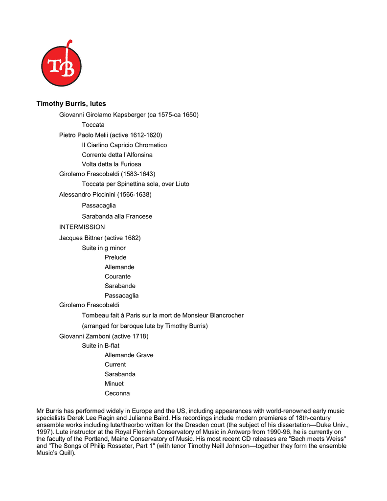 Timothy Burris, lutes Giovanni Girolamo Kapsberger (ca 1575-ca 1650) Toccata Pietro Paolo Melii (active 1612-1620) Il Ciarlino Capricio Chromatico Corrente detta l’Alfonsina Volta detta la Furiosa Girolamo Frescobaldi (1583-1643) Toccata per Spinettina sola, over Liuto Alessandro Piccinini (1566-1638) Passacaglia Sarabanda alla Francese INTERMISSION Jacques Bittner (active 1682) Suite in g minor Prelude Allemande Courante Sarabande Passacaglia Girolamo Frescobaldi Tombeau fait à Paris sur la mort de Monsieur Blancrocher (arranged for baroque lute by Timothy Burris) Giovanni Zamboni (active 1718) Suite in B-flat Allemande Grave Current Sarabanda Minuet Ceconna Mr Burris has performed widely in Europe and the US, including appearances with world-renowned early music specialists Derek Lee Ragin and Julianne Baird. His recordings include modern premieres of 18th-century ensemble works including lute/theorbo written for the Dresden court (the subject of his dissertation—Duke Univ., 1997). Lute instructor at the Royal Flemish Conservatory of Music in Antwerp from 1990-96, he is currently on the faculty of the Portland, Maine Conservatory of Music. His most recent CD releases are "Bach meets Weiss" and "The Songs of Philip Rosseter, Part 1" (with tenor Timothy Neill Johnson—together they form the ensemble Music’s Quill).