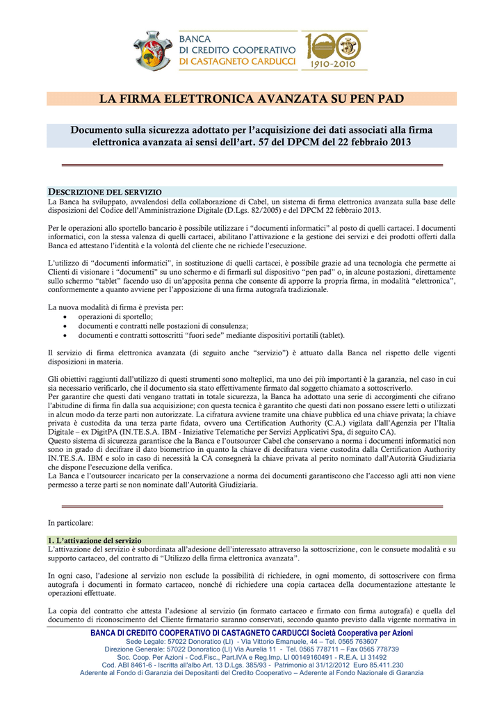 LA FIRMA ELETTRONICA AVANZATA SU PEN PAD Documento sulla sicurezza adottato per l’acquisizione dei dati associati alla firma elettronica avanzata ai sensi dell’art. 57 del DPCM del 22 febbraio 2013 DESCRIZIONE DEL SERVIZIO La Banca ha sviluppato, avvalendosi della collaborazione di Cabel, un sistema di firma elettronica avanzata sulla base delle disposizioni del Codice dell’Amministrazione Digitale (D.Lgs. 82/2005) e del DPCM 22 febbraio 2013. Per le operazioni allo sportello bancario è possibile utilizzare i “documenti informatici” al posto di quelli cartacei. I documenti informatici, con la stessa valenza di quelli cartacei, abilitano l’attivazione e la gestione dei servizi e dei prodotti offerti dalla Banca ed attestano l’identità e la volontà del cliente che ne richiede l’esecuzione. L’utilizzo di “documenti informatici”, in sostituzione di quelli cartacei, è possibile grazie ad una tecnologia che permette ai Clienti di visionare i “documenti” su uno schermo e di firmarli sul dispositivo “pen pad” o, in alcune postazioni, direttamente sullo schermo “tablet” facendo uso di un’apposita penna che consente di apporre la propria firma, in modalità “elettronica”, conformemente a quanto avviene per l’apposizione di una firma autografa tradizionale. La nuova modalità di firma è prevista per: operazioni di sportello; documenti e contratti nelle postazioni di consulenza; documenti e contratti sottoscritti “fuori sede” mediante dispositivi portatili (tablet). Il servizio di firma elettronica avanzata (di seguito anche “servizio”) è attuato dalla Banca nel rispetto delle vigenti disposizioni in materia. Gli obiettivi raggiunti dall’utilizzo di questi strumenti sono molteplici, ma uno dei più importanti è la garanzia, nel caso in cui sia necessario verificarlo, che il documento sia stato effettivamente firmato dal soggetto chiamato a sottoscriverlo. Per garantire che questi dati vengano trattati in totale sicurezza, la Banca ha adottato una serie di accorgimenti che cifrano l’abitudine di firma fin dalla sua acquisizione; con questa tecnica è garantito che questi dati non possano essere letti o utilizzati in alcun modo da terze parti non autorizzate. La cifratura avviene tramite una chiave pubblica ed una chiave privata; la chiave privata è custodita da una terza parte fidata, ovvero una Certification Authority (C.A.) vigilata dall’Agenzia per l’Italia Digitale – ex DigitPA (IN.TE.S.A. IBM - Iniziative Telematiche per Servizi Applicativi Spa, di seguito CA). Questo sistema di sicurezza garantisce che la Banca e l’outsourcer Cabel che conservano a norma i documenti informatici non sono in grado di decifrare il dato biometrico in quanto la chiave di decifratura viene custodita dalla Certification Authority IN.TE.S.A. IBM e solo in caso di necessità la CA consegnerà la chiave privata al perito nominato dall’Autorità Giudiziaria che dispone l’esecuzione della verifica. La Banca e l’outsourcer incaricato per la conservazione a norma dei documenti garantiscono che l’accesso agli atti non viene permesso a terze parti se non nominate dall’Autorità Giudiziaria. In particolare: 1. L’attivazione del servizio L’attivazione del servizio è subordinata all’adesione dell’interessato attraverso la sottoscrizione, con le consuete modalità e su supporto cartaceo, del contratto di “Utilizzo della firma elettronica avanzata”. In ogni caso, l’adesione al servizio non esclude la possibilità di richiedere, in ogni momento, di sottoscrivere con firma autografa i documenti in formato cartaceo, nonché di richiedere una copia cartacea della documentazione attestante le operazioni effettuate. La copia del contratto che attesta l’adesione al servizio (in formato cartaceo e firmato con firma autografa) e quella del documento di riconoscimento del Cliente firmatario saranno conservati, secondo quanto previsto dalla vigente normativa in BANCA DI CREDITO COOPERATIVO DI CASTAGNETO CARDUCCI Società Cooperativa per Azioni Sede Legale: 57022 Donoratico (LI) - Via Vittorio Emanuele, 44 – Tel. 0565 763607 Direzione Generale: 57022 Donoratico (LI) Via Aurelia 11 - Tel. 0565 778711 – Fax 0565 778739 Soc. Coop. Per Azioni - Cod.Fisc., Part.IVA e Reg.Imp. LI 00149160491 - R.E.A. LI 31492 Cod. ABI 8461-6 - Iscritta all'albo Art. 13 D.Lgs. 385/93 - Patrimonio al 31/12/2012 Euro 85.411.230 Aderente al Fondo di Garanzia dei Depositanti del Credito Cooperativo – Aderente al Fondo Nazionale di Garanzia modo da garantirne la disponibilità, l’integrità, la leggibilità e l’autenticità. Una copia del contratto viene consegnata al cliente in sede di sottoscrizione. Inoltre la Banca si impegna a fornire gratuitamente, in ogni tempo, una copia del contratto di adesione al servizio al firmatario che ne faccia richiesta. Resta inteso, inoltre, che in qualunque momento potrà essere revocato il consenso all’utilizzo del servizio, sottoscrivendo con firma autografa la documentazione relativa alla cessazione del medesimo. 2. L’identificazione del firmatario del documento Come nell’operatività con i documenti cartacei, il firmatario, prima di apporre la firma su tablet, viene identificato dalla Banca, anche in ottemperanza alla normativa antiriciclaggio, tramite riconoscimento diretto da parte dell'operatore di sportello ovvero tramite idoneo documento identificativo in corso di validità; il documento è acquisito negli archivi della banca. 3. Il controllo esclusivo del firmatario del sistema di generazione della firma La tecnologia utilizzata per raccogliere la firma su tablet permette di registrare tutte le caratteristiche specifiche e individuali che il firmatario esprime nell’atto di firmare. Infatti, nel momento stesso in cui il soggetto firma il documento, il programma software che controlla il tablet registra una serie di parametri comportamentali inerenti all’apposizione della sottoscrizione quali: la pressione della 