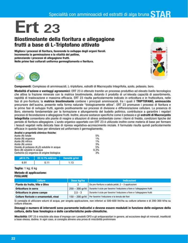 Specialità con amminoacidi ed estratti di alga bruna Ert 23 STAR Biostimolante della fioritura e allegagione frutti a base di L-Triptofano attivato O PU R O DI MA OCY CO NCE N AT CR TR Migliora i processi di fioritura, favorendo lo sviluppo degli organi fiorali. Incrementa la germinazione e la vitalità del polline, potenziando i processi di allegagione frutti. Nelle prime fasi colturali uniforma germogliamento e fioritura. TE GR ne n te STIS I N IF O L IA - Co nt e Componenti: Complesso di amminoacidi, L-triptofano, estratti di Macrocystis Integrifolia, azoto, potassio, boro. Modalità d’azione e vantaggi agronomici: ERT 23 è ottenuto tramite un processo produttivo ad elevato livello tecnologico che attiva la frazione minerale con la matrice biostimolante, dotando il prodotto di un’elevata capacità di assorbimento, rapidità di traslocazione e massima efficacia. ERT 23 risulta particolarmente indicato in orticoltura e in frutticoltura, nelle fasi di pre-fioritura; la matrice biostimolante contiene i principali amminoacidi, tra i quali il TRIPTOFANO, aminoacido precursore dell’auxina, presente nella forma naturale “biologicamente attiva”. ERT 23 promuove i processi di fioritura e le prime fasi di sviluppo frutti, agendo positivamente sui processi di divisione e differenziazione cellulare. La presenza di Boro, elemento fondamentale per la formazione e allungamento del budello pollinico, contribuisce a garantire i regolari processi di fecondazione e allegagione frutti. Inoltre, alcune sostanze specifiche come il potassio e gli estratti di Macrocystis Integrifolia consentono alle piante di reagire a situazioni di stress ambientale come i ritorni di freddo, condizioni tipiche del periodo di fioritura-allegagione. L’azoto organico apportato con ERT 23 è utilizzato inoltre come materia di base per formare i tessuti vegetali nella delicata fase di ripresa vegetativa-accrescimento iniziale. Il formulato risulta quindi particolarmente efficace in questa fase per stimolare ed uniformare il germogliamento. Analisi e proprietà chimico-fisiche: Azoto (N) totale Azoto (N) organico Azoto (N) nitrico Azoto (N) ureico Ossido di potassio (K2O) solubile in acqua Boro (B) solubile in acqua Carbonio (C) organico di origine biologica 5% 1% 1% 3% 5% 0,3% 3% pH 0.1% EC 0.1% mS/cm Densità g/ml 6.91 0.11 1.13 Taglia: 1 kg; 6 kg Metodo di applicazione: FOGLIARE Colture Piante da frutto, Vite e Olivo Dose kg/ha 3 Indicazioni Da pre-fioritura a caduta petali, 2 – 3 applicazioni Orticoltura in serra 250 – 300 gr/hl Durante il ciclo per favorire l’induzione a fiore e l’allegagione frutti Orticoltura in pieno campo Durante il ciclo per favorire l’induzione a fiore e l’allegagione frutti 2,5 - 3 150 – 200 gr/hl Per favorire l’induzione e la tenuta dei fiori Colture floricole e ornamentali, vivai Si consiglia di utilizzare volumi di acqua, per singola applicazione, non inferiori ai 500-600 litri/ha su colture arboree e di 200-300 lt/ha su colture erbacee. Dosaggi e numero di interventi sono puramente indicativi e devono essere modulati in funzione delle esigenze della coltura, della fase fenologica e delle caratteristiche pedo-climatiche. Miscibilità: ERT 23 è miscibile alla dose d’impiego con i prodotti CIFO e gli antiparassitari in genere, ad eccezione degli oli minerali, insetticidi a base oleosa, dodina. In ogni caso, si consiglia almeno una prova di miscibilità preliminare 22