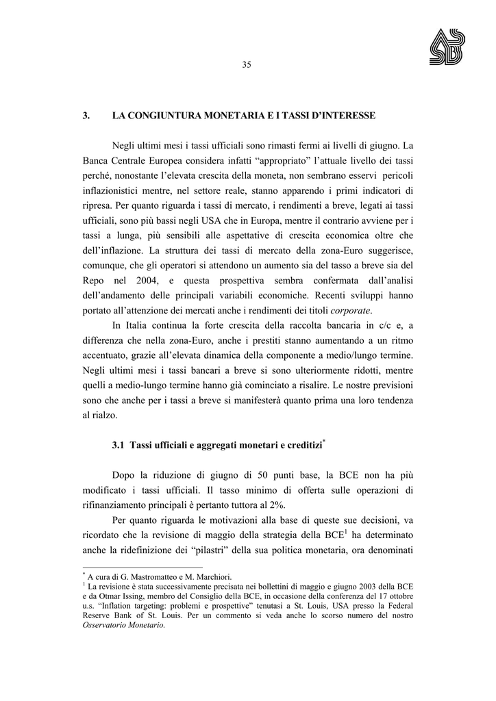35 3. LA CONGIUNTURA MONETARIA E I TASSI D’INTERESSE Negli ultimi mesi i tassi ufficiali sono rimasti fermi ai livelli di giugno. La Banca Centrale Europea considera infatti “appropriato” l’attuale livello dei tassi perché, nonostante l’elevata crescita della moneta, non sembrano esservi pericoli inflazionistici mentre, nel settore reale, stanno apparendo i primi indicatori di ripresa. Per quanto riguarda i tassi di mercato, i rendimenti a breve, legati ai tassi ufficiali, sono più bassi negli USA che in Europa, mentre il contrario avviene per i tassi a lunga, più sensibili alle aspettative di crescita economica oltre che dell’inflazione. La struttura dei tassi di mercato della zona-Euro suggerisce, comunque, che gli operatori si attendono un aumento sia del tasso a breve sia del Repo nel 2004, e questa prospettiva sembra confermata dall’analisi dell’andamento delle principali variabili economiche. Recenti sviluppi hanno portato all’attenzione dei mercati anche i rendimenti dei titoli corporate. In Italia continua la forte crescita della raccolta bancaria in c/c e, a differenza che nella zona-Euro, anche i prestiti stanno aumentando a un ritmo accentuato, grazie all’elevata dinamica della componente a medio/lungo termine. Negli ultimi mesi i tassi bancari a breve si sono ulteriormente ridotti, mentre quelli a medio-lungo termine hanno già cominciato a risalire. Le nostre previsioni sono che anche per i tassi a breve si manifesterà quanto prima una loro tendenza al rialzo. 3.1 Tassi ufficiali e aggregati monetari e creditizi* Dopo la riduzione di giugno di 50 punti base, la BCE non ha più modificato i tassi ufficiali. Il tasso minimo di offerta sulle operazioni di rifinanziamento principali è pertanto tuttora al 2%. Per quanto riguarda le motivazioni alla base di queste sue decisioni, va ricordato che la revisione di maggio della strategia della BCE1 ha determinato anche la ridefinizione dei “pilastri” della sua politica monetaria, ora denominati * A cura di G. Mastromatteo e M. Marchiori. La revisione è stata successivamente precisata nei bollettini di maggio e giugno 2003 della BCE e da Otmar Issing, membro del Consiglio della BCE, in occasione della conferenza del 17 ottobre u.s. “Inflation targeting: problemi e prospettive” tenutasi a St. Louis, USA presso la Federal Reserve Bank of St. Louis. Per un commento si veda anche lo scorso numero del nostro Osservatorio Monetario. 1 36 “analisi economica” ed “analisi monetaria”. Rispetto a prima, la Banca ha aumentato il peso attribuito alle “variabili economiche” (cioè tutte le variabili non monetarie, comprese le sue previsioni e quelle degli enti specialistici), mentre ha ridotto il ruolo delle “variabili monetarie” (moneta e credito), considerate solo come fonte aggiuntiva di informazioni sull’inflazione di lungo periodo. Le variabili economiche. I dati sulla produzione e sul “clima di fiducia” dell’economia sembrano mostrare i primi segnali di una ripresa, e quest’ipotesi risulta confermata anche dalle stime di “consensus” e dalle opinioni dei principali enti di previsione. Recentemente (24 ottobre) il Presidente Duisenberg si è spinto a dichiarare che la crescita del PIL a fine 2004 potrebbe essere prossima al suo livello potenziale del 2,5%, anche se questa previsione (TAB. 3.1) sembra più ottimistica di quelle formulate da altre istituzioni. TAB. 3.1 – Previsioni della BCE e di altre istituzioni Fonte BCE Commissione Europea FMI OCSE Consensus Economics Professional Forecasters Data della previsione Ott. 2003 Ott. 2003 Set. 2003 Giu. 2003 Ago. 2003 Lug. 2003 Inflazione(1) 2003 1,9-2,1 2,1 2,0 2,2 1,9 1,9 2004 1,8-1,9 2,0 1,6 2,0 1,4 1,5 Crescita del PIL in termini reali 2003 2004 0,8-1,0** 2,0-2,5** 0,4 1,8 0,5 1,9 1,0 2,4 0,6 1,7 0,7 1,7 Fonti: BCE, Bollettino economico, vari mesi, 2003; OCSE, Economic Outlook, n. 73; FMI, World Economic Outlook, Settembre 2003; Commissione Europea, Economic forecasts, autunno 2003. Note: (1) Per il FMI e l’OCSE: deflatore dei consumi privati; negli altri casi IAPC. ** Le stime sul PIL della BCE sono state desunte dagli interventi dei principali esponenti della Banca stessa. Secondo la cosiddetta stima rapida dell’Eurostat, a settembre 2003 l’inflazione nell’area dell’Euro sarebbe rimasta invariata al livello del 2,1% di agosto e nella restante parte dell’anno dovrebbe oscillare intorno al 2%. In un orizzonte temporale più lungo, la BCE prevede un’inflazione attestata al di sotto del 2% per il 2004 ed in linea con livelli inferiori al 2% anche nel medio periodo. Questa sua aspettativa si basa sull’ipotesi di una contenuta dinamica salariale, a fronte di un’attesa di graduale ripresa economica, e sull’assenza di forti spinte dai prezzi import. 37 Secondo la BCE rimangono, comunque, ancora delle preoccupazioni inflazionistiche collegate alla presenza, nella maggior parte dei paesi dell’Area, di politiche di bilancio con scostamenti rilevanti rispetto agli obiettivi fissati per il 2003 e, in diversi casi, anche per il 2004; in particolare i casi che preoccupano maggiormente la Banca Centrale sono quelli di Francia e Germania, i due principali paesi dell’Area, che stanno incontrando difficoltà a rispettare le regole definite dal Patto di stabilità2. Proprio in considerazione di tali fatti, la BCE continua ad esortare i singoli governi al rispetto delle regole prefissate, ribadendo la propria convinzione sui positivi effetti in termini di crescita e di clima di fiducia che ne potranno derivare. Inoltre, ancora una volta, viene richiesto ai singoli paesi dell’Unione la realizzazione di riforme volte a superare le rigidità strutturali sia nel mercato del lavoro sia in quello dei beni e servizi. FIG. 3.1 – Variazioni tendenziali della moneta: confronto tra M1 e M3 (dati mensili; periodo gennaio 1999-settembre 2003) 16,0 14,0 variazioni tendenziali % 12,0 10,0 8,0 6,0 4,0 Variazioni % M1 destagionalizzata 2
