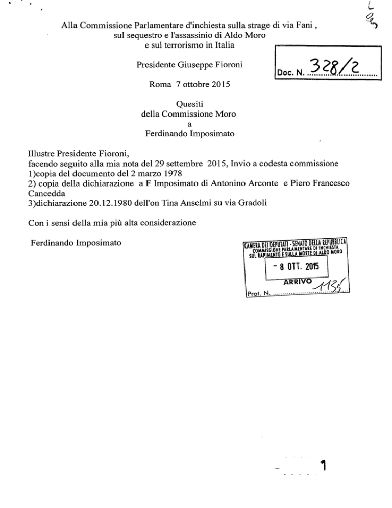 Alla Commissione Parlamentare d'inchiesta sulla strage di via Fani, sul sequestro e l'assassinio di Aldo Moro e sul terrorismo in Italia i Presidente Giuseppe Fioroni Doc. N Roma 7 ottobre 2015 Quesiti della Commissione Moro a Ferdinando Imposimato Illustre Presidente Fioroni, facendo seguito alla mia nota del 29 settembre 2015, Invio a codesta commissione 1) copia del documento del 2 marzo 1978 2) copia della dichiarazione a F Imposimato di Antonino Arconte e Piero Francesco Cancedda 3) dichiarazione 20.12.1980 dell'on Tina Anselmi su via Gradoli Con i sensi della mia più alta considerazione Ferdinando Imposimato 1 R1F. G-219 1) li L L A D1F E S A MINISTERO DIKEZIONK GKNKKA1.K ,.. I I . - l'HIMINAI.r, M1I.ITAUK DKI.I.A MA II I N A OGGETTO: AUTORIZZAZIONE MINISTERIALE RIFERITA A G-219. E' AUTORIZZATO AD OTTENERE INFORMAZIONI DI " 3° - GRADO E PIÙ', SE UTILI ALLA CONDOTTA DI OPERAZIONI DI RICERCA CONTATTO CON GRUPPI DEL TERRORISMO M.O. AL FINE DI OTTENERE COLLABO- RAZIONE E INFORMAZIONI UTILI ALLA LIBERAZIONE DELL'ON. ALDO MORO. Ai (ini dell'autorizzazione — 'f!*erC9 •--j**df' sopia colla la 'loniJolla eli operatori' di »» *'."!j|circ ed ex fuochisti della M«.-..-; '.• : ?, : » M-s final Servizio Macchio* ; J all'Organizzazione Gladio, la suindicata ordinanza dovrà essere eseguita agli ordini e dipendenze di G-216. Si certifico che il latore della ...pr.es.ente.....Macchinista....Nav.ale i*. *• .,x4^.^9.6,.Q3*..l^ in forza classe .1954: diramattudal SIM..M p.res^.Q...J.'Ammiragli3ta...e....pmveni.eo.le. dal... .Ministero .„della...... Difesa I".:.:: Roma, li ...DOCUMENTO A ..DISTRUZIONE IMMEDIATA....- I. .Marzo .1.9.78. /t-. w\D ETTORE GENERALE AUTENTICA DI DOCUMENTO C e r t i f i c o i o s o t t o s c r i t t o d r . P i e r o A n g o t z i , Notaio, i r i O r i s t a no, i s c r i t t o n e l Collegio Notarile dei D i s t r e t t i Riuniti d i Cagliari, Lanusei e O r i s t a n o , che l a p r e s e n t e c o p i a e s e g u i t a con a p p a r e c c h i o f o t o r i p r o d u t t o r e è conforme a l l ' o r i g i n a l e esibitomi d a l signor: - ARCONTE ANTONINO STEFANO, nato ad O r i s t a n o i l 10 f e b b r a i o 1954, r e s i d e n t e a Cabras, v i a Arborea n.13, m a c c h i n i s t a naval e , c o d i c e f i s c a l e RCN NNN 54B10 G113F; d e l l a c u i identità personale i o Notaio sono c e r t o ed è s t a t a da me N o t a i o r i l a s c i a t a p r e v i a ammonizione d e l l o stesso s u l l a responsabilità penale c u i può andare i n c o n t r o i n caso d i e s i b i z i o n e d i a t t o f a l s o o contenente d a t i non più r i s p o n d e n t i a verità. O r i s t a n o , o t t o a p r i l e duemiladue (08.04.2002 All'Ili.mo dr. Ferdinando Imposimato, difensore di fiducia nel processo civile in Appello a Cagliari RG. 668/2013 cron. N. 7460 depositato in cancelleria il 6.12.2013 e di cui Sentenza di primo grado n. 307/2013 del Tribunale di Oristano. Oggetto: Dichiarazione di Antonino Arconte, nato il 10.02.1954 a Oristano e residente a Cabras in Via Arborea 17 e Piero Francesco Cancedda, nato a San Gavino Monreale il 9.12.1951 e ivi residente in Vico Trento 9. Cabras 27 Maggio I sottoscritti ribadiscono quanto già dichiarato e depositato agli atti dei procedimenti in oggetto e, sul punto sottrazione commessa dalla RAI TV di: campioni da sottoporre a perizia, videoregistrazione delle fasi del prelievo e dei documenti in data 2 marzo 1978 e 4 settembre 1974, tutti costituenti prove fondamentali e inconfutabili della verità dei fatti e dell'effettivo stato di servizio di Antonino Arconte e Piero Cancedda negli anni di cui si tratta; in proposito si precisa quanto segue e le prove di questo sono depositate agli atti del procedimento Arconte/RAI TV e riscontro dell'Ufficiale Giudiziario in data 16 Gennaio 2015 a Roma. Dopo aver ricevuto i campioni dei documenti da sottoporre a perizia scientifica, (gli stessi erano stati già autenticati da notaio e periziati a New York nel Maggio 1998, che ne aveva attestato l'autenticità), come da accordi con gli inviati della RAI 3, Direttore dr. Di Bella e di Liberazione, Direttore Sandro Curzi e Famiglia Cristiana, alla presenza di tutti i testimoni che lo hanno confermato sotto giuramento nel processo civile per violazione degli accordi contrattuali e appropriazione indebita, si era saputo per via telefonica da Roberta Serdoz, Giuseppe Dagata, Luciano Scalettari e Barbara Carazzolo che il perito aveva confermato che Carta e inchiostri dei documenti periziati erano conformi ai documenti di paragone coevi e sicuramente provenienti dal Ministero della Difesa Marina. A questo punto, secondo gli accordi, la notizia doveva essere resa nella trasmissione RAI 3 Primo Piano intitolata "VERO o FALSO" e il materiale ricevuto doveva essere restituito al sottoscritto A. Arconte, ma niente di questo è avvenuto. La trasmissione fu truccata, lasciando dubbi dove non ce n'era alcuno e il materiale non fu restituito, tantomeno la copia conforme della relazione peritale e la videointervista integrale della perita che confermava la autenticità del materiale periziato mediante acidi, reagenti e ingrandimenti che non lasciavano adito a dubbi sull'autenticità degli stessi. Ci informò che la perita aveva anche detto che sarebbe stato utile poter analizzare tutti i documenti e non solo i campioni prelevati dagli stessi per rendere i risultati peritali incontestabili e riprese a insistere per averli, soprattutto quello in data 2 marzo 1978. Roberta Serdoz ci era sembrata in buona fede e si era anche commossa quando gli mostrammo l'intero archivio di Gladio custodito nella tomba Punica dove, insieme a Giuseppe Dagata, li avevano potuti veriftcare-prima di avere l'incarico dai loro rispettivi direttori di venire con una Troupe televisiva per le riprese e le interviste. Ci consultammo con Piero Cancedda e decidemmo di poterci fidare, in fondo i risultati della perizia dimostravano che erano in buona fede e non intenzionati a