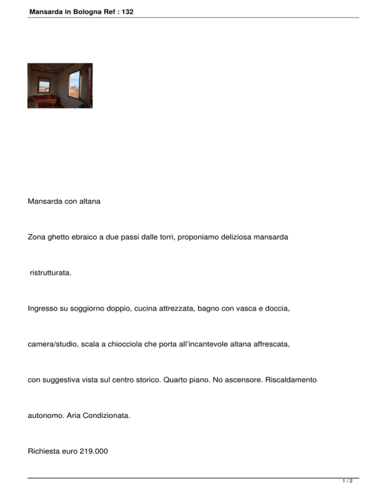 Mansarda in Bologna Ref : 132 Mansarda con altana Zona ghetto ebraico a due passi dalle torri, proponiamo deliziosa mansarda ristrutturata. Ingresso su soggiorno doppio, cucina attrezzata, bagno con vasca e doccia, camera/studio, scala a chiocciola che porta all’incantevole altana affrescata, con suggestiva vista sul centro storico. Quarto piano. No ascensore. Riscaldamento autonomo. Aria Condizionata. Richiesta euro 219.000 1/2 Mansarda in Bologna Ref : 132 Selling price : 219 000 € Charges : Consult us Fees : Consult us Condition : Ottimo Living space : 60 m² Number of rooms : 1 Number of floors : 4 Number of bathrooms : 1 Address : Ghetto Ebraico bologna, BOLOGNA Area : emilia romagna http://www.arsimmobiliare.it/index.php?option=com_jea&view=properties&Itemid=1&id=313 2/2