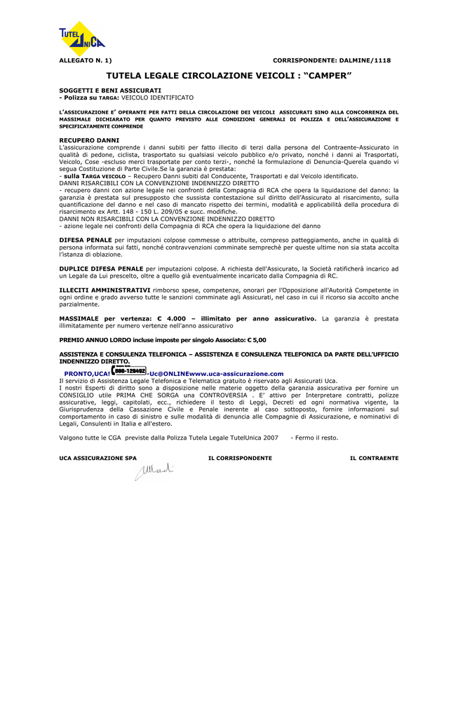 ALLEGATO N. 1) CORRISPONDENTE: DALMINE/1118 TUTELA LEGALE CIRCOLAZIONE VEICOLI : “CAMPER” SOGGETTI E BENI ASSICURATI - Polizza su TARGA: VEICOLO IDENTIFICATO L’ASSICURAZIONE E’ OPERANTE PER FATTI DELLA CIRCOLAZIONE DEI VEICOLI ASSICURATI SINO ALLA CONCORRENZA DEL MASSIMALE DICHIARATO PER QUANTO PREVISTO ALLE CONDIZIONI GENERALI DI POLIZZA E DELL’ASSICURAZIONE E SPECIFICATAMENTE COMPRENDE RECUPERO DANNI L’assicurazione comprende i danni subiti per fatto illecito di terzi dalla persona del Contraente-Assicurato in qualità di pedone, ciclista, trasportato su qualsiasi veicolo pubblico e/o privato, nonché i danni ai Trasportati, Veicolo, Cose -escluso merci trasportate per conto terzi-, nonché la formulazione di Denuncia-Querela quando vi segua Costituzione di Parte Civile.Se la garanzia è prestata: - sulla TARGA VEICOLO – Recupero Danni subiti dal Conducente, Trasportati e dal Veicolo identificato. DANNI RISARCIBILI CON LA CONVENZIONE INDENNIZZO DIRETTO - recupero danni con azione legale nei confronti della Compagnia di RCA che opera la liquidazione del danno: la garanzia è prestata sul presupposto che sussista contestazione sul diritto dell’Assicurato al risarcimento, sulla quantificazione del danno e nel caso di mancato rispetto dei termini, modalità e applicabilità della procedura di risarcimento ex Artt. 148 - 150 L. 209/05 e succ. modifiche. DANNI NON RISARCIBILI CON LA CONVENZIONE INDENNIZZO DIRETTO - azione legale nei confronti della Compagnia di RCA che opera la liquidazione del danno DIFESA PENALE per imputazioni colpose commesse o attribuite, compreso patteggiamento, anche in qualità di persona informata sui fatti, nonché contravvenzioni comminate semprechè per queste ultime non sia stata accolta l’istanza di oblazione. DUPLICE DIFESA PENALE per imputazioni colpose. A richiesta dell'Assicurato, la Società ratificherà incarico ad un Legale da Lui prescelto, oltre a quello già eventualmente incaricato dalla Compagnia di RC. ILLECITI AMMINISTRATIVI rimborso spese, competenze, onorari per l’Opposizione all'Autorità Competente in ogni ordine e grado avverso tutte le sanzioni comminate agli Assicurati, nel caso in cui il ricorso sia accolto anche parzialmente. MASSIMALE per vertenza: € 4.000 – illimitato per anno assicurativo. La garanzia è prestata illimitatamente per numero vertenze nell'anno assicurativo PREMIO ANNUO LORDO incluse imposte per singolo Associato: € 5,00 ASSISTENZA E CONSULENZA TELEFONICA – ASSISTENZA E CONSULENZA TELEFONICA DA PARTE DELL’UFFICIO INDENNIZZO DIRETTO. PRONTO,UCA! [email protected] Il servizio di Assistenza Legale Telefonica e Telematica gratuito è riservato agli Assicurati Uca. I nostri Esperti di diritto sono a disposizione nelle materie oggetto della garanzia assicurativa per fornire un CONSIGLIO utile PRIMA CHE SORGA una CONTROVERSIA . E’ attivo per Interpretare contratti, polizze assicurative, leggi, capitolati, ecc., richiedere il testo di Leggi, Decreti ed ogni normativa vigente, la Giurisprudenza della Cassazione Civile e Penale inerente al caso sottoposto, fornire informazioni sul comportamento in caso di sinistro e sulle modalità di denuncia alle Compagnie di Assicurazione, e nominativi di Legali, Consulenti in Italia e all'estero. Valgono tutte le CGA previste dalla Polizza Tutela Legale TutelUnica 2007 UCA ASSICURAZIONE SPA IL CORRISPONDENTE - Fermo il resto. IL CONTRAENTE Assicurazione Tutela legale circolazione Camper: Precisiamo inoltre le garanzie prestate oggetto dell’assicurazione: - Spese ,competenze ed onorari dei professionisti liberamente scelti dall’assicurato ex art. VII con studio nel distretto di corte d’appello competente: Legale Perito Perito di Parte Arbitro di parte o terzo Arbitro Informatore (per la ricerca di prove a difesa) Interprete (per sinistri avvenuti all’estero) Traduttore per gli atti di causa Spese di arbitrato e azione legale nei confronti di imprese assicuratrici (art.VII CGP) Spese legali per procedimenti speciali e di urgenza (libro IV CPC) Spese di registrazione atti giudiziari Spese di soccombenza liquidate giuridicamente Spese liquidate a favore delle parti civili(costituite contro l’assicurato nel giudizio penale (art. 541 CPP) Spese di giustizia penale (art.535 CPP I° comma). RECUPERO DANNI (VALIDITA’ MONDO INTERO) - danni subiti dal camper (i danni subiti dal veicolo) - danni subiti dai trasportati (infortuni subiti dai trasportati) - danni subiti dal conducente (infortuni subiti dal conducente) - formulazione di denuncia-querela (al fine di ottenere il giusto risarcimento) - per il tesserato/assicurato comprende inoltre danni subiti in qualità di pedone,ciclista o trasportato su qualsiasi mezzo pubblico o privato (infortuni subiti in occasioni diverse da passeggero del camper) - recupero danni con azione legale nei confronti della propria compagnia che opera la liquidazione se sussiste contestazione (indennizzo diretto) - recupero danni con azione legale nei confronti della compagnia di controparte (danno non risarcibile con indennizzo diretto) DIFESA PENALE - per imputazioni colpose commesse o attribuite compreso patteggiamento (quando la tua compagnia rc auto non interviene) DUPLICE DIFESA PENALE - per imputazioni colpose,su richiesta l’assicurato potrà dare l’incarico ad un legale di propria fiducia oltre a quello già eventualmente incaricato dalla compagnia di Rc Auto. ILLECITI AMMINISTRATIVI - rimborso spese,competenze onorari per l’opposizione alle autorità verso sanzioni e multe nel caso in cui il ricorso venga accolta anche parzialmente. PRONTO UCA Assistenza legale telefonica e telematica gratuita riservata agli assicurati UCA : Esperti a disposizione per fornire un consiglio prima che sorga una controversia: - interpretazione di contratti, - polizze assicurative, - leggi, -capitolati, -decreti e normative - informazioni in caso di sinistro, -modalità di denuncia -nominativi di legali in Italia e all’estero. MASSIMALE eu