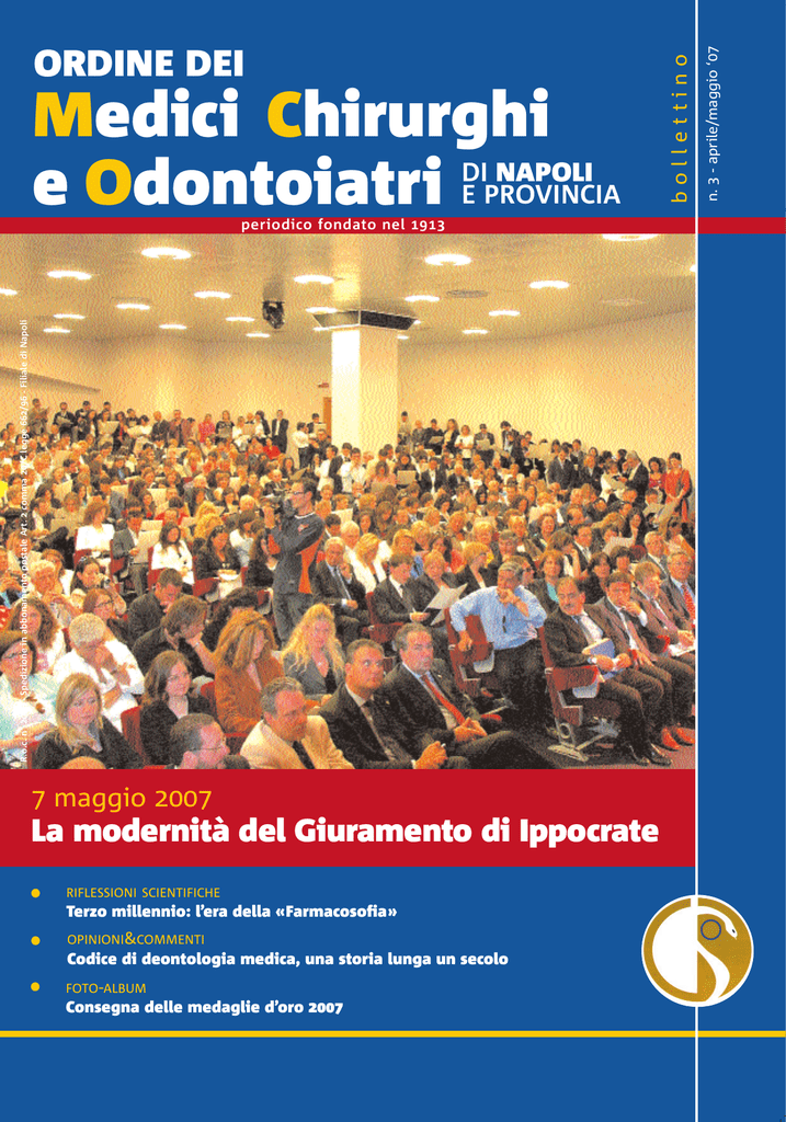 R.o.c. n° 2008 - Spedizione in abbonamento postale Art. 2 comma 20/C legge 662/96 - Filiale di Napoli periodico fondato nel 1913 7 maggio 2007 La modernità del Giuramento di Ippocrate RIFLESSIONI SCIENTIFICHE Terzo millennio: l’era della «Farmacosofia» OPINIONI&COMMENTI Codice di deontologia medica, una storia lunga un secolo FOTO-ALBUM Consegna delle medaglie d’oro 2007 n. 3 - aprile/maggio ‘07 Medici Chirurghi DI NAPOLI e Odontoiatri E PROVINCIA bollettino ORDINE DEI editoriale editoriale GIUSEPPE SCALERA Etica e modernità nel segno di Ippocrate I n una società frastagliata e confusa il Giuramento di Ippocrate disegna ancora le sue regole chiare, impermeabili al tempo. Indirizzi precisi che chiedono ad ogni medico di impegnarsi per il rispetto assoluto della vita umana e della sua sacralità. I punti cardinali restano quattro: una concezione unitaria ed integrale dell'essere umano, un preciso rapporto tra etica personale ed etica professionale, un profondo rispetto verso il divenire della natura, un modello partecipativo dell'esercizio dell'arte medica. Fattori, valori, presupposti che conservano una straordinaria attualità, anche a distanza di migliaia di anni. Molto si è scritto, in questi ultimi decenni, del rapporto legato al contenuto del Giuramento di Ippocrate e a quello della morale cristiana. Una continuità che si muove nel comune impegno della promozione e della difesa della vita dal suo concepimento al suo naturale tramonto. Non vogliamo stimolare ulteriori dibattiti anche per il profondo rispetto che nutriamo verso le opinioni di tutti. Ma ci sembra, comunque, utile ricordare come lo stesso Giovanni Paolo II, negli anni scorsi, nell'enciclica Evangelium vitae, abbia comunque riproposto “il valore antico e sempre attuale del Giuramento”, intravedendo nel testo ippocratico l'insegnamento di Cristo. In effetti, in un punto determinante il pensiero cristiano ed ippocratico coincidono quasi perfettamente. L'esclusione di ogni possibilità di discriminazione all'interno della nozione di vita. Per Ippocrate la difesa e la promozione della vita sono criterio ed indirizzo nell'esercizio della professione, metro della sua dignità, dell'onestà con la quale esercita il suo mandato. Non ci sono deroghe, nè eccezioni. Ogni concessione avrebbe contribuito a rendere fragile e vulnerabile il suo impianto. E il Giuramento si intreccia in una visione religiosa della vita. Soprattutto, quando il medico di Cos si richiama alle divinità del pantheon greco o quando lascia intravedere una ricompensa di natura morale, capace di andare ben al di là della semplice dimensione economica. Esiste poi un'ultima, straordinaria verità. In un mondo che si dilania in visioni divergenti di natura etica, sociale, politica, economica, filosofica, il servizio verso chi soffre è un unico, comune cemento che non conosce confini, limiti, barriere. Risponde alla più avvertita delle aspirazioni umane, alla salvaguardia della salute, alla promozione, alla difesa della vita. E non sarà mai anacronistica ma vivrà di un'attualità che non vuole essere figlia del suo tempo. news news ERRORI IN MEDICINA: BASTA CON LA CACCIA ALLE STREGHE «Scaricare solo sul singolo la responsabilità degli errori in medicina, invece di identificare gli elementi deboli del sistema, è una delle attività più dannose delle strutture di cura del mondo occidentale»: così lo psicologo James Reason è intervenuto nel corso della giornata di studi «Errore umano, professione medica, responsabilità» organizzata dalla FNOMCeO a Cagliari. «L’errore in medicina - ha detto il presidente della FNOMCeO Amedeo Bianco - è spesso abbinato per comodità mediatica alla scottante immagine della malasanità. Invece di inutili cacce alle streghe, è necessario far emergere anche i cosiddetti errori latenti, appartenenti alla gestione organizzativa del processo clinicoassistenziale». MEDICI CONTAMINATI: LA RIVALUTAZIONE DELLE RENDITE Rischio professionale. Utile ribadire il contenuto del decreto dello scorso 4 gennaio sulla «Rivalutazione delle prestazioni economiche dell’INAIL in favore dei medici colpiti dall’azione dei raggi X e delle sostanze radioattive, con decorrenza dal 1° gennaio 2003. Riliquidazione delle stesse prestazioni per gli anni 2003-2004-2005-2006». Il decreto è stato emanato dal ministro del Lavoro in attuazione a precedenti norme che prevedono la riliquidazione e la rivalutazione annuale delle rendite dei camici bianchi colpiti da malattie e lesioni causate dalla radioattività. Di conseguenza le retribuzioni annue da assumersi a base per la liquidazione delle prestazioni economiche a favore dei medici esposti a sostanze radioattive (e dei loro eredi) sono le seguenti: dal 1° gennaio 2003 euro 45.293,32 - dal 1° luglio 2004 euro 46.425,65 - dal 1° gennaio 2005 euro 50.280,11 - dal 1° luglio 2006 euro 51.134,87. MALPRACTICE, LA DENUNCIA DEL TRIBUNALE PER I DIRITTI DEL MALATO Capitolo scottante quello aperto dal «Tribunale per i diritti del malato» nel rapporto «Pit Salute», inoltrato al ministero della Salute: il Tribunale evidenzia come gran parte delle lamentele giunte dall’utenza sanitaria stigmatizza il comportamento inadeguato tenuto da molti camici bianchi nei confronti dei pazienti, parlando specificamente di maleducazione degli operatori sanitari. Sulla notizia ha preso posizione anche l’Ordine dei Medici di Napoli. Umberto Zito, direttore dell’Ordine, ha sottolineato che, in materia di «malpractice», le condotte censurabili nella realtà sanitaria napoletana sono statisticamente irrilevanti. «In ogni caso l’Ordine dei medici partenopei - ha puntualizzato Zito mantiene alta la vigilanza sul fenomeno, intervenendo tempestivamente con i propri organi disciplinari». MIR 133, LA MOLECOLA DEI CUORI «INFRANTI» Potrebbe essere una molecola la soluzione al cuore che fa tilt. Proprio da una molecola «naturale», ovvero prodotta dal nostro stesso Dna, potrebbe arrivare, infatt