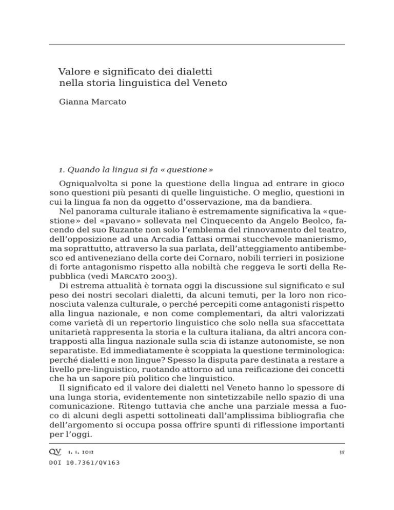 Valore e significato dei dialetti nella storia linguistica del Veneto Gianna Marcato 1. Quando la lingua si fa «questione» Ogniqualvolta si pone la questione della lingua ad entrare in gioco sono questioni più pesanti di quelle linguistiche. O meglio, questioni in cui la lingua fa non da oggetto d’osservazione, ma da bandiera. Nel panorama culturale italiano è estremamente significativa la «questione» del «pavano» sollevata nel Cinquecento da Angelo Beolco, facendo del suo Ruzante non solo l’emblema del rinnovamento del teatro, dell’opposizione ad una Arcadia fattasi ormai stucchevole manierismo, ma soprattutto, attraverso la sua parlata, dell’atteggiamento antibembesco ed antiveneziano della corte dei Cornaro, nobili terrieri in posizione di forte antagonismo rispetto alla nobiltà che reggeva le sorti della Repubblica (vedi Marcato 2003). Di estrema attualità è tornata oggi la discussione sul significato e sul peso dei nostri secolari dialetti, da alcuni temuti, per la loro non riconosciuta valenza culturale, o perché percepiti come antagonisti rispetto alla lingua nazionale, e non come complementari, da altri valorizzati come varietà di un repertorio linguistico che solo nella sua sfaccettata unitarietà rappresenta la storia e la cultura italiana, da altri ancora contrapposti alla lingua nazionale sulla scia di istanze autonomiste, se non separatiste. Ed immediatamente è scoppiata la questione terminologica: perché dialetti e non lingue? Spesso la disputa pare destinata a restare a livello pre-linguistico, ruotando attorno ad una reificazione dei concetti che ha un sapore più politico che linguistico. Il significato ed il valore dei dialetti nel Veneto hanno lo spessore di una lunga storia, evidentemente non sintetizzabile nello spazio di una comunicazione. Ritengo tuttavia che anche una parziale messa a fuoco di alcuni degli aspetti sottolineati dall’amplissima bibliografia che dell’argomento si occupa possa offrire spunti di riflessione importanti per l’oggi. 1. 1. 2012 D OI 10.7 3 61 /Q V 16 3 35 gi a n n a m a rcato 2.Che cosa si intende per «veneto»? 2.1.Antiche attestazioni di varietà territorialmente significative Se guardiamo alla storia linguistica del Veneto notiamo la presenza di significative variazioni. Lo notiamo in diacronia, confrontando, ad esempio, i testi trecenteschi di Lio Mazor (1312-1319)1 con le lettere del mercante veneziano Andrea Berengo, risalenti al Cinquecento.2 Lo notiamo in sincronia, confrontando, nel Cinquecento, i testi di Andrea Calmo,3 veneziano, con quelli del pavano Ruzante e del bellunese Cavassico,4 in grado di caratterizzare tre importanti subaree regionali. In definitiva, lo notiamo lungo tutto l’arco di tempo che congiunge le origini della Repubblica ai nostri giorni, tanto che, se parliamo dal punto di vista linguistico di «veneto», non possiamo che riferirci ad un’ampia gamma di sistemi aggregabili in unità solo rispettando le specifiche differenze di struttura e di ritmo, come ha ben dimostrato G.B. Pellegrini già a proposito dei dialetti veneti antichi, come ben sintetizza A. Zamboni nella monografia al Veneto dedicata.5 2.2.Veneto, veneziano e toscano nel dizionario ottocentesco di Giuseppe Boerio Il Dizionario del dialetto veneziano di Giuseppe Boerio (Boerio 1829) ci rivela il repertorio linguistico di una grande città, eterogenea, ricca di contatti, di scambi commerciali, con un proprio consistente bagaglio normativo, giuridico e burocratico, per secoli mediato dalla lingua d’uso ed assimilato anche dal linguaggio comune. Ricco inventario di forme, è pur sempre l’attestazione di un uso parlato, indubbiamente stratificato socialmente e ricco di varianti spesso di matrice dotta, di sinonimi, di rimandi all’italiano, di neologismi di ogni tipo, ma non certo codificato e normato dall’esterno. L’attenzione del dizionario per le varianti territoriali rende evidente come i confini reali e simbolici che circoscrivono Venezia, città d’acqua, 1. «Marin hoster çurà test. Sora la predita briga: lo qual dis: e’ digo ch’ e’ era en leto et audii romor la da casa de Blasi; e così levai-e’ da leto et fuj sula porta mia et viti che Pero da Sol se ustionava cum Antolin Dauto et Perinça» (in Lio Mazor, p. 27, rr. 55-60). 2. «Quanto ali aghi ve ò intexo… ser poltron, voi dite aver mandato a Milan a tuor diti aghi: a mi pana che sa da fumo» (in Berengo, Lettere, n. 99). 3. «E me arecordo… che tal dì de menuagie l’impiniva de regalie un gran carnier e adesso. In luogo de sturioni, se magna apasto masenete›› (in Calmo, Lettere, i, p. 19). 4. «Puore noi, che farone | mo che l’è serà le trate? […] Da sera e da matina | magneron le ravize | m’avis che le plize | rosegaron» (in Cavassico, Rime, Oda 1508). 5. Vedi Zamboni 1974; Pellegrini 1977; Marcato 1983. 36 qua der n i v en et i 1. 1. 2012 va lor e e sign ificato dei di a let t i siano leggibili anche nei confini linguistici interni al territorio veneto. Città per antonomasia, tanto da poter considerare «campagna» tutto quanto si colloca al di là della sua laguna, Venezia, tanto isolata dal retroterra quanto prestigioso e potente punto di irradiazione di modelli, nel suo rapporto con l’entroterra favorisce un policentrismo squilibrato, destinato a ripercuotersi sull’assetto anche linguistico delle diverse aree e subaree regionali, che pur attorno a lei gravitano, in una interessante composita unità di paesaggi, di culture, di lingua. Non ci sorprende che Boerio, raccogliendo il comune sentire, distingua il «vero veneziano» da tutti gli altri. O, per meglio dire, il Venessian nato e spuà, o, «in via scherzevole», Venezianazzo, riconosciuto per il suo modo di fare, e soprattutto per la sua abitudine di parlare «il solo dialetto usato nella sua patria».6 Tutti gli altri sono semplicemente Veneti, un tempo sudditi di Venezia, poi semplicemente, col mutar della storia, Provinciali. venezian da altri dett