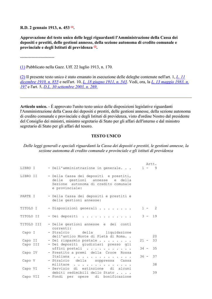 R.D. 2 gennaio 1913, n. 453 (1). Approvazione del testo unico delle leggi riguardanti l'Amministrazione della Cassa dei depositi e prestiti, delle gestioni annesse, della sezione autonoma di credito comunale e provinciale e degli Istituti di previdenza (2). -----------------------(1) Pubblicato nella Gazz. Uff. 22 luglio 1913, n. 170. (2) Il presente testo unico è stato emanato in esecuzione delle deleghe contenute nell'art. 1, L. 11 dicembre 1910, n. 855 e nell'art. 10, L. 18 giugno 1911, n. 543. Vedi, ora, la L. 13 maggio 1983, n. 197 e l'art. 5, D.L. 30 settembre 2003, n. 269. Articolo unico. - È approvato l'unito testo unico delle disposizioni legislative riguardanti l'Amministrazione della Cassa dei depositi e prestiti, delle gestioni annesse, della sezione autonoma di credito comunale e provinciale e degli Istituti di previdenza, visto d'ordine Nostro dal presidente del Consiglio dei ministri, ministro segretario di Stato per gli affari dell'interno e dal ministro segretario di Stato per gli affari del tesoro. TESTO UNICO Delle leggi generali e speciali riguardanti la Cassa dei depositi e prestiti, le gestioni annesse, la sezione autonoma di credito comunale e provinciale e gli istituti di previdenza Artt. 1 9 LIBRO I - Dell'amministrazione in generale. . . LIBRO II - Della Cassa dei depositi e prestiti, delle gestioni annesse e della Sezione autonoma di credito comunale e provinciale: PARTE I - Della Cassa dei depositi e prestiti e delle gestioni annesse: TITOLO I - Disposizioni generali . . . . . . . . 1 - 2 TITOLO II - Dei depositi 3 - 19 TITOLO III - Delle gestioni annesse e dei conti correnti: - Stralcio della liquidazione dell'antico Monte di Pietà di Roma. . - Del risparmio postale . . . . . . . . - Dei depositi giudiziari presso gli uffici postali . . . . . . . . . . . - Prestito a premi della Croce Rossa Italiana . . . . . . . . . . . . . . - Stralcio della soppressa Cassa militare . . . . . . . . . . . . . . - Servizio di estinzione di alcuni debiti redimibili dello Stato . . . . - Fondi per opere di bonificazione 21 - 20 33 34 - 35 36 - 37 Capo I Capo II Capo III Capo IV Capo V Capo VI Capo VII . . . . . . . . . . . . 38 39 delle paludi e dei terreni paludosi . - Fondo per l'emigrazione . . . . . . . - Fondo di ammortamento del consolidato 3,50 per cento emesso per conversione di titoli di debiti redimibili. . . . Capo X - Prestito lotteria a favore della Cassa nazionale di previdenza per l'invalidità e la vecchiaia degli operai e della Società «Dante Alighieri». . . . . . . . . . . . . . Capo XI - Fondi degli Istituti di prevvidenza amministrati dalla Direzione generale degl'Istituti stessi . . . . . . . . Capo XII - Fondo speciale per gli infortuni degli operai sul lavoro . . . . . . . Capo XIII - Servizio di cassa e custodia dei valori della Cassa nazionale di previdenza per la invalidità e per la vecchiaia degli operai. . . . . . . . Capo XIV - Fondo destinato al trattamento di riposo del personale delle scuole industriali e commerciali . . . . . . Capo XV - Fondo per l'acquisto di cose mobili ed immobili di carattere storico, archeologico o artistico . . . . . . Capo XVI - Fondo di riserva per le epizoozie . . Capo XVII - Conto corrente con la Sezione autonoma di credito comunale e provinciale . . . . . . . . . . . . . Capo XVIII - Fondi di garanzia per il credito agli impiegati ed agli operai dello Stato ed al personale dipendente dalla amministrazione delle Ferrovie dello Stato . . . . . . . . . . . . . . . . Capo XIX - Conto delle somme versate dallo Stato a favore delle province di Cuneo, Napoli e Torino per la ritardata attivazione del nuovo catasto . . . . Capo XX - Fondi per i tratturi del Tavoliere di Puglia . . . . . . . . . . . . . . . Capo XXI - Fondi per le pensioni ed i sussidi al personale delle Ferrovie dello Stato Capo XXII - Conto corrente per i fondi disponibili in bilancio su quelli iscritti a favore della Università di Messina. . Capo XXIIII - Azienda speciale del demanio forestale di Stato . . . . . . . . . . . . . Capo XXIV - Quote individuali di pensione spettante al personale licenziato della Navigazione generale italiana . . . . Capo XXV - Cassa di colonizzazione per l'Agro romano . . . . . . . . . . . . . . . Capo XXVI - Anticipazioni alla Cassa dei depositi e prestiti contro deposito dei titoli 40 - Capo VIII Capo IX TITOLO IV Capo I Capo II Sez. I § - Dei prestiti e degli altri impieghi delle somme disponibili: - Degli impieghi in generale . . . . . - Dei prestiti a comuni, province e consorzi: - Disposizioni generali in materia di prestiti: I - Mutuatari, oggetto dei prestiti e 41 42 43 44 - 45 46 47 48 49 50 - 52 53 54 55 - 56 57 58 59 - 61 62 63 64 65 - 66 67 68 - 71 Sez. Capo Sez. Sez. Sez. Sez. Sez. saggio d'interesse . . . . . . . . . § II - Concessione dei prestiti . . . . . . § III - Garanzia . . . . . . . . . . . . . . § IV - Somministrazione dei prestiti . . . . § V - Modo e periodo di ammortamento . . . § VI - Trasformazione di prestiti . . . . . § VII - Insequestrabilità e intransigibilità dei prestiti . . . . . . . . . . . . II - Disposizioni riguardanti prestiti per determinati scopi: § I - Per assunzione diretta dei pubblici servizi da parte dei Comuni . . . . . § II - Per case popolari od economiche . . . § III - Per edifici scolastici: Scuole elementare, secondarie e normali . . . . . . . . . . . . . . . Scuole agrarie. . . . . . . . . . . . Scuole forestali . . . . . . . . . . Scuole professionali . . . . . . . . § IV - Per opere riguardanti la pubblica igiene: Disposizioni generali . . . . . . . . Disposizioni speciali . . . . . . . . § V - Per opere stradali e per opere nei porti di IV classe: Strade di accesso alle stazioni ferroviarie e ai porti. . . . . . . . Opere nei porti di IV classe . . . . Costruzione e ricostruzione delle strade di allacciamento per i comuni isolati . . . . . . . . . . . . . . . § VI - Provvedimenti riguardanti i danni causati da infortuni straordinari: Prestiti per so