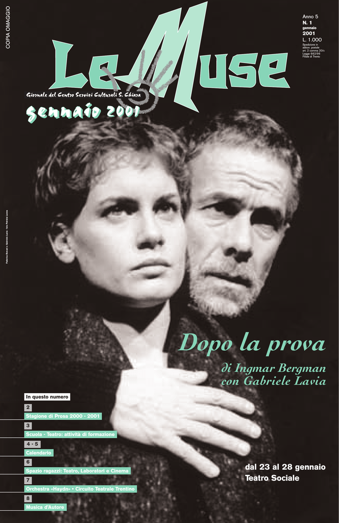 COPIA OMAGGIO Anno 5 N. 1 gennaio 2001 L. 1.000 Spedizione in abbon. postale art. 2 comma 20/c Legge 662/96 Filiale di Trento Giornale del Centro Servizi Culturali S. Chiara Federica Bonani e Gabriele Lavia - foto Patrizia Lanna g e nn aio 2 0 0 1 Dopo la prova di Ingmar Bergman con Gabriele Lavia In questo numero 2 Stagione di Prosa 2000 - 2001 3 Scuola - Teatro: attività di formazione 4-5 Calendario 6 Spazio ragazzi: Teatro, Laboratori e Cinema 7 Orchestra «Haydn» • Circuito Teatrale Trentino 8 Musica d’Autore dal 23 al 28 gennaio Teatro Sociale Teatro Sociale La Stagione martedì 9 gennaio ore 20.30 mercoledì 10 gennaio ore 20.30 A giovedì 11 gennaio ore 20.30 B venerdì 12 gennaio ore 20.30 C sabato 13 gennaio ore 20.30 D domenica 14 gennaio ore 16.00 3•13•33 e Salieri entertainment Taxi a due piazze di Ray Cooney versione italiana di Jaja Fiastri regia di Gigi Proietti con Gianluca Guidi, Maria Laura Baccarini e Corinne Bonuglia note di regia Stagione di Prosa N on amo le catalogazioni, gli stereotipi, i “cliché” che si appiccicano alle persone “condannandole” a dover seguire tutta la vita la stessa linea d’azione che, magari in passato, ha portato buoni risultati. Dopo il successo di “Stanno suonando la nostra canzone” ho chiesto a Maria Laura e Gianluca di tentare un “qualcosa” di diverso, dove il divertimento dell’ “essere attore” sposasse anche l’apprendimento di una recitazione diversa, o comunque, non similare alla precedente avventura. Entrambi erano d’accordo. Questo è comunque un viaggio che non si compie a breve giro di vite. Ha bisogno di una gestazione e maturazione che consentano di arrivare un giorno ad affrontare scelte a 360°. Togliere le canzoni e la musica, dove i miei due giovani attori si sentivano comunque protetti, è stato il primo passo, difficile, ma importante. Affrontare una commedia di prosa pura, senza interruzioni (anche se nobili), richiede comunque una concentrazione “diversa”. Bisognava altresì soddisfare il pubblico, incontrare il gradimento dei distributori teatrali e, perché no, accontentare anche noi stessi… La scelta è allora ricaduta su una “farsa”. Questo genere di teatro, a volte screditato, offre l’opportunità di confrontarsi con ritmi e tempi molto più veloci rispetto ad una commedia. Quale sia il confine tra i due lo spiega perfettamente l’autore di “Taxi a due piazze”, Ray Cooney: «… la differenza tra un uomo che scopre la propria mo- “Taxi a due piazze” di Ray Cooney Teatro Sociale La Stagione martedì 23 gennaio ore 20.30 mercoledì 24 gennaio ore 20.30 A giovedì 25 gennaio ore 20.30 B venerdì 26 gennaio ore 20.30 C sabato 27 gennaio ore 20.30 D domenica 28 gennaio ore 16.00 Compagnia Lavia e Teatro Stabile di Genova Dopo la prova di Ingmar Bergman traduzione di Chiara De Marchi regia e adattamento di Gabriele Lavia costumi di Guido Fiorato, musiche di Andrea Nicolini con Gabriele Lavia, Raffaella Azim, Federica Bonani glie a letto con il suo migliore amico all’interno di una tragedia o di una farsa sta solo nella reazione del pubblico…». La farsa richiede una recitazione asciutta, “vera”. L’eccentricità non risiede nei personaggi bensì nelle situazioni che essi vivono. Così la nostra commedia si pone al pubblico come esempio perfetto del “genere”. Magistralmente costruita in ogni sua sfaccettatura, “Taxi a due piazze”, rende onore alla sua natura drammaturgica e a chi la recita. Nella migliore tradizione inglese (da Aykbourn a Orton a Frayn) offre un grande e “leggero” divertimento. Mi auguro di riuscire ad allietare il nostro pubblico… Se questo accadrà ne saremo felici e il nostro “viaggio” continuerà… Gigi Proietti “Dopo la prova” di Ingmar Bergman Direttore responsabile Luigi Mattei In redazione Alessandro Mosna Sabrina Mottes Presidente Carlo Fait Vicepresidente Grazia Cattani Consiglio di Amministrazione Adolfo de Bertolini Lia De Finis Giuseppe Endrizzi Renzo Fracalossi Carmine Ragozzino Direttore Franco Oss Noser Vicedirettore Marisa Detassis Revisori dei conti Diego Ferretti Renzo Sartori Mario Zambotti Informazioni e segreteria tel. 0461/986488 fax 0461/231044 (8.30 -13.00 14.00 -18.30) e-mail: [email protected] Biglietteria del teatro tel. 0461/239917 dalle 10.00 alle 19.00 dal lunedì al sabato Numero verde: 800 - 013952 aut. del Tribunale di Trento n. 945 R. st. del 25 febbraio 1997 Realizzazione Publistampa Arti grafiche Pergine Valsugana Le Muse 2 gennaio 2001 foto Patrizia Lanna Redazione e amministrazione Centro Servizi Culturali S. Chiara Via S. Croce 67, 38100 Trento U n grande regista si avvia verso la sua vecchiaia piena di solitudine. Sta lavorando ad una nuova regia, “Il sogno” di A. Strindberg, testo che ha messo in scena molte volte. Un giorno, dopo le prove, si addormenta in palcoscenico. Quando si sveglia, si ritrova nella scena del Sogno e riceve due visite: quella della giovane attrice protagonista dello spettacolo e l’apparizione di sua madre, attrice e protagonista anch’essa in passato dello stesso ruolo, morta suicida cinque anni prima e amante del regista. Quello che vediamo in scena è ambiguo. Il regista sogna di svegliarsi nella scena del Sogno e viene visitato da un’apparizione e da una ragazza. Bergman costruisce la storia del regista che si addormenta sul palcoscenico in modo da non svelare mai a quale livello di coscienza ci troviamo: se sogno o realtà. Ma in ogni caso ci rendiamo conto della straordinaria sincerità, al di là di ogni censura o semplice imbarazzo, senza nessuna ipocrisia siamo testimoni di una storia segreta, proibita, disperata e violenta, dove l’incapacità di amare del vecchio regista (forse metafora di Dio) fa le sue vittime e si autocondanna alla solitudine. Il teatro (metafora del mondo) al quale ha sacrificato la sua vita e la vita di tutti coloro che gli sono stati vicini, al quale ha dedicato, consumandola, tutta la sua forza creatrice, divent