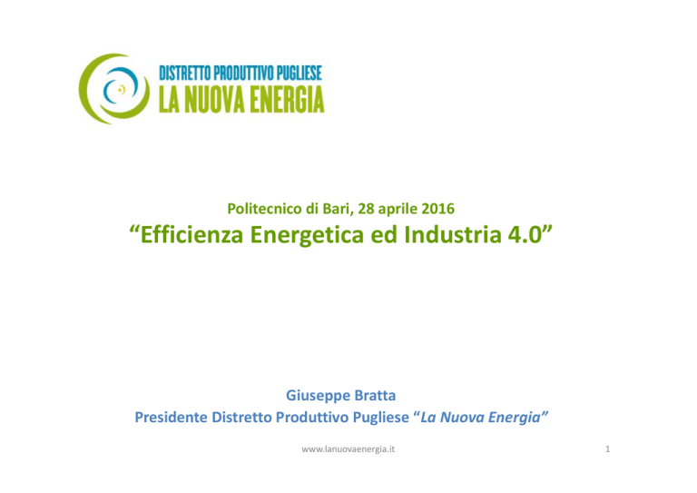 Politecnico di Bari, 28 aprile 2016 “Efficienza Energetica ed Industria 4.0” g Giuseppe Bratta P id t Di t tt P d tti P li Presidente Distretto Produttivo Pugliese “La Nuova Energia” “L N E i ” www.lanuovaenergia.it 1 Chi è il Distretto: gli associati Distretto Produttivo Pugliese delle Energie Rinnovabili e dell’Efficienza Energetica 350 imprese p operanti nel settore della green economy 13 Enti locali e associazioni pubbliche 10.000 addetti 1 Miliardo di € di fatturato (diretto e indiretto) www.lanuovaenergia.it 9 Università/Centri di ricerca - Politecnico di Bari - Università Uni ersità degli St Studi di di Bari - Università del Salento - Politecnico di Milano - Università degli Studi di Foggia - Università dell’Idrogeno - Universitate Din Craova - CREA (Centro di Ricerca Energia g e Ambiente)) - Cittadella della Ricerca 2 Attività “storica” storica delle aziende associate Distretto La Nuova Energia Fotovoltaico Eolico Biomasse Automazione industriale www.lanuovaenergia.it Tecnologia verde Illuminazione a LED 3 Evoluzione delle attività Energie rinnovabili ed efficienza energetica efficienza energetica Smart Energy Smart Grid Smart Building Le tecnologie Smart Energy oggi rappresentano l'evoluzione dei sistemi di energia rinnovabile, i bil della d ll rete di trasporto e di distribuzione. di ib i www.lanuovaenergia.it 4 Fabbisogno lordo fonti di energia in Italia da fonti fossili e rinnovabili Anno Fabbisogno Lordo Fabbisogno Lordo TWh Fossili e Import Fossili e Import TWh Fonti Rinnovabili Fonti Rinnovabili TWh 2020 345 215 62% 130 38% 2020 345 230 67% 115 33% Obiettivo SEN (Strategia Energetica Nazionale) Obiettivo raggiungibile secondo AEEG con gli strumenti attuali gg g g • La programmazione degli obiettivi in Italia si ferma al 2020 (SEN). Limitare lo sguardo al 2020 appare poco lungimirante, anche perché l’orizzonte temporale degli investimenti del settore è mediamente molto più lungo. g • L’obiettivo del 38% stabilito dalla SEN non sembra facilmente raggiungibile con gli strumenti normativi e incentivanti attualmente in vigore. L’Autorità per l’Energia Elettrica e il Gas ha affermato che allo stato dell’arte dell arte ll’obiettivo obiettivo più probabile sia pari verosimilmente a 115 TWh e non 130 TWh. TWh www.lanuovaenergia.it 5 Numeri lavoro della Green economy Le fonti rinnovabili impiegano più lavoratori Le fonti rinnovabili impiegano più lavoratori Fonte International Labour Organization Fonte: International Labour Organization Le energie rinnovabili si caratterizzano per un maggior impiego di lavoratori per unità di energia elettrica prodotta rispetto alle energie fossili, come dimostra il grafico, tratto dall’International Labour Organization, istituto intergovernativo afferente ff all’Onu. ll’ www.lanuovaenergia.it 6 Attuale architettura del mercato elettrico Mercato della Mercato della generazione Generazione Generazione Trasmissione Monopolisti Mercato di dettaglio a valle: Utenti Distribuzione Utenti www.lanuovaenergia.it Generazione Mercato di generazione g ancora in larga parte distorto II concessionari partecipano concessionari partecipano di fatto ai profitti del mercato, secondo regole fissate. Anche se non possono Anche se non possono aumentare i prezzi per aumentare i profitti, possono frapporre barriere al mercato di dettaglio al mercato di dettaglio, scoraggiando l’innovazione. Utenti ancora deboli, senza possibilità di aggregarsi e senza adeguata struttura di mercato per sperimentare e innovare 7 Effetti del mercato Effetti del mercato Monopoli regolati a “monte” tendono a monopolizzare i mercati a “valle” da loro li i ti “ ll ” d l dipendenti, a svantaggio degli utenti. www.lanuovaenergia.it 8 Il mercato elettrico smart per gli utenti Mercato della Mercato della generazione Generazione Generazione Trasmissione Monopolisti Microreti intelligenti: aggregazione di utenti Distribuzione Microreti www.lanuovaenergia.it Generazione Mercato di generazione g ancora in larga parte distorto II concessionari partecipano concessionari partecipano di fatto ai profitti del mercato, secondo regole fissate. Anche se non possono Anche se non possono aumentare i prezzi per aumentare i profitti, possono frapporre barriere al mercato di dettaglio al mercato di dettaglio, scoraggiando l’innovazione. Bisogna consentire l’aggregazione di utenti in microreti, che offrano alla rete una domanda flessibile e possano partecipare a pieno titolo alle opportunità di mercato 9 Le microreti intelligenti Le microreti intelligenti Una Microrete è un gruppo di carichi interconnessi e di risorse di generazione e immagazzinamento attraverso un unico Punto di Contatto con la rete per una aggregazione di utenti. La sua caratteristica principale l è l’autonomia, l’ con proprietàà di d limitazione l d ll propagazione di della d guasti. Una Microrete può funzionare collegata alla rete o in isola. isola Una Microrete è un complesso multiterminale (multi‐energy hub), che controlla i vari flussi di energia g ((elettrici, termici, ggas, etc…)) p per i suoi soci. Le smart cities devono avere al loro interno le microreti, ossia aggregazioni di utenti gestite da attori indipendenti soggetti a regole stringenti sulle loro dimensioni (potenza installata, numero di utenti,i estensione i geografica, fi indice i di occupazionale, i l obblighi bbli hi di manutenzione, i etc…)) www.lanuovaenergia.it 10 “Ricetta” Ricetta per il successo Industria 4.0 per il successo Industria 4 0 Le tecnologie delle smart Le tecnologie delle smart energy e delle microreti e delle microreti costituiscono una opportunità unica dal punto di vista costituiscono una opportunità unica dal punto di vista sociale ed energetico. Per le opportunità di mercato, bisognerebbe apprendere dai successi passati, quali: PC Smartphone Abbiamo bisogno di un’adeguata architettura e standard riconosciuti: una sorta di Windows per l’energia a servi