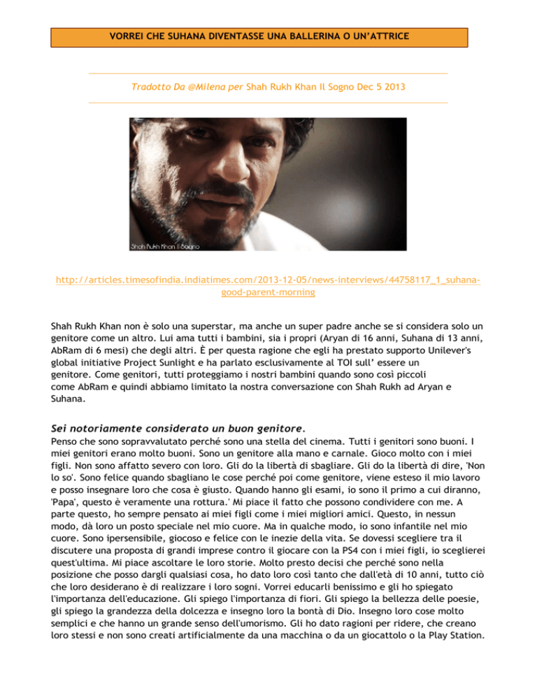 VORREI CHE SUHANA DIVENTASSE UNA BALLERINA O UN’ATTRICE Tradotto Da @Milena per Shah Rukh Khan Il Sogno Dec 5 2013 http://articles.timesofindia.indiatimes.com/2013-12-05/news-interviews/44758117_1_suhanagood-parent-morning Shah Rukh Khan non è solo una superstar, ma anche un super padre anche se si considera solo un genitore come un altro. Lui ama tutti i bambini, sia i propri (Aryan di 16 anni, Suhana di 13 anni, AbRam di 6 mesi) che degli altri. È per questa ragione che egli ha prestato supporto Unilever's global initiative Project Sunlight e ha parlato esclusivamente al TOI sull’ essere un genitore. Come genitori, tutti proteggiamo i nostri bambini quando sono così piccoli come AbRam e quindi abbiamo limitato la nostra conversazione con Shah Rukh ad Aryan e Suhana. Sei notoriamente considerato un buon genitore. Penso che sono sopravvalutato perché sono una stella del cinema. Tutti i genitori sono buoni. I miei genitori erano molto buoni. Sono un genitore alla mano e carnale. Gioco molto con i miei figli. Non sono affatto severo con loro. Gli do la libertà di sbagliare. Gli do la libertà di dire, 'Non lo so'. Sono felice quando sbagliano le cose perché poi come genitore, viene esteso il mio lavoro e posso insegnare loro che cosa è giusto. Quando hanno gli esami, io sono il primo a cui diranno, 'Papa', questo è veramente una rottura.' Mi piace il fatto che possono condividere con me. A parte questo, ho sempre pensato ai miei figli come i miei migliori amici. Questo, in nessun modo, dà loro un posto speciale nel mio cuore. Ma in qualche modo, io sono infantile nel mio cuore. Sono ipersensibile, giocoso e felice con le inezie della vita. Se dovessi scegliere tra il discutere una proposta di grandi imprese contro il giocare con la PS4 con i miei figli, io sceglierei quest'ultima. Mi piace ascoltare le loro storie. Molto presto decisi che perché sono nella posizione che posso dargli qualsiasi cosa, ho dato loro così tanto che dall'età di 10 anni, tutto ciò che loro desiderano è di realizzare i loro sogni. Vorrei educarli benissimo e gli ho spiegato l'importanza dell'educazione. Gli spiego l'importanza di fiori. Gli spiego la bellezza delle poesie, gli spiego la grandezza della dolcezza e insegno loro la bontà di Dio. Insegno loro cose molto semplici e che hanno un grande senso dell'umorismo. Gli ho dato ragioni per ridere, che creano loro stessi e non sono creati artificialmente da una macchina o da un giocattolo o la Play Station. VORREI CHE SUHANA DIVENTASSE UNA BALLERINA O UN’ATTRICE Gli ho insegnato a sorridere senza dover chiedere niente a nessuno. Ho le migliori discussioni con loro. SRK scherza sul carrello del cibo a casa Ricevo consigli da loro. Mio padre era così. Mia madre dopo la morte di mio padre era così. Eravamo amici. Vengo rimproverato a volte e mi è stato detto che non è giusto. Ma è un rapporto felice e bello. Sono belli fisicamente. Loro non sono in alcun modo impressionati da quello che faccio a lavoro. Ogni mattina vengono ad abbracciarmi, trascorrono del tempo con me, mi dicono buongiorno spontaneamente. Non devo chiedere. Aryan e Suhana sono entrambi adolescenti. Hanno la solita sindrome di ‘non mi abbracciare’? No, entrambi vengono e mi abbraccio molto stretti, molto bello. Anche se a volte devo dire, 'Aaj ka hug nahi hua'. Non hanno affatto problemi del genere. Mio figlio ora è più alto di me, ma io e lui camminiamo a Londra per mano. Con mia figlia, so che non sarà in imbarazzo quando lei è in pubblico, ma l’accompagno alle feste. So che lei non piace essere baciata o abbracciata davanti ai suoi amici, così lo faccio a distanza. Hanno bisogno di aver cura anche a vicenda del proprio spazio. Non entro mai nelle loro stanze senza bussare. E mi arrabbio molto se qualcuno non lo fa. Hanno camere separate e ognuno deve bussare e chiedere: 'Posso entrare?' E dare loro i cinque secondi per dare il permesso. E ho fatto questo da quando erano molto giovani. Con me, non c'è bisogno di bussare, possono saltare sul mio letto, e parlare con me in qualsiasi momento. Penso che sono stato in grado di conservare la loro innocenza almeno fino ad ora. Shah Rukh Khan non ha tempo per l’amicizia Sono viziati? No, affatto. Loro non sono come me. Le cose molto semplici li rendono felici. Ad essere veramente onesti, sono in posto dove non ci sono troppi desideri lasciati così. Ma non mi chiederebbero un motorino una bicicletta o una macchina. Recentemente ho detto ad Aryan che avrei voluto comprargli un’auto. E lui disse: 'Papà, abbiamo abbastanza auto.' L'altro giorno ha detto: 'Papà, voglio imparare a guidare una macchina.' Così mi sono offerto di insegnargli su una macchina più grande, ma lui vuole imparare sulla Santro. Ho una regola, se vado fuori città e paese per lo più, gli porto un regalo e lo lascio sempre al loro capezzale. Sono cresciuti troppo, ma lo faccio ancora adesso. Ma non ho mai ricevuto un messaggio da loro che mi chiedessero qualcosa. Recentemente, Suhana mi ha mandato un messaggio per chiedere una semplice T-shirt con un gatto che aveva visto in una foto. E ha detto, 'Papa, voglio una T-shirt e non tre.' Le ho chiesto perché lei non l’avesse indossato fino ad ora e lei ha detto, ‘La sto risparmiando per un'occasione in quanto si tratta di una T-shirt speciale’ Ed è ancora nel pacchetto. Mio figlio indossa le mie scarpe e i miei jeans. Loro non vestono di marca e mio figlio in realtà è piuttosto trasandato come me. Mi piace soddisfare i loro desideri prima che chiedono. VORREI CHE SUHANA DIVENTASSE UNA BALLERINA O UN’ATTRICE Quanto diverso sei come un padre per i tuoi bambini rispetto a ciò che tuo padre era con te? Morì quando avevo 15 anni. Così, dall'età di 11 ai 15, eravamo grandi amici. Lui mi chiamava 'Yaara', come diciamo in Pathans. I miei genitori non erano formale in niente. Non eravamo benestanti, così i nostri giochi erano fatti lì per lì. Non ho avuto un soprannome e sono sempre stato