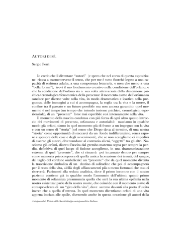 AUTORI DI SÉ. Sergio Perri Io credo che il diventare “autori” (e spero che nel corso di questa esposizione riesca a trasmettervene il senso, che per me è tutto fuorché legato a una capacità di scrittura adulta, a una competenza letteraria, e men che meno a una “bella forma”), trovi il suo fondamento creativo nella condizione dell’orfano, e che la condizione dell’orfano sia a sua volta attraversata dalla dimensione psichica/cronologica/fenomenica della presenza: il momento esatto dell’orfananza sancisce per diverse volte nella vita, in modo drammatico e icastico nella pregnanza delle immagini a cui si accompagna, la soglia tra la vita e la morte, il confine tra il passato e un futuro possibile ma non ancora garantito: quel momento è nel tempo (un tempo che intendo insieme psichico, cronologico, esperienziale), di un “presente” forse mai esperibile così intensamente nella vita. Il momento della nascita condensa con più forza di ogni altro questo intreccio dei movimenti di presenza, orfananza e autorialità: nasciamo in qualche modo già orfani, siamo in quel momento già di fronte a un impegno con la vita e con un senso di “storia” (nel senso che Diego dava al termine, di una nostra “storia” come opportunità di staccarci da un fondo indifferenziato, senza sapore e spessore delle cose e degli avvenimenti), che se non accogliamo ci impedirà di esserne gli autori, diventandone al contrario alieni, “oggetti” tra gli altri. Nasciamo già orfani, dicevo: l’uscita dal grembo materno segna per sempre la perdita definitiva di quel luogo di fusione accogliente, in una drammatizzazione estrema di quel “presente”, che ci rimarrà poi incarnato dentro per sempre come memoria psicocorporea di quella antica lacerazione dei tessuti, del sangue, del taglio del cordone ombelicale: un “presente” che da quel momento diventa la trascrizione simbolica di un destino di solitudine che poi ci accompagnerà per il resto della vita, aldilà degli affiancamenti più o meno fortunati che essa ci riserverà. Parimenti alla seduta analitica, dove il primo incontro con il nostro paziente contiene già in qualche modo l’annuncio dell’ultimo, questo primo momento di orfananza preannuncia quella che sarà la sua ultima epifania nella nostra esistenza: parlo della nostra morte, che coincide con il momento esatto di consapevolezza di un “giro della vita”, dove saremo davanti alla porta d’uscita invece che a quella d’entrata. In quel momento diventiamo orfani di una vita appena lasciata alle spalle, divenendo anche in questa occasione gli autori della Antropoanalisi. Rivista della Società Gruppo-antropoanalitica Italiana 2 Sergio Perri nostra morte, tra le stesse angosce e solitudini, presumo, di quell’iniziale momento di ingresso segnato dalla nascita. Orfananza, autorialità, occasioni della vita che diventano una storia di noi stessi, si muovono come dicevo lungo la dimensione fenomenica e cronologica della presenza, dunque come presenza a sé, consapevolezza di fronte a sé stessi in un determinato frangente della propria esistenza: momento esatto di un accadimento non già nel momento del suo divenire (in apertura per così dire), ma fissato invece su una esperienza di attualità estrema e talora istantanea: la nascita, la morte, quel sentire di stare tra un prima e un dopo che è radicalmente altro dal “prima” e dal “dopo” in sé. Una esperienza che, mi viene da dire, ha come il sapore di una folgorazione rifondativa, che in un attimo chiama a raccolta le nostre energie vitali, cioè autoriali, che io penso non siano altro che ciò di noi stessi su cui possiamo contare. E’il sentire di essere ancora vivi, cioè di non essere ancora morti nonostante una esperienza annullante appena trascorsa: una uscita dal grembo, un lutto, una uscita dalla vita, tutte le esperienze di separazione e perdita che incontriamo e che possiamo sostenere appunto “sentendo” (quasi animalescamente, mi viene da dire su una suggestione che Federico Leoni mi ha restituito e che, se vorrà, potrà illustrarvi), ribadendo a noi stessi che siamo ancora vivi o che abbiamo vissuto nell’aver attraversato e compiuto tutta la nostra storia. Questo spazio di consapevolezza auto-conservativa che si realizza nella istantaneità della presenza, non ha a che fare, secondo me, con l’adultità di un rilancio in avanti e per così dire progettuale (anche se ne è contemplato), ha a che fare invece con uno stato “bambino” che si trova, per la prima volta (e ogni volta successiva sarà comunque una “prima volta”), a poter contare solo su sé stesso, sulle sue risorse, sul solo fare affidamento al suo sentirsi vivo. Questa è per me l’autorialità (come premettevo e forse via via si fa più chiaro, tutto fuorché un luogo o un ritrovo adulto tra adulti competenti), che nei bambini, nell’ essere bambini e nel ritrovarsi bambini, trova il suo compimento più profondo perché si autocostruisce via via che il soggetto-bambino si affaccia al mondo con la propria curiosità affamata di vita o la propria disperazione: qualora riescano – queste - a sopravvivere al risucchio mortifero a cui la condizione d’orfananza si accompagna, cioè qualora sia stato possibile un loro riscatto psichico attraverso il dispositivo depressivo, e nello stesso tempo riparativo, del lutto. Moltissima letteratura ha visto proprio nella condizione dell’essere soli, la sede e la condizione per ri-fondarsi, ri-sentirsi vivi e di andare verso il mondo nonostante l’esperienza di una morte appena alle spalle: la gran parte dei romanzi di Charles Dickens – da Oliver Twist a Grandi speranze a Tempi difficili - hanno come protagonisti bambini disperati (come lo fu lui) che con la sola forza che hanno, appunto quella della disperazione, in una Londra di inizio Ottocento, violenta e infanticida, devono imparare a sopravvivere ai soprusi degli adulti e della vita. Autori di sé 3 Anche in Alexis, protagonis