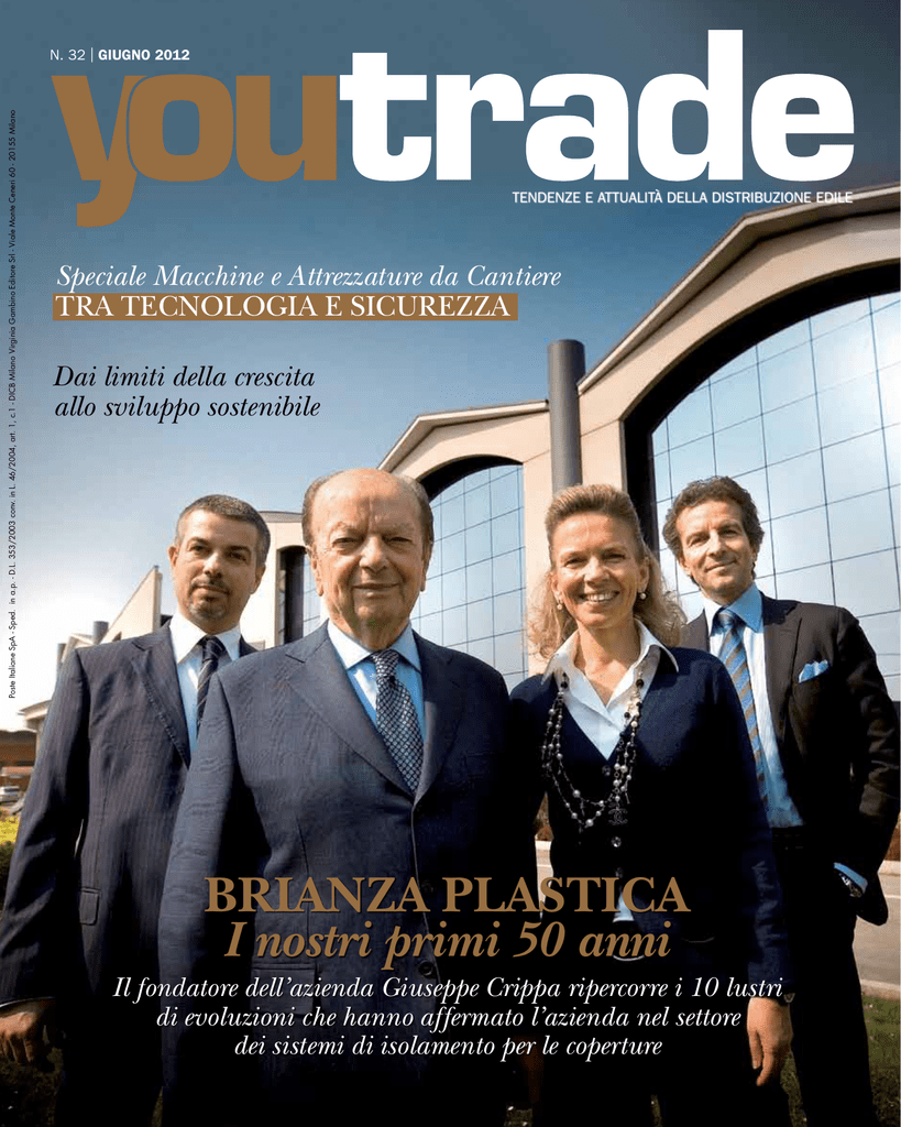 Poste Italiane SpA - Sped. in a.p. - D.L. 353/2003 conv. in L. 46/2004, art. 1, c.1 - DICB Milano Virginia Gambino Editore Srl - Viale Monte Ceneri 60 - 20155 Milano N. 32 | GIUGNO 2012 TENDENZE E ATTUALITÀ DELLA DISTRIBUZIONE EDILE Speciale Macchine e Attrezzature da Cantiere TRA TECNOLOGIA E SICUREZZA Dai limiti della crescita allo sviluppo sostenibile BRIANZA PLASTICA I nostri primi 50 anni Il fondatore dell’azienda Giuseppe Crippa ripercorre i 10 lustri di evoluzioni che hanno affermato l’azienda nel settore dei sistemi di isolamento per le coperture IL LEGNO CHE VIVE IN ARMONIA CON L’ AMBIENTE La linea legno all’acqua offre soluzioni protettive e decorative per tutti i manufatti in legno. Disponibile in una vasta gamma di tonalità. Una trasmittanza da record L’unico cupolino che è anche una finestra. Da VELUX l’unico cupolino con vetro piano interno bassoemissivo Uw = 0,72 W (m2K)*. Tutto il design, la tecnologia e la sicurezza delle finestre per tetti VELUX. Dotato di motore invisibile, finitura interna bianca e sensore pioggia integrato. Programmabile e operabile con un semplice telecomando, il cupolino VELUX può essere completato con tende interne ed esterne per il controllo dinamico dell’irraggiamento solare. *calcolato su una superficie di 2,79 mq. Scopri tutti i dettagli, visita www.velux.it Nuovi protagoni Il profilo del c V convegno nazionale ed il iz ia mercato fascia alta fascia media low cost C risi e tecnologia cambiano il mercato delle costruzioni. Le imprese si riorganizzano, la filiera si modifica e, in parallelo, chi fa acquisti chiede di più. A partire dalle informazioni, il rapporto con chi vende è diventato 2.0, più diretto e mediato dalla Rete. A tutto questo si aggiunge la spinta verso un’edilizia più sostenibile. Per questo il dibattito che YouTrade propone quest’anno non riguarderà solo la gestione del business in un periodo in cui la recessione mette in pericolo l’esistenza stessa di tante aziende. Perché in questi anni sono cambiate anche le richieste stesse del mercato. Chi acquista è più consapevole e utilizza il web, chi vende deve adeguarsi. Senza dimenticare la maggiore attenzione ai temi dell’ambiente, l’efficienza energetica di città ed edifici: bisogna adeguarsi entro il 2020, secondo quanto chiede l’Europa. Insomma, la sfida mette al centro la particella «ri»: rivalutare, riusare, riconcettualizzare, ristrutturare, ridurre, ringegnerizzare. È il momento di rinnovare, di rinnovarci, con un approccio smart, intelligente e innovativo. Il convegno di settembre sarà dedicato a questi temi, partendo dall’analisi congiunturale del mercato per affrontare il tema della distribuzione e delle prospettive future in relazione ai nuovi attori e ai nuovi consumatori. Sarà anche l’occasione per presentare, come lo scorso anno, i risultati del nuovo tavolo tecnico che YouTrade promuoverà nel corso dei prossimi mesi e che sarà concentrato sul tema del credito in rapporto alle necessità di rilancio economico delle costruzioni e del Paese. isti per la filiera consumatore 2.0 19 SETTEMBRE 2012 CENTRO CONGRESSI FIERA DI BERGAMO Via Lunga - presso Polo Fieristico - Bergamo in collaborazione con patrocini Installazione e Impianti Costruzioni main SPONSOR SPONSOR DISTRIBUZIONE L AT E R I Z I sistemi anticaduta dall’alto Tendenze e attualità della distribuzione edile BIO Pannello in fibra di legno per l’isolamento termico di tetti e pareti organo ufficiale associazione acal Anno 4 - Numero 32 - Giugno 2012 Direzione, Redazione, Abbonamenti, Amministrazione e Pubblicità Head office, Editorial office, Subscription, Administration and Advertising Virginia Gambino Editore S.r.l. Viale Monte Ceneri, 60 - 20155 Milano - Italy Tel. 0247761275 [email protected] - [email protected] Novità Direttore responsabile / Publisher Virginia Gambino [email protected] Consulente editoriale / Editor Consultant Francesca Negri [email protected] Ufficio commerciale - Vendita spazi pubblicitari Commercial department - Sale of advertising spaces Viale Monte Ceneri 60 - Milano Tel. 0247761275 - cell. 3401761951 [email protected] Collaboratori / Contributors Roberto Anghinoni, Umberto Anitori, Andrea Cammarata, Federico Della Puppa, Carlo Ezechieli, Gaia De Lorenzi, Giacomo Galli, Maria Lisieux, Ludovico Lucchi, Leda Martinelli, Sofia Marsigli, Federico Mombarone, Veronica Monaco, Santina Muscarà, Brunella Orsini, Alessandra Tale, Nicola Zeni Armatura in fibra di vetro per rivestimenti edilizi Progetto grafico e impaginazione Graphic Design and Page layout Fabio Monauni Curcu & Genovese Associati s.r.l. - Trento Comitato Tecnico / Technical Committee Giampiero Abrate Umberto Bonazza Matteo Camillini Claudio Cammi Giovanni Carubelli Gilberto Castoldi Stefano Colombino Mario Cuc Fabrizio Di Luzio Daniele Ferrai Giovanni Pietro Grazioli Gianni Guidoccio Franco Nessi Andrea Veroni Novità ETAG 004 C.C.E. De Eccher Gruppo BigMat Cammi Edilpadana TopHaus Gruppo Uniedil Edilcuc Vemac Bauexpert Centredil Consorzio C.R.E. Eternedile - Iperedil Lino Veroni Come abbonarsi / How to subscribe Italia annuo € 48,00 - Estero annuo € 70,00 Copia singola € 5,00 Per abbonarsi è sufficiente fare richiesta a [email protected] Spedizione in contrassegno Stampa / Printing C.P.M. Spa, Via Puccini, 64 - Casarile (MI) Responsabilità / Responsability : la riproduzione delle illustrazioni e articoli pubblicati dalla rivista, nonché la loro riproduzione, è riservata e non può avvenire senza espressa autorizzazione della Casa Editrice. I manoscritti e le illustrazioni inviati alla redazione non saranno restituiti, anche se non pubblicati, e la Casa Editrice non si assume responsabilità per il caso che si tratti di esemplari unici. La Casa Editrice non si assume responsabilità per i casi di eventuali errori contenuti negli articoli pubblicati o di errori in cui fosse incorsa nella loro riproduzione sulla rivista. Tiratura del presente numero: n. 10.000 copie Pe