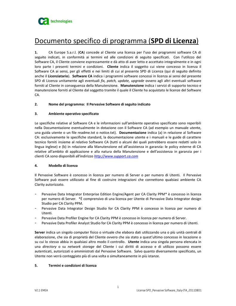 Documento specifico di programma (SPD di Licenza) 1. CA Europe S.a.r.l. (CA) concede al Cliente una licenza per l’uso dei programmi software CA di seguito indicati, in conformità ai termini ed alle condizioni di seguito specificati. Con l’utilizzo del Software CA, il Cliente conviene espressamente e dà atto di aver letto e accettato integralmente e in ogni loro parte i presenti termini e condizioni. Cliente indica il soggetto cui viene concesso in licenza il Software CA ai sensi, per gli effetti e nei limiti di cui al presente SPD di Licenza (qui di seguito definito anche il Licenziatario). Software CA indica i programmi software concessi in licenza ai sensi del presente SPD di Licenza unitamente agli eventuali fix, patch, update, upgrade ovvero agli altri eventuali software forniti al Cliente in conseguenza della Manutenzione. Manutenzione indica i servizi di supporto tecnico e manutenzione forniti al Cliente dal soggetto tramite il quale il Cliente ha acquistato le licenze del Software CA. 2. Nome del programma: Il Pervasive Software di seguito indicato 3. Ambiente operativo specificato Le specifiche relative al Software CA e le informazioni sull'ambiente operativo specificato sono reperibili nella Documentazione eventualmente in dotazione con il Software CA (ad esempio un manuale utente, una guida utente o un file readme.txt o notice.txt). Documentazione indica (a) in relazione al Software CA: esclusivamente le specifiche standard, la documentazione utente e i manuali e le guide di carattere tecnico forniti insieme al relativo Software CA (tutti o alcuni dei quali potrebbero essere redatti solo in lingua inglese) e (b) in relazione alla Manutenzione ed all’assistenza in garanzia: le policy esterne di CA relative all'ambito di applicazione e alla natura della Manutenzione e dell'assistenza in garanzia per i clienti CA sono disponibili all'indirizzo http://www.support.ca.com 4. Modello di licenza Il Pervasive Software è concesso in licenza per numero di Server o per numero di Utenti. Il Pervasive Software può essere utilizzato al fine di costruire integrazioni che connettono qualsiasi ambiente CA Clarity autorizzato. - - Pervasive Data Integrator Enterprise Edition Engine/Agent per CA Clarity PPM* è concesso in licenza per numero di Server. *È comprensivo di una licenza per Utente di Pervasive Data Integrator design Studio per CA Clarity PPM. Pervasive Data Integrator Design Studio for CA Clarity PPM è concesso in licenza per numero di Utenti. Pervasive Data Profiler Engine for CA Clarity PPM è concesso in licenza per numero di Server. Pervasive Data Profiler Analyst Studio for CA Clarity PPM è concesso in licenza per numero di Utenti. Server indica un singolo computer fisico o virtuale che elabora dati utilizzando una o più unità centrali di elaborazione, che sia di proprietà del Cliente ovvero che sia stato a quest’ultimo concesso in locazione o su cui lo stesso abbia in qualsiasi altro modo il controllo. Utente indica una singola persona elencata in una directory o su network storage del Cliente i cui diritti di accesso e di utilizzo possono essere autenticati, autorizzati o amministrati dal Pervasive Software. Salvo quanto diversamente specificato, un Utente non verrà conteggiato più di una volta o simultaneamente in più istanze. 5. Termini e condizioni di licenza 5.1 Licenza d’uso. La licenza concessa al Cliente è una licenza d’uso a titolo oneroso, personale, limitata, non esclusiva, non trasferibile e territorialmente limitata. Il Territorio è indicato nella sezione “Territorio” del modulo d’ordine applicabile. Tale Software CA licenziato potrà essere utilizzato dal Cliente stesso nonché dai suoi Utenti Finali Autorizzati. Per Utenti Finali Autorizzati si intendono i dipendenti e i consulenti esterni del Cliente e delle sue società Controllate, ad esclusione di eventuali fornitori di servizi di outsourcing, facility management o di servizi applicativi. Resta inteso che in tali casi, l'utilizzo da parte degli Utenti Finali Autorizzati dei Software CA concessi in licenza resterà in ogni momento sotto la responsabilità del Cliente. Il Cliente potrà utilizzare il Software CA per le ordinarie operazioni di elaborazione dei dati interni delle proprie Società Controllate e solo per le finalità interne di ognuna di esse, intendendosi per Controllata qualsiasi società nella quale il Cliente detenga una partecipazione superiore al 50% del capitale sociale e la maggioranza dei diritti di voto nelle assemblee ordinarie (e fintantoché il Cliente conservi un tale peso partecipativo). Previa comunicazione scritta a CA, il Cliente potrà trasferire il Software CA su nuovi hardware ovvero presso siti o locali diversi purché all’interno del Territorio. Tale trasferimento potrebbe richiede il pagamento di canoni aggiuntivi in favore della società del gruppo CA dalla quale il Cliente ha acquistato le licenze del Software CA. 5.2 Tipo di Licenza. Il tipo di licenza acquistata dal Cliente è indicato nel modulo d’ordine per il Software CA e potrà essere: Licenza perpetua: una licenza perpetua a utilizzare il Software CA; o Licenza a noleggio: una licenza a utilizzare il Software CA per il periodo di tempo specificato nel modulo d’ordine. Alla scadenza della relativa durata, il Cliente, le sue Controllate e gli Utenti Finali Autorizzati, che non abbiano nel frattempo ottenuto una nuova licenza, sono tenuti a interrompere l'utilizzo del Software CA. 5.3 Uso non Autorizzato. Ad eccezione di quanto espressamente autorizzato dal presente SPD di Licenza, al Cliente è fatto espresso divieto di: (a) copiare, riprodurre, distribuire o divulgare il Software CA; resta inteso che il Cliente avrà facoltà di creare un ragionevole numero di copie del Software CA a scopo di disaster recovery, backup e archiviazione di tipo c.d. "cold standby", che potranno essere utilizzate per fare attività di testing e in quei casi che, secondo buona fede, siano definibili c