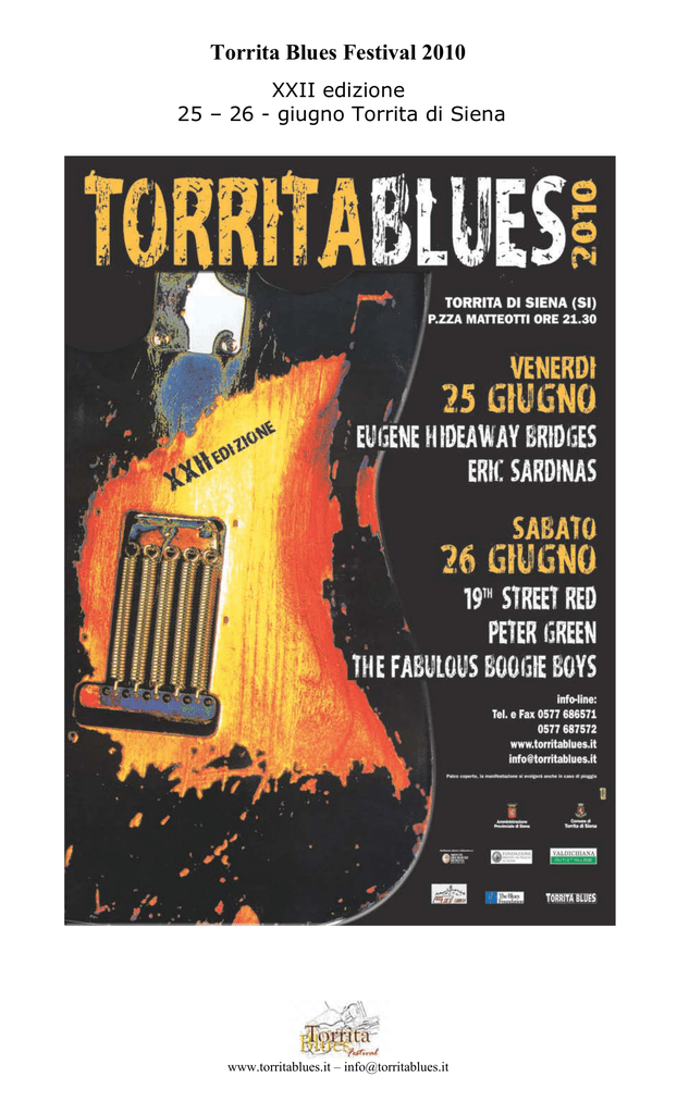 Torrita Blues Festival 2010 XXII edizione 25 – 26 - giugno Torrita di Siena www.torritablues.it – [email protected] Torrita Blues Festival 2010 PRESENTAZIONE Torrita Blues è una importante rassegna musicale che si svolge da 22 anni a Torrita di Siena in una splendida cornice medievale nel cuore della ridente Toscana. Tra le prestigiose colline senesi a pochi passi da Pienza, Montepulciano e Montalcino c’è un piccolo castello medievale, Torrita di Siena, dove ogni anno nell’ultimo fine settimana di giugno si svolge uno dei più importanti festival blues italiani: Torrita Blues Festival. Creato nel 1989 da un gruppo di amici appassionati di blues, il festival giunto alla 22° edizione è diventato un appuntamento atteso da migliaia di fans ogni anno. Tra centinaia artisti che hanno partecipato al Torrita Blues ne ricordiamo alcuni dei più significativi: Taj Mahal, John Mayall, Robben Ford, Roy Rogers, Bettye Lavette, Popa Chubby, Canned Heat, Luther Allison, Charlie Musselwhite, James Cotton, Tom Principato. Quella del 2010 si preannuncia come una delle edizioni fra le più grandi del Torrita Blues visto la qualità e l'importanza dei nomi in cartellone. Uno fra tutti il leggendario PETER GREEN, chitarrista e leader storico dei Fleetwood Mac autore della famosa "Black Magic Woman" portata al successo da Santana e dalla mitica“Oh Well”, che sarà in Italia proprio in occasione del Torrita Blues Festival. Programma del Torrita Blues 2010: si inizia venerdì 25 giugno con due grandissimi musicisti: Eugene Hideaway Bridges considerato dalla critica musicale come l’erede di B.B. King, quindi sarà la volta di Eric Sardinas & Big Motors uno dei musicisti più aggressivi nel panorama blues contemporaneo che con il suo show energizzante promette fuoco e fiamme ai suoi fans. Sabato 26 giugno si parte con 19° Street Red musicista di New Orleans che con la sua voce graffiante ricorda moltissimo Howlin Wolf, per poi dar spazio al grandissimo Peter Green in una delle date estive in Italia. La serata si conclude con una frizzante band di boogie, The Faboulous Boogie Boys che farà ballare la piazza fino a tarda notte. Il festival blues si terrà come sempre a Torrita di Siena nella splendida piazza Matteotti, circondata dalle mura medievali e dalla grande torre del comune che sovrasta il palco. Durante i giorni del Torrita Blues all’interno dell’area del festival sarà in funzione un piccolo stand gastronomico gestito dall’Associazione (bar, panini, salsicce), sarà ripetuta la tradizionale mostra blues di foto e manifesti del festival oltre al mercatino blues nei borghi del paese in collaborazione con l’Amministrazione Comunale del Comune di Torrita di Siena. www.torritablues.it – [email protected] Torrita Blues Festival 2010 Eugene Hideaway Bridges Venerdì 25 giugno 2010 Eugene è un musicista nomade. La sua casa è ovunque lo porta la sua prossima esibizione,e questo accade in America,attraverso l’Europa e fino all’Australia. Nato nel 1963, Eugene è il quarto di cinque fratelli ed è figlio del chitarrista blues Hideaway Slim. Sua madre è una Bullock (la stessa famiglia di Anna MaeBullock, meglio conosciuta come Tina Turner). Eugene afferma di aver ereditato le abilità con la chitarra dal padre, mentre la voce dalla madre. A cinque anni stava già percorrendo la Louisiana suonando con il padre ed i suoi fratelli. Si esibì come “The Bridges Brothers” si esibì nelle varie chiese locali tra cui quella del pastore Edwards,considerata una chiesa ricca di talenti gospel. A tredici anni formò la sua prima band “The Five Stars”. Lascia il Texas a sedici anni per entrare nella Air Force. In seguito si inserisce nei gruppi gospel “The New Chosen Singers” e nella leggendaria formazione dei “Mighty Clouds Of Joy” . A Houston, Eugene offre il suo talento in studio a tre delle maggiori blues band locali. In Europa arriva grazie a Big Joe Turner che lo inserisce nella sua “Big Joe Turner Memphis Blues Caravan” come cantante chitarrista. Un anno dopo forma il proprio gruppo “Eugene Hideaway Bridges Band”. Registra per la Blueside “Born To Be Blue” prodotto da Mike Vernon. Le sue esibizioni dal vivo incontrano il favore della critica e del grande pubblico, tanto da essere premiato come cantante dell’anno dalla rivista inglese Blueprint e nel ’99 in Francia vince (France Blues ’99) il titolo di cantante dell’anno. Nel 2000 si unisce alla Armadillo Record per la quale pubblica ad oggi quattro CD, mentre altri due,un “Live” e uno tutto acustico,unitamente ad un DVD uscito nel 2007. Eugene Hideaway Bridges nel volgere di pochi anni si è costruito una solida reputazione che gli ha permesso di essere invitato a tutti maggiori festival in USA, Europa, Singapore, Nuova Zelanda e Australia. La critica internazionale lo ha incoronato come l’unico grande erede di B.B.King, e chi ha avuto la possibilità di assistere ad uno dei suoi concerti sa perché ! Nel dicembre del 2007 ha vinto 2 Grammy, il primo come miglior bluesman dell'anno, e il secondo in occasione dell'uscita del nuovo CD, come miglior disco dell'anno, decisamente una carriera continuamente in ascesa ! www.torritablues.it – [email protected] Torrita Blues Festival 2010 Eric Sardinas & Big Motors Venerdì 25 giugno 2010 Eric Sardinas nasce nel 1970 a Fort Lauderdale, Florida. A sei anni(!) imbraccia per la prima volta la chitarra; anche se è mancino impara a suonare da destrorso (i.e. "normale"...), ma questo non rappresenta un impedimento anzi, contribuisce a rendere il suo modo di suonare più incisivo e originale. La sua formazione musicale include tutto il filone della musica nera che deriva dal Blues, soprattutto quello del Delta del Mississippi: il Blues rurale suonato con chitarra acustica e slide (Charley Patton, Son House, Robert Johnson, Skip James, Bukka White, Fred Mcdowell), il sound di Chicago (John Lee Hooker, Elmore James, Howlin’ Wolf, Muddy Waters, Otis Rush and 