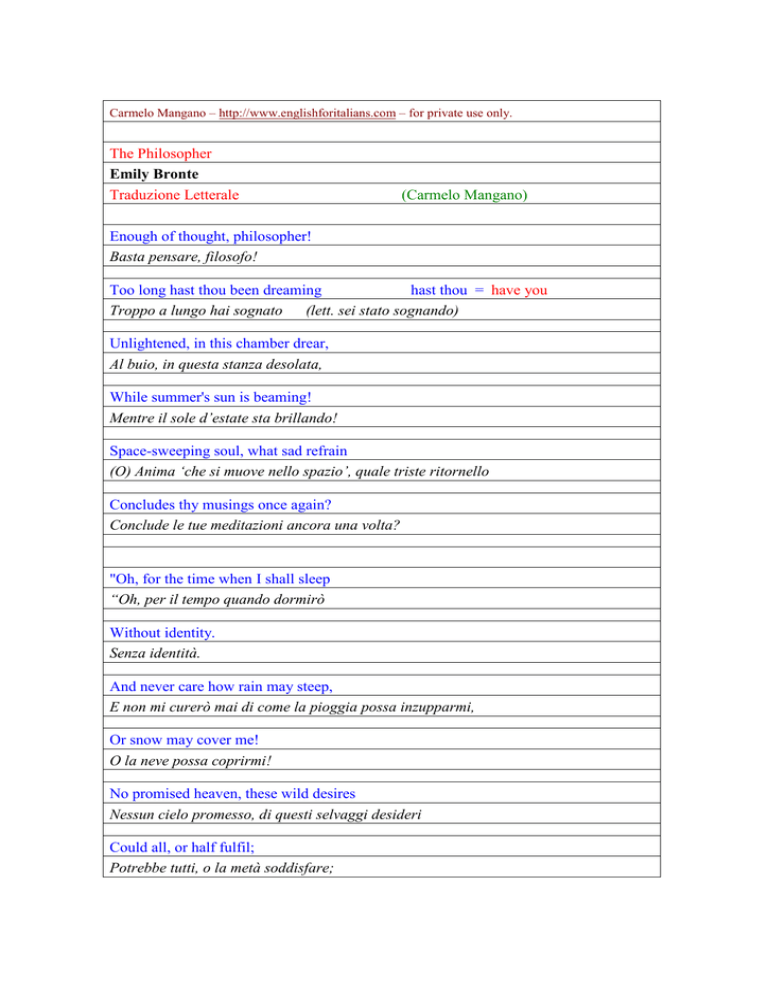 Carmelo Mangano – http://www.englishforitalians.com – for private use only. The Philosopher Emily Bronte Traduzione Letterale (Carmelo Mangano) Enough of thought, philosopher! Basta pensare, filosofo! Too long hast thou been dreaming hast thou = have you Troppo a lungo hai sognato (lett. sei stato sognando) Unlightened, in this chamber drear, Al buio, in questa stanza desolata, While summer's sun is beaming! Mentre il sole d’estate sta brillando! Space-sweeping soul, what sad refrain (O) Anima ‘che si muove nello spazio’, quale triste ritornello Concludes thy musings once again? Conclude le tue meditazioni ancora una volta? "Oh, for the time when I shall sleep “Oh, per il tempo quando dormirò Without identity. Senza identità. And never care how rain may steep, E non mi curerò mai di come la pioggia possa inzupparmi, Or snow may cover me! O la neve possa coprirmi! No promised heaven, these wild desires Nessun cielo promesso, di questi selvaggi desideri Could all, or half fulfil; Potrebbe tutti, o la metà soddisfare; No threatened hell, with quenchless fires, Nessun inferno minacciato, con fuochi ‘che non si spengono’, Subdue this quenchless will!" (Potrebbe) sottomettere questa volontà ‘che non si spegne’!” "So said I, and still say the same; “Così dissi, e dico ancora lo stesso; Still, to my death, will say Ancora, fino alla mia morte, lo dirò Three gods, within this little frame, Tre dei, dentro questo piccolo corpo, Are warring night and day; Stanno lottando notte e giorno; Heaven could not hold them all, and yet Il cielo non potrebbe contenerli tutti, e tuttavia They all are held in me; Tutti loro sono contenuti in me; And must be mine till I forget E debbono essere miei finché dimentico (dimenticherò) My present entity! La mia attuale entità! Oh, for the time, when in my breast Oh, per il momento, quando nel mio petto Their struggles will be o'er! Le loro lotte saranno finite! Oh, for the day, when I shall rest, Oh, per il giorno, quando riposerò (morirò), And never suffer more!" E mai più soffrirò!” o’er = over "I saw a spirit, standing, man, “Vidi uno spirito, in piedi, un uomo, Where thou dost stand - an hour ago, thou = you Dove tu stai – un’ora fa, dost = forma arcaica di seconda persona singolare del presente del verbo to do. And round his feet three rivers ran, Ed attorno ai suoi piedi scorrevano tre fiumi, Of equal depth, and equal flow Di uguale profondità, e di uguale flusso A golden stream - and one like blood; Un fiume dorato – ed uno come sangue; And one like sapphire seemed to be; Ed uno sembrava essere come lo zaffiro; But, where they joined their triple flood Ma, dove essi univano il loro triplice flusso It tumbled in an inky sea Precipitava in un mare nero come l’inchiostro The spirit sent his dazzling gaze Lo spirito inviava il suo sguardo abbagliante Down through that ocean's gloomy night; Giù attraverso quella triste notte dell’oceano; Then, kindling all, with sudden blaze, Poi, accendendo tutto, con una improvvisa fiammata, The glad deep sparkled wide and bright L’allegro mare risplendeva ampio e brillante White as the sun, far, far more fair Bianco come il sole, molto, molto più bello Than its divided sources were!" Di quanto lo fossero le sue divise fonti!” "And even for that spirit, seer, “E persino per quello spirito, veggente, I've watched and sought my life-time long; Ho vigilato e cercato durante tutta la mia vita; Sought him in heaven, hell, earth, and air, L’ho cercato in cielo, inferno, in terra, e nell’aria, An endless search, and always wrong. Una ricerca infinita, e sempre errata. Had I but seen his glorious eye Se solo avessi visto il suo splendido occhio ONCE light the clouds that wilder me; Illuminare per una volta sola le nuvole che mi sviano; I ne'er had raised this coward cry Non avrei mai emesso questo codardo grido To cease to think, and cease to be; Per cessare di pensare, e cessare di essere; I ne'er had called oblivion blest, Io non avrei mai chiamato l’oblio benedetto, Nor stretching eager hands to death, Né esteso le mani ansiose alla morte, Implored to change for senseless rest (Né) implorato di cambiare per un riposo insensato This sentient soul, this living breath Quest’anima cosciente, questo respiro vivente Oh, let me die - that power and will Oh, lasciami morire – quella forza e volontà Their cruel strife may close; Possano chiudere la loro crudele lotta; And conquered good, and conquering ill Ed il bene conquistato, ed il male che conquista Be lost in one repose!" Siano persi in un solo riposo!” Hello! Con il mio lavoro di traduzione ti sto aiutando con i tuoi studi. Sul mio sito www.englishforitalians.com troverai oltre 100 traduzioni di poesie e brani letterari inglesi, che puoi scaricare gratuitamente. Aiutami a far conoscere il mio Corso di Inglese, frutto di molti anni di lavoro, e specificamente scritto per studenti italiani. Grazie, Carmelo Mangano [email protected] Corso di Inglese “English for Italians” Un DVD con 18 ore di registrazioni in mp3 30 Units in formato PDF (750 pag.) Prezzo: 35 euro (spese di spedizione incluse) Per vedere le modalità di pagamento e scaricare gratuitamente le prime 10 Units del Corso visita il mio sito: www.englishforitalians.com Se hai bisogno della traduzione di una poesia non presente nel sito, contattami, cercherò di accontentarti. [email protected]