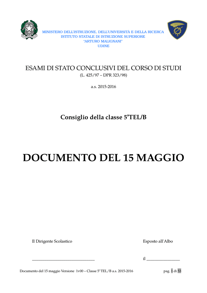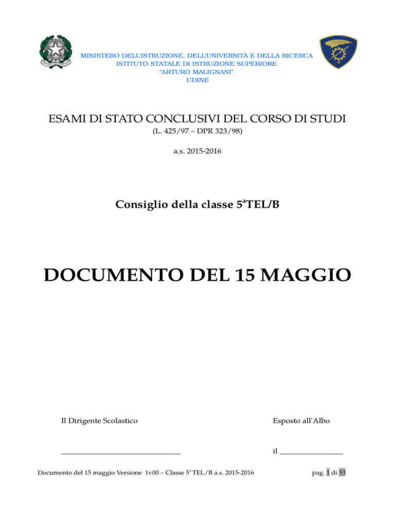 MINISTERO DELL’ISTRUZIONE, DELL’UNIVERSITÀ E DELLA RICERCA ISTITUTO STATALE DI ISTRUZIONE SUPERIORE “ARTURO MALIGNANI” UDINE ESAMI DI STATO CONCLUSIVI DEL CORSO DI STUDI (L. 425/97 – DPR 323/98) a.s. 2015-2016 Consiglio della classe 5aTEL/B DOCUMENTO DEL 15 MAGGIO Il Dirigente Scolastico Esposto all'Albo ______________________________ il ________________ Documento del 15 maggio Versione 1v00 – Classe 5a TEL/B a.s. 2015-2016 pag. 1 di 53 Indice 1. Composizione del Consiglio di Classe …............................................................ 2. Profilo culturale e professionale dello studente …................................................. 3. Relazione generale sulla classe ….................................................................................... 3.1 Composizione ................................................................................................... 3.2 Provenienza ................................................................................................... 3.3 Profitto …........................................................................................................... 3.4 Regolarità degli studi ........................................................................................ 3.5 Comportamento…............................................................................................... 3.6 Obiettivi educativi e formativi e cognitivi …................................................ 3.7 Obiettivi cognitivi …................................................................................... 3.8 Metodologia e strategie didattiche …........................................................... 3.9 Esperienze didattiche e formative di particolare rilievo …........................ 3.10 Attività integrative ed extracurricolari …............................................... 4. Relazione finale per disciplina …...................................................................…............ 4.1 Religione ….......................................................................................................... 4.2 Lingua e letteratura italiana …....................................................................... 4.3 Storia ….......................................................................................................... 4.4 Gestione di Progetto …................................................................................... 4.5 Matematica ….............................................................................................. 4.6 Sistemi e Reti …............................................................................................... 4.7 Lingua straniera (Inglese) …....................................................................... 4.8 Telecomunicazioni …................................................................................... 4.9 Tecnologia, Disegno e Progettazione …............................................................ 4.10 Educazione Fisica ….........................................................................…...... 5. Simulazioni di terza prova …................................................................................... 5.1 Griglia di valutazione terza prova …........................................................... 5.2 Criteri seguiti per la progettazione delle simulazioni delle terze prove .... 5.3 Scheda informativa relativa alle simulazioni delle terze prove svolte …. 5.4 Note informative per la predisposizione della terza prova scritta ..... 6. Simulazioni di seconda prova …......................................................................….......... 7. Il Consiglio di Classe …..................................................................................….......... Documento del 15 maggio Versione 1v00 – Classe 5a TEL/B a.s. 2015-2016 3 3 4 4 5 5 5 5 6 6 7 7 8 8 8 9 13 17 21 25 27 34 39 42 47 49 50 50 50 51 53 pag. 2 di 53 1. COMPOSIZIONE DEL CONSIGLIO DI CLASSE Docente Materia Ore settimanali Maisto Giuliana Religione 1 Bertolini Eralda Lingua e letteratura italiana 4 Bertolini Eralda Storia 2 Pedretti Antonella Lingua straniera (Inglese) 3 Costanzo Maria Matematica 3 Giaquinto Antonio Gestione di Progetto Bandiziol Santino Laboratorio di Gestione di Progetto Montresor Francesca Telecomunicazioni Boaro Sergio Laboratorio di Telecomunicazioni Girau Fabio Sistemi e Reti Bandiziol Santino Laboratorio di Sistemi e Reti Pecile Andrea (De Marchi Simone) TDP 2+1 1 3+3 3 1+3 3 1+3 Bandiziol Santino Laboratorio di TDP 3 Mansi Matteo Educazione Fisica 2 La classe non ha subito accorpamenti nell'arco del triennio né sofferto modifiche alla continuità didattica, per cui la composizione della componente docente del consiglio di classe è rimasta strutturalmente inalterata nell'arco del triennio. Si rilevano solamente due interruzioni della docenza assegnata nel corso del presente anno scolastico, causate da infortunio: Telecomunicazioni nel periodo febbraiomarzo e TDP nel periodo aprile-giugno. In entrambi i casi è stato nominato supplente temporaneo il prof. Ing. De Marchi Simone. 2. PROFILO CULTURALE E PROFESSIONALE DELLO STUDENTE Il corso di studi seguito dalla classe è denominato “Informatica e Telecomunicazioni”, con articolazione “Telecomunicazioni”. L’indirizzo “Informatica e Telecomunicazioni” ha lo scopo di far acquisire allo studente, al termine del percorso quinquennale, specifiche competenze nell’ambito del ciclo di vita del prodotto software e dell’infrastruttura di telecomunicazione, declinate in termini di capacità di ideare, progettare, produrre e inserire nel mercato componenti e servizi di settore. La preparazione dello studente è integrata da competenze trasversali che gli consentono di leggere le problematiche dell’intera filiera. Documento del 15 maggio Versione 1v00 – Classe 5a TEL/B a.s. 2015-2016 pag. 3 di 53 Dall’analisi delle richieste delle aziende
