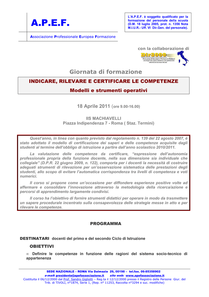 L’A.P.E.F. è soggetto qualificato per la formazione del personale della scuola (D.M. 18 luglio 2005, prot. n. 1356 Nota M.I.U.R.- Uff. VI Dir.Gen. del personale). A.P.E.F. Associazione Professionale Europea Formazione con la collaborazione di Giornata di formazione INDICARE, RILEVARE E CERTIFICARE LE COMPETENZE Modelli e strumenti operativi 18 Aprile 2011 (ore 9.00-16.00) IIS MACHIAVELLI Piazza Indipendenza 7 - Roma ( Staz. Termini) Quest’anno, in linea con quanto previsto dal regolamento n. 139 del 22 agosto 2007, è stato adottato il modello di certificazione dei saperi e delle competenze acquisite dagli studenti al termine dell’obbligo di istruzione a partire dall’anno scolastico 2010/2011. La valutazione delle competenze da certificare, “espressione dell’autonomia professionale propria della funzione docente, nella sua dimensione sia individuale che collegiale” (D.P.R. 22 giugno 2009, n. 122), comporta per i docenti la necessità di costruire adeguati strumenti di rilevazione per un’osservazione sistematica delle prestazioni degli studenti, allo scopo di evitare l’automatica corrispondenza tra livelli di competenza e voti numerici. Il corso si propone come un’occasione per diffondere esperienze positive volte ad affermare e consolidare l’innovazione attraverso la metodologia della ricerca/azione e percorsi di apprendimento largamente condivisi. Il corso ha l’obiettivo di fornire strumenti didattici per operare in modo da trasmettere un sapere procedurale incentrato sulla consapevolezza delle strategie messe in atto e per rilevare le competenze. PROGRAMMA DESTINATARI docenti del primo e del secondo Ciclo di Istruzione OBIETTIVI • Definire le competenze in funzione delle ragioni del sistema socio-tecnico di appartenenza SEDE NAZIONALE – ROMA Via Dalmazia 29, 00198 – tel.fax. 06-85358902 sito web: www.apefassociazione.it Costituita il 06/12/2000 dal Prof. Sandro Gigliotti – Reg.ta il 12/12/2000 presso il Registro delle Persone Giur. del Trib. di TIVOLI, n°1874, Serie 1, (Rep. n° 11253, Raccolta n°3294 e suc. modifiche) e-mail: [email protected] A.P.E.F. L’A.P.E.F. è soggetto qualificato per la formazione del personale della scuola (D.M. 18 luglio 2005, prot. n. 1356 Nota M.I.U.R.- Uff. VI Dir.Gen. del personale). Associazione Professionale Europea Formazione • Stabilire che la competenza è la risultante di una serie di caratteristiche, è un valore aggiunto dato all’azione svolta e non deve essere confusa con un “comportamento competente “ • Individuare indicatori di competenza perché servono a limitare l’area di ricerca della stessa competenza CONTENUTI FORMATIVI La giornata di formazione è articolata in due fasi Prima fase • • • • (9.00 – 13.00) Come riconoscere la situazione di competenza L’osservazione sistematica Gli indicatori di competenza Le operazioni mentali Seconda fase (14.00 – 16.00) • Laboratorio didattico interattivo Saranno consegnati materiali per gli approfondimenti e per la progettazione di percorsi. Docente formatore Prof.ssa Maria Teresa Sigari, docente di discipline giuridicoeconomiche presso ITCG Luzzatti di Palestrina; già Supervisore presso la SSIS Lazio; applicatrice e formatrice del Metodo Feuerstein, docente ospedaliera. Costi Il costo complessivo del percorso formativo (corso in presenza più assistenza on- line e materiali didattici), per ogni scuola aderente è pari a: € 80, nel caso di un solo iscritto al seminario in presenza € 140, nel caso di due iscritti al seminario in presenza € 180, nel caso di tre iscritti al seminario in presenza € 220, nel caso di quattro iscritti al seminario in presenza Per eventuali adesioni di singoli docenti l’importo, di 80€, dovrà essere saldato all’inizio della giornata di formazione. (la partecipazione è gratuita per i soci Apef, compatibilmente con il posti disponibili) Al termine del corso verrà rilasciato attestato di frequenza. SEDE NAZIONALE – ROMA Via Dalmazia 29, 00198 – tel.fax. 06-85358902 sito web: www.apefassociazione.it Costituita il 06/12/2000 dal Prof. Sandro Gigliotti – Reg.ta il 12/12/2000 presso il Registro delle Persone Giur. del Trib. di TIVOLI, n°1874, Serie 1, (Rep. n° 11253, Raccolta n°3294 e suc. modifiche) e-mail: [email protected]