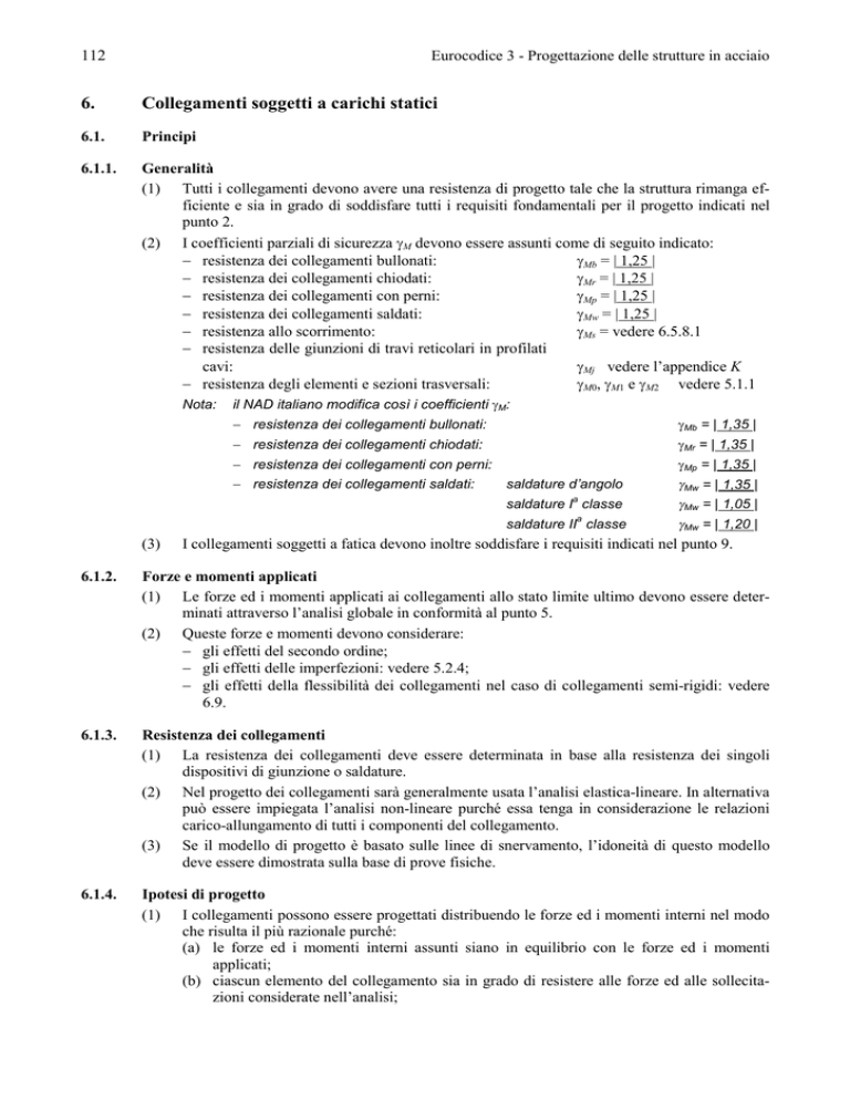 112 Eurocodice 3 - Progettazione delle strutture in acciaio 6. Collegamenti soggetti a carichi statici 6.1. Principi 6.1.1. Generalità (1) Tutti i collegamenti devono avere una resistenza di progetto tale che la struttura rimanga efficiente e sia in grado di soddisfare tutti i requisiti fondamentali per il progetto indicati nel punto 2. (2) I coefficienti parziali di sicurezza γM devono essere assunti come di seguito indicato: − resistenza dei collegamenti bullonati: γMb = | 1,25 | − resistenza dei collegamenti chiodati: γMr = | 1,25 | − resistenza dei collegamenti con perni: γMp = | 1,25 | − resistenza dei collegamenti saldati: γMw = | 1,25 | − resistenza allo scorrimento: γMs = vedere 6.5.8.1 − resistenza delle giunzioni di travi reticolari in profilati cavi: γMj vedere l’appendice K − resistenza degli elementi e sezioni trasversali: γM0, γM1 e γM2 vedere 5.1.1 Nota: il NAD italiano modifica così i coefficienti γM: − resistenza dei collegamenti bullonati: γMb = | 1,35 | − resistenza dei collegamenti chiodati: γMr = | 1,35 | − resistenza dei collegamenti con perni: γMp = | 1,35 | − resistenza dei collegamenti saldati: saldature d’angolo a saldature I classe a saldature II classe (3) γMw = | 1,35 | γMw = | 1,05 | γMw = | 1,20 | I collegamenti soggetti a fatica devono inoltre soddisfare i requisiti indicati nel punto 9. 6.1.2. Forze e momenti applicati (1) Le forze ed i momenti applicati ai collegamenti allo stato limite ultimo devono essere determinati attraverso l’analisi globale in conformità al punto 5. (2) Queste forze e momenti devono considerare: − gli effetti del secondo ordine; − gli effetti delle imperfezioni: vedere 5.2.4; − gli effetti della flessibilità dei collegamenti nel caso di collegamenti semi-rigidi: vedere 6.9. 6.1.3. Resistenza dei collegamenti (1) La resistenza dei collegamenti deve essere determinata in base alla resistenza dei singoli dispositivi di giunzione o saldature. (2) Nel progetto dei collegamenti sarà generalmente usata l’analisi elastica-lineare. In alternativa può essere impiegata l’analisi non-lineare purché essa tenga in considerazione le relazioni carico-allungamento di tutti i componenti del collegamento. (3) Se il modello di progetto è basato sulle linee di snervamento, l’idoneità di questo modello deve essere dimostrata sulla base di prove fisiche. 6.1.4. Ipotesi di progetto (1) I collegamenti possono essere progettati distribuendo le forze ed i momenti interni nel modo che risulta il più razionale purché: (a) le forze ed i momenti interni assunti siano in equilibrio con le forze ed i momenti applicati; (b) ciascun elemento del collegamento sia in grado di resistere alle forze ed alle sollecitazioni considerate nell’analisi; 6. Collegamenti soggetti a carichi statici (2) (3) 113 (c) le deformazioni derivanti da questa distribuzione non superino la capacità di deformazione dei dispositivi di giunzione o saldature e delle parti collegate; (d) le deformazioni assunte in qualsiasi modello di progetto basato sulle linee di snervamento siano basate su rotazioni rigide (e deformazioni nel piano) che siano fisicamente possibili. Inoltre, la distribuzione assunta delle forze interne deve essere realistica per quanto riguarda le rigidezze relative nel giunto. Le forze interne cercheranno di seguire il percorso di maggior rigidità. Tale percorso deve essere identificato con chiarezza e coerentemente seguito lungo tutto il progetto del collegamento. Non è normalmente necessario calcolare le sollecitazioni residue e le sollecitazioni dovute al serraggio dei dispositivi di giunzione e all’usuale prassi di assemblaggio. 6.1.5. Fabbricazione e montaggio (1) Nel progetto di tutti i collegamenti e giunzioni si deve tenere in considerazione la facilità di costruzione e montaggio. P(2) Particolare riguardo deve essere rivolto a: − gli spazi occorrenti per un montaggio in condizioni di sicurezza; − gli spazi necessari per serrare i dispositivi di giunzione; − l’accessibilità necessaria per eseguire le saldature; − i requisiti delle procedure di saldatura; − gli effetti delle tolleranze angolari e di lunghezza sull’assemblaggio. P(3) Si deve inoltre prestare attenzione ai requisiti per: − le ispezioni successive; − i trattamenti delle superfici; − la manutenzione. Nota - Per regole dettagliate sulla fabbricazione e montaggio vedere il punto 7. 6.2. Intersezioni (1) I componenti che convergono in un giunto devono di norma essere posizionati in modo che i loro assi baricentrici si incontrino in un punto. (2) Quando nelle intersezioni ci sono eccentricità, esse devono essere tenute in considerazione, ad eccezione del caso di particolari tipi di strutture ove sia stato dimostrato che ciò non è necessario. P(3) Nel caso di collegamenti bullonati di angolari e profilati a T aventi almeno due bulloni per collegamento, gli assi di truschino dei bulloni possono essere considerati al posto degli assi baricentrici in relazione alla intersezione nelle giunzioni. 6.3. Collegamenti caricati a taglio soggetti a vibrazioni e/o inversioni di carico (1) Quando un collegamento caricato a taglio è sottoposto ad urti o vibrazioni significative, devono essere usate le saldature oppure bulloni con dispositivi anti-allentamento, bulloni precaricati, bulloni in fori calibrati, o altri tipi di bulloni che prevengano efficacemente lo scorrimento. (2) Quando lo scorrimento non è accettabile in un collegamento in quanto soggetto a inversioni della forza di taglio (o per qualunque altra ragione), devono essere impiegati bulloni precaricati in un collegamento anti-scorrimento (categoria B o C, come appropriato: vedere 6.5.3), bulloni calibrati o saldature. (3) Per travature reticolari stabilizzanti o di controvento possono di norma essere usati bulloni in collegamenti del tipo ad attrito (categoria A in 6.5.3). 114 Eurocodice 3 - Progettazione delle strutture in acciaio 6.4. Classificazione dei coll