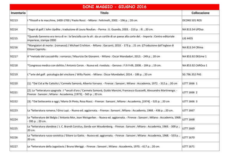 doni maggio - giugno 2016 - Biblioteca Civica Leonardo Lagorio di