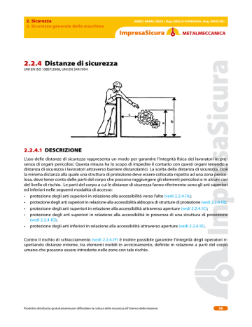 2. Sicurezza 2. Sicurezza generale delle macchine | EBER | EBAM | INAIL | Reg. Emilia Romagna | Reg. Marche | 2.2.4 Distanze di sicurezza UNI EN ISO 13857:2008, UNI EN 349:1994 2.2.4.1 Descrizione L’uso delle distanze di sicurezza rappresenta un modo per garantire l’integrità fisica dei lavoratori in presenza di organi pericolosi. Questa misura ha lo scopo di impedire il contatto con questi organi tenendo a distanza di sicurezza i lavoratori attraverso barriere distanziatrici. La scelta della distanza di sicurezza, cioè la minima distanza alla quale una struttura di protezione deve essere collocata rispetto ad una zona pericolosa, deve tener conto delle parti del corpo che possono raggiungere gli elementi pericolosi e in alcuni casi del livello di rischio. Le parti del corpo a cui le distanze di sicurezza fanno riferimento sono gli arti superiori ed inferiori nelle seguenti modalità di accesso: • protezione degli arti superiori in relazione alla accessibilità verso l’alto (vedi 2.2.4.1A); • protezione degli arti superiori in relazione alla accessibilità aldisopra di strutture di protezione (vedi 2.2.4.1B); • protezione degli arti superiori in relazione alla accessibilità attraverso aperture (vedi 2.2.4.1C); • protezione degli arti superiori in relazione alla accessibilità in presenza di una struttura di protezione (vedi 2.2.4.1D); • protezione degli arti inferiori in relazione alla accessibilità attraverso aperture (vedi 2.2.4.1E). Contro il rischio di schiacciamento (vedi 2.2.4.1F) è inoltre possibile garantire l’integrità degli operatori rispettando distanze minime, tra elementi mobili in avvicinamento, definite in relazione a parti del corpo umano che possono essere introdotte nelle zone con tale rischio. Prodotto distribuito gratuitamente per diffondere la cultura della sicurezza all’interno delle imprese. 36 2. Sicurezza 2. Sicurezza generale delle macchine | EBER | EBAM | INAIL | Reg. Emilia Romagna | Reg. Marche | 2.2.4.1A Protezione degli arti Superiori, in relazione alla accessibilità verso l’alto Zona pericolosa h Piano di riferimento L’altezza degli elementi pericolosi dal piano di riferimento in relazione al livello di rischio, deve essere: • h maggiore o uguale a 2500 mm in condizioni di rischio ridotto; • h maggiore o uguale a 2700 mm in condizioni di rischio elevato. Nel caso gli organi pericolosi siano posti ad altezze inferiori a quelle indicate il contatto deve essere evitato installando ad esempio ripari di protezione (vedi 2.2.3. “Ripari”). 2.2.4.1B Protezione degli arti Superiori, in relazione alla accessibilità aldisopra di strutture di protezione Per un corretto posizionamento o dimensionamento di strutture di protezione quali sono le barriere distanziatrici è necessario considerare tre aspetti: a) altezza della zona pericolosa; b) altezza della struttura di protezione; c) distanza orizzontale dalla zona pericolosa. Nel disegno sottostante le tre misure citate come a, b e c sono rappresentate graficamente. Identificati i valori sopra specificati è possibile prendere in esame i prospetti al seguito riportati per verificare o definire il corretto posizionamento o dimensionamento delle strutture di protezione. Il primo prospetto è da utilizzare in caso di rischio ridotto (rischio di attrito, abrasione comunque di danno senza esiti permanenti), il secondo in caso di rischio elevato (rischio di trascinamento, amputazione o comunque di danno con possibili esiti permanenti). Prodotto distribuito gratuitamente per diffondere la cultura della sicurezza all’interno delle imprese. 37 2. Sicurezza 2. Sicurezza generale delle macchine | EBER | EBAM | INAIL | Reg. Emilia Romagna | Reg. Marche | Prospetto I - Rischio ridotto Altezza della zona pericolosa a Altezza della struttura di protezione b 1.000 1.200 1.400 1.600 1.800 2.000 2.200 2.400 100 2.500 Distanza orizzontale dalla zona pericolosa c 2.500 2.400 100 100 100 100 100 100 100 2.200 600 600 500 500 400 350 250 2.000 1.100 900 700 600 500 350 1.800 1.100 1.000 900 900 600 1.600 1.300 1.000 900 900 500 1.400 1.300 1.000 900 800 100 1.200 1.400 1.000 900 500 1.000 1.400 1.000 900 300 800 1.300 900 600 600 1.200 500 400 1.200 300 200 1.100 200 0 1.100 200 1) Non sono considerate le strutture di protezione di altezza minore di 1.000 mm perchè non limitano sufficientemente il movimento del corpo. I valori delle distanze desunti dal prospetto non devono mai essere interpolati tra di loro ma, nel caso si debba scegliere tra più valori, deve sempre essere utilizzato quello che fornisce il livello di sicurezza più elevato (vedi appendice 1 “Utilizzo dei prospetti I e II per l’accessibilità al di sopra di strutture di protezione con gli arti superiori”). Prodotto distribuito gratuitamente per diffondere la cultura della sicurezza all’interno delle imprese. 38 2. Sicurezza 2. Sicurezza generale delle macchine | EBER | EBAM | INAIL | Reg. Emilia Romagna | Reg. Marche | Prospetto II - Rischio elevato Altezza della zona pericolosa a Altezza della struttura di protezione b 1) 1.000 1.200 1.4002) 1.600 1.800 2.000 2.200 2.400 2.500 2.700 Distanza orizzontale dalla zona pericolosa c 2.700 2.600 900 800 700 600 600 500 400 300 100 2.400 1.100 1.000 900 800 700 600 400 300 100 2.200 1.300 1.200 1.000 900 800 600 400 300 2.000 1.400 1.300 1.100 900 800 600 400 1.800 1.500 1.400 1.100 900 800 600 1.600 1.500 1.400 1.100 900 800 500 1.400 1.500 1.400 1.100 900 800 1.200 1.500 1.400 1.100 900 700 1.000 1.500 1.400 1.000 800 800 1.500 1.300 900 600 600 1.400 1.300 800 400 1.400 1.200 400 200 1.200 900 0 1.100 500 1) Non sono considerate le strutture di protezione di altezza minore di 1.000 mm perchè non limitano sufficientemente il movimento del corpo. 2) Non si dovrebbero usare le strutture di protezione di altezza minore di 1.400 mm senza misure di sicurezza aggiuntive. I valori delle distanze desunti dal prospetto non devono mai essere interpolati tra di loro ma, nel caso si debba 