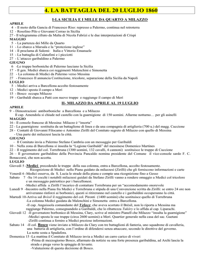 4. LA BATTAGLIA DEL 20 LUGLIO 1860 I-LA SICILIA E I MILLE DA QUARTO A MILAZZO APRILE 4 - Il moto della Gancia di Francesco Riso: represso a Palermo, continua nel retroterra 12 - Rosolino Pilo e Giovanni Corrao in Sicilia 27 - Il telegramma cifrato da Malta di Nicola Fabrizi e le due interpretazioni di Crispi MAGGIO 5 - La partenza dei Mille da Quarto 11 - Lo sbarco a Marsala e la “protezione inglese” 14 - Il proclama di Salemi: Italia e Vittorio Emanuele 15 - La battaglia di Calatafimi e i picciotti 27 - L’attacco garibaldino a Palermo GIUGNO 6 -Le truppe borboniche di Palermo lasciano la Sicilia 17 - Il gen. Medici sbarca coi reggimenti Malenchini e Simonetta 22 - La colonna di Medici da Palermo verso Messina 27 - Francesco II annuncia Costituzione, tricolore, separazione della Sicilia da Napoli LUGLIO 5 - Medici arriva a Barcellona accolto festosamente 12 - Medici sposta il campo a Merì 15 - Bosco occupa Milazzo 19 - Garibaldi sbarca a Patti con nuove truppe e raggiunge il campo di Merì II- MILAZZO DA APRILE AL 19 LUGLIO APRILE 9 - Dimostrazioni antiborboniche a Barcellona e a Milazzo Il cap. Amendola si chiude nel castello con la guarnigione di 150 uomini. Allarme notturno… per gli asinelli MAGGIO 16 - Il console francese di Messina: Milazzo è “insorta” 22 - La guarnigione sostituita da un battaglione di linea e da una compagnia di artiglieria (700 u.) del magg. Cuccione 28 - Contatti di Giovanni Filocamo e Antonino Zirilli del Comitato segreto di Milazzo con quello di Messina - Una parte dei milazzesi lascia la città. GIUGNO – Il Comitato invia a Palermo Stefano Cambria con un messaggio per Garibaldi 10 – Nella zona di Barcellona si insedia la “Legione Garibaldi” del messinese Domenico Martines 22 – Il reggimento del col. Torrebruna (1300 uomini, 132 cavalli, 4 cannoni) sostituisce le truppe di Cuccione 26 – Il governatore garibaldino della Provincia Pancaldo nomina presidente del Comune il vice-console sardo F. C. Bonaccorsi, che non accetta. LUGLIO Giovedì 5 -Medici precedendo le truppe della sua colonna, entra a Barcellona, accolto festosamente. Ricognizione di Medici nella Piana guidato da milazzesi (Zirilli) che gli forniscono informazioni e carte Venerdì 6 -Medici osserva, da S. Lucia le strade della piana e compie una ricognizione fino a Gesso Sabato 7 -Su 14 cocchi i notabili milazzesi guidati da Stefano Zirilli vanno a rendere omaggio a Medici col tricolore e un messaggio patriottico per i barcellonesi. -Medici affida a Zirilli l’incarico di contattare Torrebruna per un “accomodamento onorevole Lunedì 9 -Incontro nella Piana fra Medici e Torrebruna e stipula di una Convenzione scritta da Zirilli: se entro 24 ore non arriveranno rinforzi ai borbonici, questi si ritireranno nel castello e i garibaldini occuperanno la città. Martedì 10-Arriva sul Brésil il reggimento del col. Pironti (1400 uomini) che sostituisce quello di Torrebruna -La colonna Medici guidata da Malenchini e Simonetta entra a Barcellona. -Il cap. Anguissola comandante del Veloce, che aveva scortato il Brésil, non lo riporta a Messina ma raggiunge Palermo, consegnandolo a Garibaldi, che lo ribattezza Tuköry e lo affida al cap. Liparachi. Giovedì 12 -Il governatore borbonico di Messina, Clary, scrive al ministro Pianell che Milazzo “insulta la guarnigione” -Medici sposta le sue truppe (circa 2600 uomini) a Merì. Quartier generale nella casa del sac. Gaetani -Zirilli continua a fornire a Medici preziose informazioni. Sabato 14 -Il col. Bosco viene inviato a Milazzo da Clary con tre battaglioni di fanteria, uno squadrone di cavalleria, una batteria di artiglieria, con l’ordine di difendersi senza attaccare, secondo le direttive del governo. La notte sosta a Spadafora. Domenica 15 -La mattina il Comitato di Milazzo invia a Medici un carro carico di viveri -Prima di mezzogiorno Bosco, allarmato da notizie su una forte presenza garibaldina, ad Archi lascia la strada e piega verso la spiaggia di levante. -Valutazione di questa decisione di Bosco. -A mezzogiorno i milazzesi vedono la colonna Bosco avvicinarsi lungo la spiaggia di ponente, e tutti, tranne il Comitato segreto e i consoli dei paesi stranieri, lasciano rapidamente la città -per terra e per marerifugiandosi al Capo. Gravi disagi e fame. -Bosco entra nella città deserta: il Quartier generale a S. Francesco, le truppe al Quartiere e a S. Papino. -Requisizione di viveri e di alloggi per gli ufficiali Lunedì 16 -Bosco requisisce due mulini a levante Martedì 17-Bosco proclama lo stato d’assedio e il coprifuoco e assicura il rispetto di beni e persone. Mercoledì 18 -Bosco annuncia la concessione della Costituzione e invita i milazzesi a rientrare fiduciosi in città Martedì 17 -Notte: ricognizione dei garibaldini verso Milazzo e breve fuoco di fucileria. Battaglia di Corriolo -Mattina: il magg. Maringh con 1500 uomini e 70 cavalli va a occupare Archi. Scontro coi garibaldini a Corriolo. Ritirata con prigionieri. L’ira di Bosco per il ritiro. -Pomeriggio: il col. Marra torna a occupare Archi. Nuovo scontro coi garibaldini a Corriolo. -Notte: Bosco raggiumge il contingente ad Archi e poi ordina il ritiro. - Due “vittorie” borboniche seguite da due ritirate ? Mercoledì 18 -Cosenz arriva a Merì sotto rovesci di pioggia. Tornato il sereno,c’è un ecclisse di sole. -Ricognizione di Bosco al Capo e presidio di 400 uomini -I milazzesi inviano un carro di viveri ai garibaldini a Merì -Le popolane Francesca Garufi e Santa Palermo beffano i borbonici portando munizioni a Merì. -Garibaldi parte da Palermo sulla “City of Aberdeen” Giovedì 19 -Ricognizione di Bosco nella Piana e collocazione di avamposti. -Notte: Garibaldi nella notte sbarca a Patti con 2000 uomini; -Mattina, precedendo le truppe, passa festeggiatissimo per Barcellona, e si insedia a Merì; raggiunge a S. Lucia Medici e Cosenz, osserva il futuro campo di battaglia, pranza coi frati, -Sera: Garibaldi rientra a Merì; cena, promuove Medici,