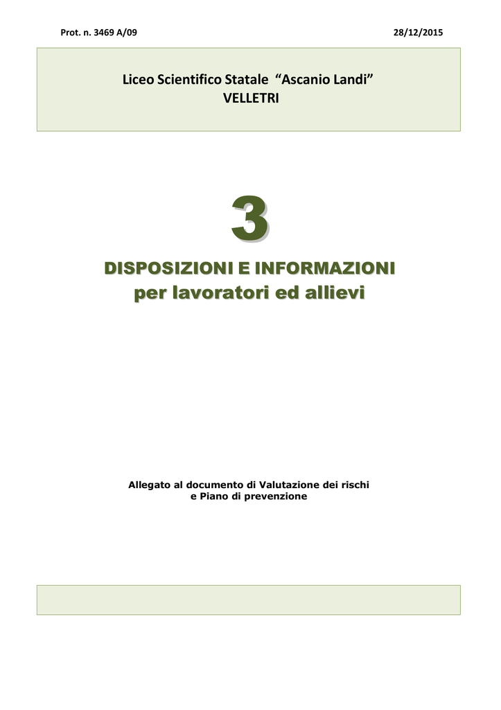 Prot. n. 3469 A/09 28/12/2015 Liceo Scientifico Statale “Ascanio Landi” VELLETRI 3 DISPOSIZIONI E INFORMAZIONI per lavoratori ed allievi Allegato al documento di Valutazione dei rischi e Piano di prevenzione Sommario Premessa ....................................................................................................... 3 informazioni generali ..................................................................................... 4 L’organizzazione aziendale per la prevenzione ....................................................... 6 Aspetti normativi per i lavoratori ......................................................................... 8 Disposizioni aziendali di prevenzione .................................................................... 8 Disposizioni per l’uso di macchine ed attrezzature manuali o elettriche ................... 10 Disposizioni per la movimentazione manuale di carichi ......................................... 10 Disposizioni per l’utilizzo di apparecchiature dotate di videoterminale .................... 11 Disposizioni per i rischi derivanti dall’ambiente di lavoro ....................................... 11 Disposizioni per l’uso di sostanze pericolose ........................................................ 12 Disposizioni relative alle pratiche di lavoro .......................................................... 13 La normativa di riferimento .............................................................................. 17 Informazioni per gli allievi ........................................................................... 18 I rischi in ambiente scolastico ........................................................................... 18 Schede informative sulle situazioni di rischio ............................................... 22 Arredi, macchine, attrezzature e materiali d’uso comune ...................................... 22 Laboratori ...................................................................................................... 25 Rischio Elettrico .............................................................................................. 28 Agenti chimici (uso di sostanze pericolose) ......................................................... 30 Videoterminali ................................................................................................ 33 Movimentazione manuale dei carichi .................................................................. 37 Agenti biologici ............................................................................................... 40 Stress e rischi psicosociali da lavoro correlato ..................................................... 41 Informazione sui rischi propri dell’attività in generale ................................. 45 Rischi per la sicurezza ...................................................................................... 45 Rischi per la salute .......................................................................................... 51 Rischi propri della mansione ....................................................................... 56 Assistente amministrativo/DSGA ....................................................................... 55 Docente ......................................................................................................... 58 Collaboratore Scolastico ................................................................................... 65 Assistente Tecnico ........................................................................................... 68 Allievo ........................................................................................................... 69 2 PREMESSA Il presente documento, che è parte integrante del documento di Valutazione dei rischi e Piano di Prevenzione, è stato redatto allo scopo di fornire ai lavoratori, agli allievi ed a tutte le altre persone che, anche attività occasionalmente, svolgono la loro o sono comunque presenti presso l’istituzione scolastica, le informazioni minime sui temi dell’igiene e della sicurezza nei luoghi di lavoro, sulle istruzioni e le disposizioni emanate al fine di elevare gli standard qualitativi in materia di prevenzione e protezione dai rischi. Si tratta di una informazione di base, da completarsi con la lettura del documento di Valutazione dei rischi e Piano di prevenzione e del Piano di emergenza presenti nell’apposita “Bacheca per la sicurezza” istituita nell’atrio dell’edificio scolastico, nella consapevolezza che il rispetto delle norme di legge e delle disposizioni aziendali di prevenzione, non sia soltanto il modo di evitare sanzioni, ma il frutto di una adesione convinta e partecipata ad un progetto per l’affermazione o lo sviluppo di quella "cultura della sicurezza" che pone la vita e, conseguentemente, la tutela della salute e della sicurezza dello studente e del lavoratore, al centro del processo produttivo scolastico. Il documento è diviso in due parti; la prima, oltre alle informazioni sulla organizzazione aziendale della prevenzione, riporta le norme comportamentali da osservare ai fini della eliminazione o riduzione dei rischi rilevati la seconda è interamente dedicata alla informazione, con specifiche schede, sulle situazioni di rischio che possono essere presenti negli edifici scolastici o conseguenti alla attività che vi si svolgono. Il Dirigente Scolastico 3 INFORMAZIONI GENERALI L’emanazione del D. Lgs 81/2008 rappresenta un punto di svolta importante nella normativa delle relativa all’igiene ed alla sicurezza sul lavoro, riorganizzando la preesistente legislazione ed accentuando l’aspetto prevenzionistico. Tale strumento legislativo, nella sue disposizioni generali di prevenzione, dispone una serie di obblighi a carico dei diversi soggetti che operano nel posto di lavoro, obblighi che potremmo riassumere in tre diversi filoni: organizzativi procedurali documentali L’organizzazione della prevenzione Il Datore di lavoro h