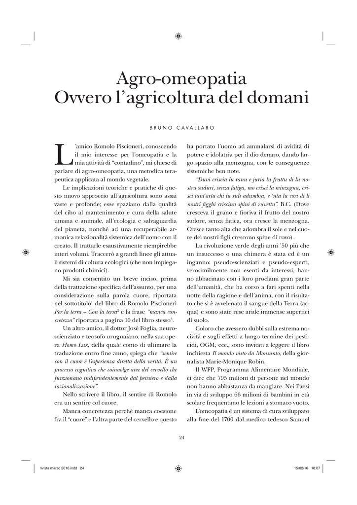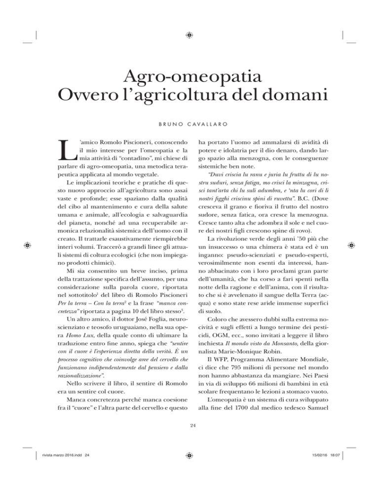 Agro-omeopatia Ovvero l’agricoltura del domani B R U N O C AVA L L A R O L ’amico Romolo Piscioneri, conoscendo il mio interesse per l’omeopatia e la mia attività di “contadino”, mi chiese di parlare di agro-omeopatia, una metodica terapeutica applicata al mondo vegetale. Le implicazioni teoriche e pratiche di questo nuovo approccio all’agricoltura sono assai vaste e profonde; esse spaziano dalla qualità del cibo al mantenimento e cura della salute umana e animale, all’ecologia e salvaguardia del pianeta, nonché ad una recuperabile armonica relazionalità sistemica dell’uomo con il creato. Il trattarle esaustivamente riempirebbe interi volumi. Traccerò a grandi linee gli attuali sistemi di coltura ecologici (che non impiegano prodotti chimici). Mi sia consentito un breve inciso, prima della trattazione specifica dell’assunto, per una considerazione sulla parola cuore, riportata nel sottotitolo1 del libro di Romolo Piscioneri Per la terra – Con la terra 2 e la frase “manca concretezza” riportata a pagina 10 del libro stesso3. Un altro amico, il dottor José Foglia, neuroscienziato e teosofo uruguaiano, nella sua opera Homo Lux, della quale conto di ultimare la traduzione entro fine anno, spiega che “sentire con il cuore è l’esperienza diretta della verità. È un processo cognitivo che coinvolge aree del cervello che funzionano indipendentemente dal pensiero e dalla razionalizzazione”. Nello scrivere il libro, il sentire di Romolo era un sentire col cuore. Manca concretezza perché manca coesione fra il “cuore” e l’altra parte del cervello e questo ha portato l’uomo ad ammalarsi di avidità di potere e idolatria per il dio denaro, dando largo spazio alla menzogna, con le conseguenze sistemiche ben note. “Duvi criscia lu ranu e juria lu fruttu di lu nostru suduri, senza fatiga, mo crisci la minzogna, crisci tant’arta chi lu suli adumbra, e ‘nta lu cori di li nostri figghi criscinu spini di ruvettu”. B.C. (Dove cresceva il grano e fioriva il frutto del nostro sudore, senza fatica, ora cresce la menzogna. Cresce tanto alta che adombra il sole e nel cuore dei nostri figli crescono spine di rovo). La rivoluzione verde degli anni ’50 più che un insuccesso o una chimera è stata ed è un inganno: pseudo-scienziati e pseudo-esperti, verosimilmente non esenti da interessi, hanno abbacinato con i loro proclami gran parte dell’umanità, che ha corso a fari spenti nella notte della ragione e dell’anima, con il risultato che si è avvelenato il sangue della Terra (acqua) e sono state rese aride immense superfici di suolo. Coloro che avessero dubbi sulla estrema nocività e sugli effetti a lungo termine dei pesticidi, OGM, ecc., sono invitati a leggere il libro inchiesta Il mondo visto da Monsanto, della giornalista Marie-Monique Robin. Il WFP, Programma Alimentare Mondiale, ci dice che 795 milioni di persone nel mondo non hanno abbastanza da mangiare. Nei Paesi in via di sviluppo 66 milioni di bambini in età scolare frequentano le lezioni a stomaco vuoto. L’omeopatia è un sistema di cura sviluppato alla fine del 1700 dal medico tedesco Samuel 24 rivista marzo 2016.indd 24 15/02/16 18:07 Bruno Cavallaro (a destra) con il Presidente Internazionale della Società Teosofica Tim Boyd. Hanehmann. Essa si basa su leggi e principi immutabili, la prima delle quali è la legge di similitudine (similia similibus curentur): il simile curi il simile. Le sperimentazioni omeopatiche sono fatte su volontari sani, con il sistema del doppio cieco, cioè né lo sperimentatore né il medico che lo segue conoscono quale sia la sostanza assunta. Qualunque sostanza, data in dosi sub-tossiche a una persona sana, causa un determinato quadro patogenico, a livello fisico e psico-emotivo, generale e particolare; quella stessa sostanza, in dosi altamente diluite e dinamizzate, cura l’ammalato con un quadro morboso simile. Il rimedio omeopatico, quando è simillimum, cioè quando il quadro patogenico prodotto da quel rimedio nella sperimentazione è sovrapponibile alla sindrome morbosa che presenta l’ammalato, raggiunge le profondità dell’essere, le origini della forza vitale, agendo a 360 gradi, ripristinando l’omeostasi e cancellando ogni traccia di malattia. In Italia, con alterne fortune, l’omeopatia è praticata fin dal 1829 e oggi è usata, assieme ad altre medicine non convenzionali, da circa 10 milioni di persone con scolarità medio alta. In Francia, Germania e altri Paesi europei è riconosciuta dai rispettivi sistemi sanitari. L’Inghilterra vi destina il 40% del budget sanitario, cioè 40 miliardi di euro. In Italia, attualmente, solo la Regione Toscana l’ha inserita nei LEA, livelli essenziali di assistenza, unitamente alla fitoterapia e all’agopuntura. Essa è fortemente avversata dalla medicina ufficiale, ancorata a obsoleti concetti materialistici perché, secondo la legge di Avogadro, dopo la nona diluizione centesimale, nel soluto non v’è traccia della sostanza di partenza. Ragione per la quale la medicina “ufficiale” attribuisce le guarigioni omeopatiche all’effetto placebo, senza tener conto che i neonati, le persone in coma, gli animali e le piante non hanno la “facoltà” di autosuggestionarsi, eppure guariscono egregiamente! A dispetto dello scetticismo di costoro va rilevato che i decennali studi del dottor Masaru Emoto sui cristalli d’acqua dimostrano che il pensiero agisce sulla materia fisica. Recentemente, la Scuola Superiore Sant’Anna di Pisa ha prodotto una mano bionica che si innesta senza chirurgia e si comanda con il pensiero. Oggi, la fisica quantistica e la microbiologia 25 rivista marzo 2016.indd 25 15/02/16 18:07 molecolare, come molti sanno, ci dicono che oltre l’atomo, protoni, neutroni ecc. c’è l’energia, un’energia sottile non misurabile con gli strumenti al momento disponibili e, sottesa a tale energia, v’è una forma di intelligenza. “Il movimento delle particelle di un atomo, della 
