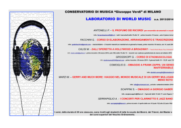 CONSERVATORIO DI MUSICA “Giuseppe Verdi” di MILANO LABORATORIO DI WORLD MUSIC ANTONELLI F. – IL PROFUMO DEI RICORDI a.a. 2013/2014 per ensemble strumentali e vocali info: [email protected] – tutti i mercoledi dalle 10 alle 14 - primo incontro 12 marzo , aula 4 (piano terra) FACCHINI G. - CORSO DI ELABORAZIONE, ARRANGIAMENTO E TRASCRIZIONE info: [email protected] - marzo/ottobre – 2 incontri mensili (un martedi ed un giovedi al mese), primo incontro 18 marzo, ore 14, aula 204 CALISI M. - DALL'OPERETTA A HOLLYWOOD A BROADWAY - "Verdi World Music Pop Orchestra" info: [email protected] - primo incontro: 28 marzo 2014, aula 108, dalle 10 alle 13 - incontri con cadenza quindicinale da marzo ad ottobre 2014 GROSSKOPF G. - CORSO DI ETNOMUSICOLOGIA info: [email protected] - primo incontro: 20 marzo 2014 - il giovedì dalle 14 – 15,30 aula 110 COMOGLIO D. - OMAGGIO A FRANK ZAPPA: UN GENIO INAFFERRABILE info: [email protected] MARZI M. – GERRY AND MUCH MORE: VIAGGIO NEL MONDO MUSICALE DI UN GERRY MULLIGAN MENO NOTO info: [email protected] - periodo: settembre/ottobre 2014 SCAPPINI S. – OMAGGIO A GIORGIO GABER info: [email protected] – il giovedi dalle 14 alle 17, aula Organo 1 SERRAPIGLIO A. - I CONCERTI PER CLARINETTO E JAZZ BAND info: [email protected] - primo incontro 8 aprile dalle ore 18 (aula 112) alle 22 (aula 106) I corsi, della durata di 30 ore ciascuno, sono rivolti agli studenti di tutte le scuole dei Bienni, dei Trienni, dei Master e dei corsi superiori del Vecchio Ordinamento.