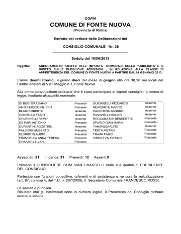 COPIA COMUNE DI FONTE NUOVA (Provincia di Roma) Estratto del verbale delle Deliberazioni del CONSIGLIO COMUNALE Nr. 36 _____________________________________ Seduta del 10/06/2013 Oggetto: ADEGUAMENTO TARIFFE DELL' IMPOSTA COMUNALE SULLA PUBBLICITA' E IL DIRITTO SULLE PUBBLICHE AFFISSIONI , IN RELAZIONE ALLA CLASSE DI APPERTENENZA DEL COMUNE DI FONTE NUOVA A PARTIRE DAL 01 GENNAIO 2013. L'anno duemilatredici, il giorno dieci del mese di giugno alle ore 10,20 nei locali del Centro Anziani di Via I Maggio n.1, Fonte Nuova. Alla prima convocazione ordinaria che è stata partecipata ai signori consiglieri a norma di legge, risultano all'appello nominale: _______________________________________________________________________ DI BUO' GRAZIANO ANTONUCCIO FILIPPO BLASI ROBERTO CANNELLA FABIO CHIARINELLI REMO DE PARI ANTONIO DURANTINI AGOSTINO FALCIONI UMBERTO FLORIDI CLAUDIO FRANGELLA ANNA TERESA GRASSELLI IVAN Assegnati: 21 In carica: 21 Presente Presente Assente Assente Assente Presente Assente Presente Presente Presente Presente Presenti: 12 GUIDARELLI RICCARDO MERCANTE MARCO PACCHERA SANDRO PAGANELLI MAURO ROCCAMATISI BENEDETTO SPURIO GIAN MARIA TANGREDI ALFIO TESTA PIETRO TRAINI FABIO VIRGILI VALENTINO Assente Assente Assente Assente Presente Presente Assente Presente Presente Presente Assenti:9 Presiede il CONSIGLIERE COM IVAN GRASSELLI nella sua qualità di PRESIDENTE DEL CONSIGLIO. Partecipa con funzioni consultive, referenti e di assistenza e ne cura la verbalizzazione (art. 97, comma 4, del T.U. n. 267/2000), il Segretario Comunale FRANCESCO ROSSI. La seduta è pubblica. Risultato che gli intervenuti sono in numero legale, il Presidente del Consiglio dichiara aperta la seduta. COMUNE DI FONTE NUOVA (Provincia di Roma) Omissis (Discussione Registrata) Illustra la proposta di deliberazione il Responsabile del Servizio Entrate Tributarie Mario Lettieri Barbato. Anche qui si precisa una piccola rettifica relativa al termine di approvazione del Bilancio di Previsione passato dal 30 giugno al 30 settembre 2013 (D.L. 35/2013 convertito in Legge n. 64 del 06/06/2013). IL CONSIGLIO COMUNALE Visto il capo 1° del D. Lgs. 15.11.1993 n. 507. concernente la disciplina dell'imposta comunale sulla pubblictà e il diritto sulle pubbliche affissioni; - - Visti gli artt. 42 e 48 del D.Lgs. 267/2000, in ordine alle competenze in materia di determinazione delle tariffe dei tributi comunali; - Vista la deliberazine del Commissario Prefettizio con la quale vengono approvate, a partire dal 1 gennaio 2002, le tariffe dell'imposta comunale sulla pubblicità e il diritto sulle pubbliche affissioni, in relazione alla categoria di appertenenza del Comune di Fonte Nuova "IV Classe" Comune da oltre 10.000 fino a 30.000 abitanti"; - Vista la nota del Sindaco del 29 Aprile 2013 prot. 10254, con la quale dichiara, in relazione al Decreto del Presidente della Repubblica del 6 novembre 2012 "Determinazione della popolazione legale della Repubblica in base al 15° censimento Generale della popolazione e delle abitazioni del 09 ottobre 2011, pubblicato sulla Gazzetta ufficiale del 18 dicembre 2012, la popolazione presente al Comune di Fonte Nuova al 15° Censimento Generale risulta essere di n. 30.572 (trentamilacinquecentosettantadue) abitanti residenti; - Dato atto che l'art. 2, comma 1à del D.Lgs. n. 507/93 stabilisce che i Comuni sono ripartiti in base alla popolazione residente al 31 dicembre del penultimo anno a quello in corso, nelle seguenti cinque calssi: Classe Classe Classe Classe Classe I: Comuni con oltre II: Comuni con oltre III: Comuni con oltre IV :Comuni con oltre V: Comuni fino a 500.000 abitanti; 100.000 fino a 500.000 abitanti; 30.000 fino a 100.000 abitanti; 10.000 fino a 30.000 abitanti; 10.000 abitanti; - Considerato che il Comune di Fonte Nuova, ha subito in relazione al 15° Censimento generale una variazione della popolazione residente al 09 ottobre 2011 un incremento demografico che di conseguenza determina una variazione di appartenenza del Comune alla III CLASSE "Comune da oltre 30.000 fino a 100.000 abitanti; - Preso atto, che occorre applicare per l'anno 2013 le tariffe dell'imposta comunale sulla pubblicità e dei diritti sulle pubbliche affissioni, secondo le disposizioni contenute nel D.Lgs n. 507/1993 in merito alla nuova classificazione demografica del Comune di Fonte Nuova; - Ritenuto pertanto adeguare le tariffe dell'imposta comunale sulla pubblicità e del diritto sulle pubbliche affissioni alla attuale classe di appartenenza del Comune di Fonte Nuova "III CLASSE " ; - Visto il regolameto Comunale per l'applicazione dell'imposta comunale sulla Pubblicità e dei diritti sulle pubbliche affissioni approvato con delibera consiliare n. 57 del 02.05.2006; - Visto l'art. 27, comma 16, della legge 28.12.2001 n. 448, che prevede il differimento del termine per l'adozione delle deliberazioni per la determinazione delle tariffe delle aliquote di imposte per i tributi locali e per i servizi locali entro la data di approvazione del bilancio di previsione; - Visto il D.L. n. 35/2013 convertito in Legge n. 64 del 06.06.2013, con il quale è stato prorogato al 30.09.2013 il termine per l'approvazione del Bilancio di Previsione; - Acquisiti i pareri previsti dall’art. 49, 1 comma D.Lgs 267/2000 che si allegano alla presente deliberazione; - Con voti unanimi Delibera 1) di adeguare, per le motivazioni espresse in premessa, le tariffe dell'imposta comunale sulla pubblicità e del diritto sulle pubbliche affisioni alla attuale categoria di appertenenza del Comune di Fonte Nuova " Classe III Comuni dal oltre 30.000 abitanti fino a 100.00. abitanti," nelle misure stabilite dal D.Lgs n. 507/1993; 2) di approvare le tariffe riguardanti l'imposta comunale sulla pubblicità e del diritto sulle pubbliche affissioni, come da prospetto allegato alla presente deliberazione, di cui ne fa parte integrale e sostanziale; 3) di rettificare l'art. 20 comma 1 rigo terzo del Regolamento Comunale per l'applicazione de