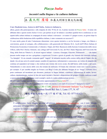 Piazza Italia incontri sulla lingua e la cultura italiana 在 義大利 廣場 和義大利語言與文化相遇 Caro Studente/essa, Amico/a dell’Italia, Amico/a italiano/a, allora, grazie alla partecipazione e alla simpatia di oltre 70 fra di voi, il primo incontro di Piazza Italia - il nome che abbiamo dato a questo nostro Italian Corner, per parlare un po’ di italiano e ascoltare qualche breve conferenza su vari aspetti della cultura italiana in compagnia di amici italiani e taiwanesi - avvenuto il 3 giugno scorso, un giorno dopo la celebrazione della fondazione della repubblica italiana, è stato veramente un successo!!! Vi sono molto grata di tutto l’entusiasmo dimostrato verso questa iniziativa a cui ho lavorato a lungo, con fiducia e convinzione, grazie al sostegno, alla collaborazione e alla generosità del Ministro M.A. Accili dell’Ufficio Italiano di Promozione Economica Commerciale e Culturale a Taipei, del Dott. Buonocore della Sezione Commerciale dello stesso Ufficio, della Prof. Dorina Alimonti, mia collega dell’Università Fu Jen, del Prof. Dante Majorana dell’Università Shi Xing, della Dott.ssa Vittoria Li, di alcuni ragazzi italiani – Lorenzo, Giuseppe, Giacomo, Emmanuele …. - che hanno passato molto tempo con me a progettare e organizzare l’evento e grazie al grande chef Antonio del ristorante italiano “La famiglia”. Si sta creando veramente quell’ “angolo” di italianità inserito nella cornice della città di Taipei, che sta dando vita ad una serie di contatti umani, scambio di esperienze, informazioni e conoscenze, un vortice di simpatia che continua ad espandersi nel tempo e che realizza una visione che avevo avuto, fin dall’inizio, nella mente e nel cuore. Naturalmente ci sono ancora delle cose che restano da realizzare. Il Forum che volevamo creare non è ancora partito, per esempio. E poi sarebbe meglio un Forum o un Blog? Credo che abbiamo bisogno di un “luogo” (virtuale) dove poter continuare ad incontrarci per discutere, praticare la lingua italiana, scambiarci informazioni di studio, lavoro, cultura, intrattenimento, mettere le foto dei nostri incontri e lasciare a disposizione del gruppo il nostro indirizzo e-mail e numero di telefono. Aspettiamo vostri consigli e anche la vostra collaborazione tecnica… Ma arriviamo al punto: quando sarà il prossimo appuntamento di Piazza Italia??? Tra pochissimo!!!!! E stavolta l’appuntamento è tutto sul cinema e con ospiti d’eccezione!!! Spargete la voce!!! Domenica 15 luglio, ore 13.30~17.00, presso il ristorante italiano “La Famiglia” (Taipei, Dunhua South Rd. Sec.1, Lane 177, N. 47 台北市敦化南路一段 177 巷 47 號, Tel. 02- 87714163). Come iscriversi? È semplicissimo: basta mandare un’email all’indirizzo [email protected] con il testo “Intendo partecipare all’Italian Corner che si terrà il 15 luglio presso il ristorante italiano la Famiglia” con il tuo nome e cognome (in italiano e in cinese) e numero di telefono. e il gioco è fatto!!! Attenzione! L'iscrizione deve essere individuale, non verranno accettate iscrizioni cumulative. Vuoi un consiglio? Affrettati!!! L’ingresso stavolta sarà rigorosamente riservato ai primi 50 iscritti. Antonella Tulli (Dipartimento di Italiano-Università Cattolica Fu Jen) Ecco il programma: Ore 13.30~14.30: • scambio linguistico tra i partecipanti (giochi linguistici per praticare l’italiano) a cura della Prof.ssa Dorina Alimonti Ore 14.30~15.05: • • breve presentazione del programma da parte del Ministro Accili e della Prof.ssa Tulli intervento del regista Hsiu Chin Liang, Presidente e CEO della Dream Craft Group, il quale parlerà dei suoi studi e della sua esperienza da regista in Italia Ore 15.05~15.30: • bevande e dolci preparati da Antonio e offerti dal Ministro Accili e dalla Prof.ssa Tulli Ore 15.30~16.00: • presentazione del fenomeno cinematografico degli Spaghetti Western da parte del Prof. Dante Majorana, con proiezione di spezzoni di film del regista Sergio Leone Ore 16.00~16.30: • intervento dell’attore Giorgio Wang, il quale condividerà con noi alcune esperienze vissute durante la sua lunga carriera di attore in Italia e nel mondo, con la proiezione di alcune scene di film da lui interpretati Ore 16.30~17.00: • estrazione dei 15 fortunati che riceveranno il libro di ricette italiane offerto dal Dott. Massimo Buonocore della Sezione Commerciale dell’Ufficio Italiano di Promozione Economica, Commerciale e Culturale • valutazione di questo secondo incontro e suggerimenti per i prossimi • conclusioni e saluti Ti aspettiamo!!!