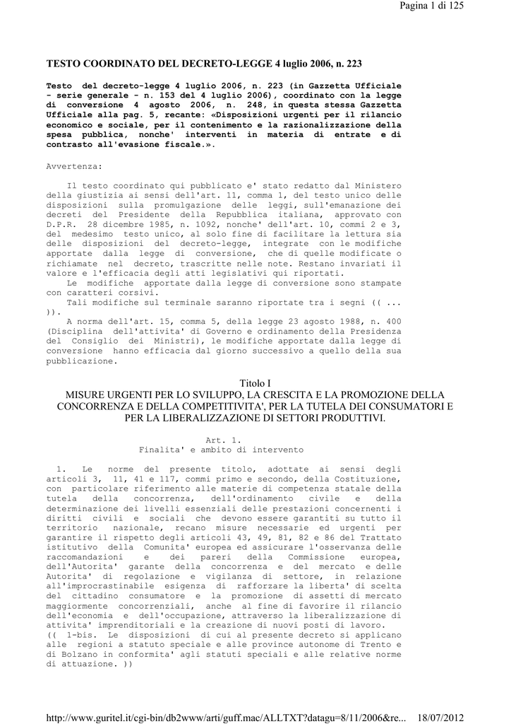 Pagina 1 di 125 TESTO COORDINATO DEL DECRETO-LEGGE 4 luglio 2006, n. 223 Testo del decreto-legge 4 luglio 2006, n. 223 (in Gazzetta Ufficiale - serie generale - n. 153 del 4 luglio 2006), coordinato con la legge di conversione 4 agosto 2006, n. 248, in questa stessa Gazzetta Ufficiale alla pag. 5, recante: «Disposizioni urgenti per il rilancio economico e sociale, per il contenimento e la razionalizzazione della spesa pubblica, nonche' interventi in materia di entrate e di contrasto all'evasione fiscale.». Avvertenza: Il testo coordinato qui pubblicato e' stato redatto dal Ministero della giustizia ai sensi dell'art. 11, comma 1, del testo unico delle disposizioni sulla promulgazione delle leggi, sull'emanazione dei decreti del Presidente della Repubblica italiana, approvato con D.P.R. 28 dicembre 1985, n. 1092, nonche' dell'art. 10, commi 2 e 3, del medesimo testo unico, al solo fine di facilitare la lettura sia delle disposizioni del decreto-legge, integrate con le modifiche apportate dalla legge di conversione, che di quelle modificate o richiamate nel decreto, trascritte nelle note. Restano invariati il valore e l'efficacia degli atti legislativi qui riportati. Le modifiche apportate dalla legge di conversione sono stampate con caratteri corsivi. Tali modifiche sul terminale saranno riportate tra i segni (( ... )). A norma dell'art. 15, comma 5, della legge 23 agosto 1988, n. 400 (Disciplina dell'attivita' di Governo e ordinamento della Presidenza del Consiglio dei Ministri), le modifiche apportate dalla legge di conversione hanno efficacia dal giorno successivo a quello della sua pubblicazione. Titolo I MISURE URGENTI PER LO SVILUPPO, LA CRESCITA E LA PROMOZIONE DELLA CONCORRENZA E DELLA COMPETITIVITA', PER LA TUTELA DEI CONSUMATORI E PER LA LIBERALIZZAZIONE DI SETTORI PRODUTTIVI. Art. 1. Finalita' e ambito di intervento 1. Le norme del presente titolo, adottate ai sensi degli articoli 3, 11, 41 e 117, commi primo e secondo, della Costituzione, con particolare riferimento alle materie di competenza statale della tutela della concorrenza, dell'ordinamento civile e della determinazione dei livelli essenziali delle prestazioni concernenti i diritti civili e sociali che devono essere garantiti su tutto il territorio nazionale, recano misure necessarie ed urgenti per garantire il rispetto degli articoli 43, 49, 81, 82 e 86 del Trattato istitutivo della Comunita' europea ed assicurare l'osservanza delle raccomandazioni e dei pareri della Commissione europea, dell'Autorita' garante della concorrenza e del mercato e delle Autorita' di regolazione e vigilanza di settore, in relazione all'improcrastinabile esigenza di rafforzare la liberta' di scelta del cittadino consumatore e la promozione di assetti di mercato maggiormente concorrenziali, anche al fine di favorire il rilancio dell'economia e dell'occupazione, attraverso la liberalizzazione di attivita' imprenditoriali e la creazione di nuovi posti di lavoro. (( 1-bis. Le disposizioni di cui al presente decreto si applicano alle regioni a statuto speciale e alle province autonome di Trento e di Bolzano in conformita' agli statuti speciali e alle relative norme di attuazione. )) http://www.guritel.it/cgi-bin/db2www/arti/guff.mac/ALLTXT?datagu=8/11/2006&re... 18/07/2012 Pagina 2 di 125 Disposizioni Art. 2. urgenti per la tutela della concorrenza nel settore dei servizi professionali 1. In conformita' al principio comunitario di libera concorrenza ed a quello di liberta' di circolazione delle persone e dei servizi, nonche' al fine di assicurare agli utenti un'effettiva facolta' di scelta nell'esercizio dei propri diritti e di comparazione delle prestazioni offerte sul mercato, dalla data di entrata in vigore del presente decreto sono abrogate le disposizioni legislative e regolamentari che prevedono con riferimento alle attivita' libero professionali e intellettuali: (( a) l'obbligatorieta' di tariffe )) fisse o minime ovvero il divieto di pattuire compensi parametrati al raggiungimento degli obiettivi perseguiti; (( b) il divieto, anche parziale, di svolgere pubblicita' informativa circa i titoli e le specializzazioni professionali, le caratteristiche del servizio offerto, nonche' il prezzo e i costi complessivi delle prestazioni secondo criteri di trasparenza e veridicita' del messaggio il cui rispetto e' verificato dall'ordine; c) il divieto di fornire all'utenza servizi professionali di tipo interdisciplinare da parte di societa' di persone o associazioni tra professionisti, fermo restando che l'oggetto sociale relativo all'attivita' libero-professionale deve essere esclusivo, che il medesimo professionista non puo' partecipare a piu' di una societa' e che la specifica prestazione deve essere resa da uno o piu' soci professionisti previamente indicati, sotto la propria personale responsabilita'. )) 2. Sono fatte salve le disposizioni riguardanti l'esercizio delle professioni reso nell'ambito del Servizio sanitario nazionale o in rapporto convenzionale con lo stesso, nonche' le eventuali tariffe massime prefissate in via generale a tutela degli utenti. (( Il giudice provvede alla liquidazione delle spese di giudizio e dei compensi professionali, in caso di liquidazione giudiziale e di gratuito patrocinio, sulla base della tariffa professionale. Nelle procedure ad evidenza pubblica, le stazioni appaltanti possono utilizzare le tariffe, ove motivatamente ritenute adeguate, quale criterio o base di riferimento per la determinazione dei compensi per attivita' professionali. 2-bis. All'articolo 2233 del codice civile, il terzo comma e' sostituito dal seguente: «Sono nulli, se non redatti in forma scritta, i patti conclusi tra gli avvocati ed i praticanti abilitati con i loro clienti che stabiliscono i compensi professionali».)) 3. Le disposizioni deontologiche e pattizie e i codici di autodisciplina che contengono le prescrizioni di cui al comma 1 sono adeguate, anche con l'adozione di misure a garanzia della qualita' delle prestazioni profe