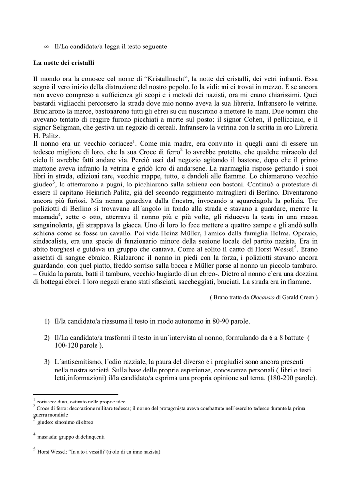 • Il/La candidato/a legga il testo seguente La notte dei cristalli Il mondo ora la conosce col nome di “Kristallnacht”, la notte dei cristalli, dei vetri infranti. Essa segnò il vero inizio della distruzione del nostro popolo. Io la vidi: mi ci trovai in mezzo. E se ancora non avevo compreso a sufficienza gli scopi e i metodi dei nazisti, ora mi erano chiarissimi. Quei bastardi vigliacchi percorsero la strada dove mio nonno aveva la sua libreria. Infransero le vetrine. Bruciarono la merce, bastonarono tutti gli ebrei su cui riuscirono a mettere le mani. Due uomini che avevano tentato di reagire furono picchiati a morte sul posto: il signor Cohen, il pellicciaio, e il signor Seligman, che gestiva un negozio di cereali. Infransero la vetrina con la scritta in oro Libreria H. Palitz. Il nonno era un vecchio coriacee1. Come mia madre, era convinto in quegli anni di essere un tedesco migliore di loro, che la sua Croce di ferro2 lo avrebbe protetto, che qualche miracolo del cielo li avrebbe fatti andare via. Perciò uscì dal negozio agitando il bastone, dopo che il primo mattone aveva infranto la vetrina e gridò loro di andarsene. La marmaglia rispose gettando i suoi libri in strada, edizioni rare, vecchie mappe, tutto, e dandoli alle fiamme. Lo chiamarono vecchio giudeo3, lo atterrarono a pugni, lo picchiarono sulla schiena con bastoni. Continuò a protestare di essere il capitano Heinrich Palitz, già del secondo reggimento mitraglieri di Berlino. Diventarono ancora più furiosi. Mia nonna guardava dalla finestra, invocando a squarciagola la polizia. Tre poliziotti di Berlino si trovavano all´angolo in fondo alla strada e stavano a guardare, mentre la masnada4, sette o otto, atterrava il nonno più e più volte, gli riduceva la testa in una massa sanguinolenta, gli strappava la giacca. Uno di loro lo fece mettere a quattro zampe e gli andò sulla schiena come se fosse un cavallo. Poi vide Heinz Müller, l´amico della famiglia Helms. Operaio, sindacalista, era una specie di funzionario minore della sezione locale del partito nazista. Era in abito borghesi e guidava un gruppo che cantava. Come al solito il canto di Horst Wessel5. Erano assetati di sangue ebraico. Rialzarono il nonno in piedi con la forza, i poliziotti stavano ancora guardando, con quel piatto, freddo sorriso sulla bocca e Müller porse al nonno un piccolo tamburo. – Guida la parata, batti il tamburo, vecchio bugiardo di un ebreo-. Dietro al nonno c´era una dozzina di bottegai ebrei. I loro negozi erano stati sfasciati, saccheggiati, bruciati. La strada era in fiamme. ( Brano tratto da Olocausto di Gerald Green ) 1) Il/la candidato/a riassuma il testo in modo autonomo in 80-90 parole. 2) Il/La candidato/a trasformi il testo in un´intervista al nonno, formulando da 6 a 8 battute ( 100-120 parole ). 3) L´antisemitismo, l´odio razziale, la paura del diverso e i pregiudizi sono ancora presenti nella nostra società. Sulla base delle proprie esperienze, conoscenze personali ( libri o testi letti,informazioni) il/la candidato/a esprima una propria opinione sul tema. (180-200 parole). 1 coriaceo: duro, ostinato nelle proprie idee Croce di ferro: decorazione militare tedesca; il nonno del protagonista aveva combattuto nell´esercito tedesco durante la prima guerra mondiale 3 giudeo: sinonimo di ebreo 2 4 5 masnada: gruppo di delinquenti Horst Wessel: “In alto i vessilli”(titolo di un inno nazista)