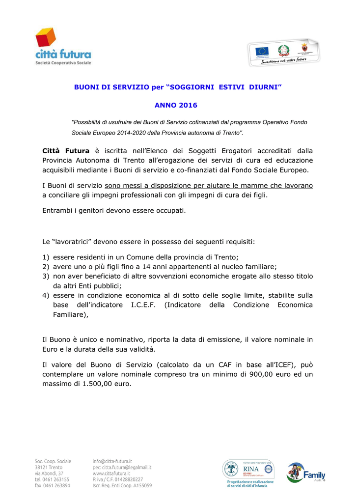 BUONI DI SERVIZIO per “SOGGIORNI ESTIVI DIURNI” ANNO 2016 "Possibilità di usufruire dei Buoni di Servizio cofinanziati dal programma Operativo Fondo Sociale Europeo 2014-2020 della Provincia autonoma di Trento". Città Futura è iscritta nell’Elenco dei Soggetti Erogatori accreditati dalla Provincia Autonoma di Trento all’erogazione dei servizi di cura ed educazione acquisibili mediante i Buoni di servizio e co-finanziati dal Fondo Sociale Europeo. I Buoni di servizio sono messi a disposizione per aiutare le mamme che lavorano a conciliare gli impegni professionali con gli impegni di cura dei figli. Entrambi i genitori devono essere occupati. Le “lavoratrici” devono essere in possesso dei seguenti requisiti: 1) essere residenti in un Comune della provincia di Trento; 2) avere uno o più figli fino a 14 anni appartenenti al nucleo familiare; 3) non aver beneficiato di altre sovvenzioni economiche erogate allo stesso titolo da altri Enti pubblici; 4) essere in condizione economica al di sotto delle soglie limite, stabilite sulla base dell’indicatore I.C.E.F. (Indicatore della Condizione Economica Familiare), Il Buono è unico e nominativo, riporta la data di emissione, il valore nominale in Euro e la durata della sua validità. Il valore del Buono di Servizio (calcolato da un CAF in base all’ICEF), può contemplare un valore nominale compreso tra un minimo di 900,00 euro ed un massimo di 1.500,00 euro. Passi da seguire… RICHIEDENTE (madre) 1. Richiedere al CAF la domanda ICEF per i Buoni di Servizio, che ne attesti il diritto ed il valore del Buono stesso. 2. Recarsi presso il Comune o Nido di riferimento ed iscrivere il proprio figlio/a/i al soggiorno estivo diurno. Se si ha diritto ai Buoni di Servizio (domanda ICEF per i Buoni di Servizio), compilare anche il modulo di richiesta compilazione PES e consegnarlo assieme al modulo di iscrizione in Comune o Nido, che verrà consegnato a Città Futura per la relativa compilazione e consegna previo appuntamento telefonico. 3. Compilare il modulo di richiesta di Buono di servizio (a cura della madre), scaricabile dal sito http://www.fse.provincia.tn.it (Area UtentiBuoni di Servizio-MODULISTICA PER LE/I RICHIEDENTI-file formato pdf). 4. Consegnare presso lo Sportello AdPersonam – Struttura Multifunzionale Territoriale del Fondo Sociale Europeo – PAT (Trento - Via Pranzelores, 71 numero Verde 800.163.870): 1) Modulo di richiesta di Buoni di Servizio – a cura del richiedente 2) Domanda ICEF per i Buoni di Servizio - certificata da un CAF. 3) Progetto di Erogazione del Servizio (PES) – a cura di Città Futura 4) Fotocopia carta d’identità mamma – cod. fisc. Mamma e figlio/i. 5. Le graduatorie di assegnazione Buoni di Servizio verranno pubblicate presso lo sportello Ad Personam verso il giorno 20 del mese successivo, tenendo come termine ultimo per la consegna di tutta la documentazione il fine mese. NB: Per poter rientrare quindi nella graduatoria “corretta”, per l’assegnazione dei Buoni di servizio, è consigliabile presentare tutta la documentazione almeno 2 (due) mesi prima dell’inizio del soggiorno estivo (ad esempio: per soggiorni di luglio entro il 31 maggio) Città Futura soc.coop.sociale ritirerà direttamente il Registro Presenze. 7. Il registro delle presenze verrà compilato giornalmente dall’educatrice assegnata al Nido. CITTA’ FUTURA 6. NB: La compilazione del registro è molto importante! Si ricorda che nei giorni in cui la mamma è in ferie o aspettativa non retribuita, la presenza del bimbo NON va segnata sul Registro presenze, poiché per tali ore il Buono non prevede rimborsi ed il servizio è quindi a carico totalmente della famiglia (oppure scrivere FERIE nel campo note). 8. A fine soggiorno la madre sottoscriverà una dichiarazione sostitutiva di atto notorio nella quale dichiarerà che per le ore di servizio, di cui viene richiesto il cofinanziamento al Fondo Sociale Europeo, la stessa era al lavoro.