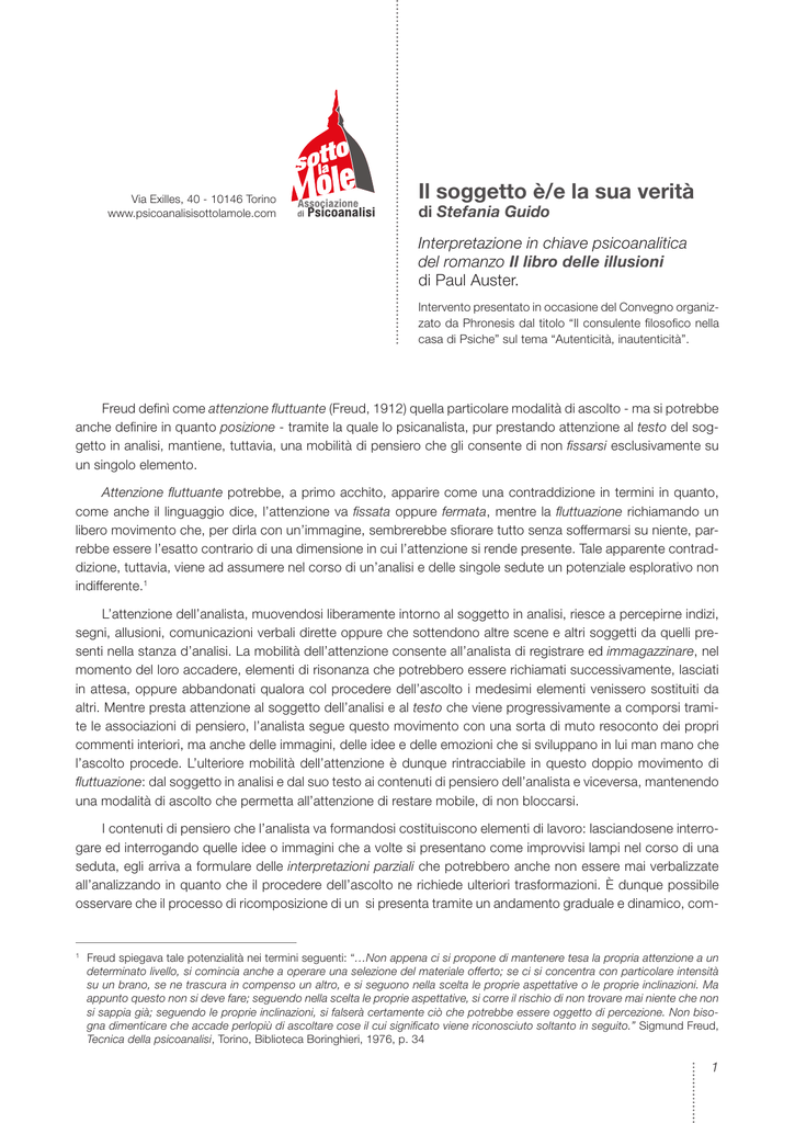 Via Exilles, 40 - 10146 Torino www.psicoanalisisottolamole.com Il soggetto è/e la sua verità di Stefania Guido Interpretazione in chiave psicoanalitica del romanzo Il libro delle illusioni di Paul Auster. Intervento presentato in occasione del Convegno organizzato da Phronesis dal titolo “Il consulente filosofico nella casa di Psiche” sul tema “Autenticità, inautenticità”. Freud definì come attenzione fluttuante (Freud, 1912) quella particolare modalità di ascolto - ma si potrebbe anche definire in quanto posizione - tramite la quale lo psicanalista, pur prestando attenzione al testo del soggetto in analisi, mantiene, tuttavia, una mobilità di pensiero che gli consente di non fissarsi esclusivamente su un singolo elemento. Attenzione fluttuante potrebbe, a primo acchito, apparire come una contraddizione in termini in quanto, come anche il linguaggio dice, l’attenzione va fissata oppure fermata, mentre la fluttuazione richiamando un libero movimento che, per dirla con un’immagine, sembrerebbe sfiorare tutto senza soffermarsi su niente, parrebbe essere l’esatto contrario di una dimensione in cui l’attenzione si rende presente. Tale apparente contraddizione, tuttavia, viene ad assumere nel corso di un’analisi e delle singole sedute un potenziale esplorativo non indifferente.1 L’attenzione dell’analista, muovendosi liberamente intorno al soggetto in analisi, riesce a percepirne indizi, segni, allusioni, comunicazioni verbali dirette oppure che sottendono altre scene e altri soggetti da quelli presenti nella stanza d’analisi. La mobilità dell’attenzione consente all’analista di registrare ed immagazzinare, nel momento del loro accadere, elementi di risonanza che potrebbero essere richiamati successivamente, lasciati in attesa, oppure abbandonati qualora col procedere dell’ascolto i medesimi elementi venissero sostituiti da altri. Mentre presta attenzione al soggetto dell’analisi e al testo che viene progressivamente a comporsi tramite le associazioni di pensiero, l’analista segue questo movimento con una sorta di muto resoconto dei propri commenti interiori, ma anche delle immagini, delle idee e delle emozioni che si sviluppano in lui man mano che l’ascolto procede. L’ulteriore mobilità dell’attenzione è dunque rintracciabile in questo doppio movimento di fluttuazione: dal soggetto in analisi e dal suo testo ai contenuti di pensiero dell’analista e viceversa, mantenendo una modalità di ascolto che permetta all’attenzione di restare mobile, di non bloccarsi. I contenuti di pensiero che l’analista va formandosi costituiscono elementi di lavoro: lasciandosene interrogare ed interrogando quelle idee o immagini che a volte si presentano come improvvisi lampi nel corso di una seduta, egli arriva a formulare delle interpretazioni parziali che potrebbero anche non essere mai verbalizzate all’analizzando in quanto che il procedere dell’ascolto ne richiede ulteriori trasformazioni. È dunque possibile osservare che il processo di ricomposizione di un si presenta tramite un andamento graduale e dinamico, com- 1 Freud spiegava tale potenzialità nei termini seguenti: “…Non appena ci si propone di mantenere tesa la propria attenzione a un determinato livello, si comincia anche a operare una selezione del materiale offerto; se ci si concentra con particolare intensità su un brano, se ne trascura in compenso un altro, e si seguono nella scelta le proprie aspettative o le proprie inclinazioni. Ma appunto questo non si deve fare; seguendo nella scelta le proprie aspettative, si corre il rischio di non trovare mai niente che non si sappia già; seguendo le proprie inclinazioni, si falserà certamente ciò che potrebbe essere oggetto di percezione. Non bisogna dimenticare che accade perlopiù di ascoltare cose il cui significato viene riconosciuto soltanto in seguito.” Sigmund Freud, Tecnica della psicoanalisi, Torino, Biblioteca Boringhieri, 1976, p. 34 1 plesso e discontinuo, mai definitivamente concluso. In “Analisi terminabile ed interminabile” (Freud, 1937), testo che forse più correttamente dovrebbe essere tradotto come: “Analisi finita ed infinita”2, Freud chiarisce che se l’analisi si conclude, il processo che essa ha messo in moto può rimanere aperto in quanto ricerca del soggetto. Con queste note d’apertura ho voluto dare un’idea del modo di procedere che ho adottato nella lettura del testo di Auster. Inoltre, per lasciare intravedere come ciò che può apparire come accuratamente e compiutamente elaborato nel momento della comunicazione, costituisca, per così dire, solo un aspetto ulteriore, connesso alla sistematizzazione, di quel lavoro che comunque era già andato compiendosi dal momento dell’avvicinamento al testo. Cercherò, pertanto, di mantenere nella mia esposizione quella dimensione “laboratoriale”, di work in progress che è caratteristica del lavoro analitico, qualora non intervengano disturbi che ne ostacolino il suo svilupparsi. Lavoro, dunque, che, in questo caso, andava compiendosi col precedere della lettura da parte mia del libro e che produceva man mano quei materiali, ora di immagini ora di emozioni o di concetti, che richiedono di essere interrogati ed elaborati per poter andare a costituire un discorso. Quali impressioni erano affiorate nel corso della lettura? Quali idee e quali sapori la medesima mi aveva lasciato? Ripercorrendo mentalmente quei contenuti mi è possibile enucleare alcuni titoli principali: • la struttura narrativa subisce una sorta di slittamento da un certo momento in poi: uno spostamento dal personaggio principale verso altri scenari, altri personaggi, altri movimenti. È uno spostamento repentino quello che avviene, come se si volesse attuare per forza una discontinuità, come se non fosse più possibile rimanere sul registro precedente, come se occorresse attuare uno strappo. • Il ritmo si fa progressivamente più incalzante: un susseguirsi di azioni senza soluzio