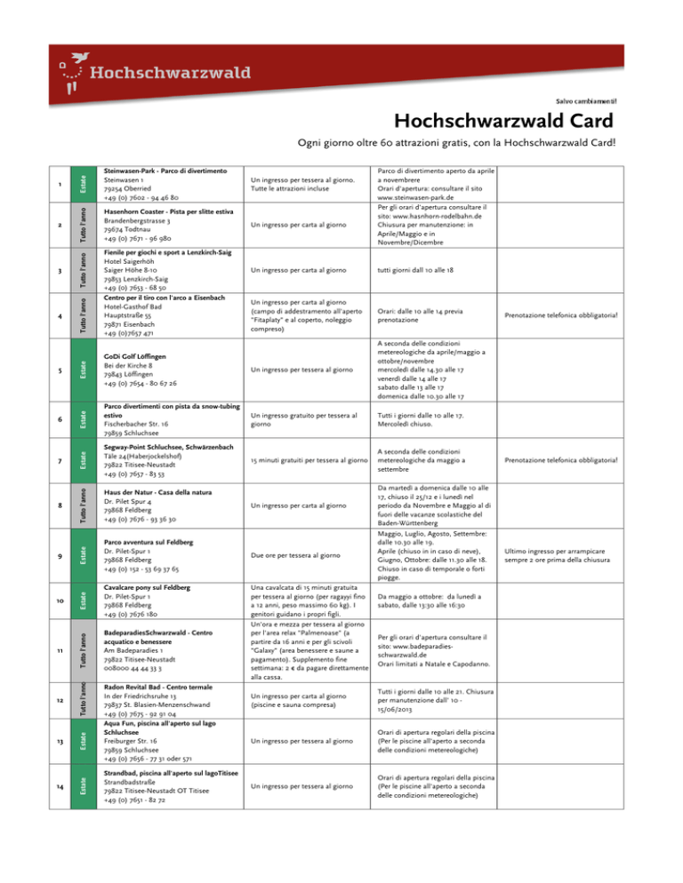 Salvo cambiamenti! Hochschwarzwald Card Estate Un ingresso per tessera al giorno. Tutte le attrazioni incluse Hasenhorn Coaster - Pista per slitte estiva Brandenbergstrasse 3 79674 Todtnau +49 (0) 7671 - 96 980 Un ingresso per carta al giorno Estate Estate Parco divertimenti con pista da snow-tubing estivo Fischerbacher Str. 16 79859 Schluchsee Estate Segway-Point Schluchsee, Schwärzenbach Täle 24(Haberjockelshof) 79822 Titisee-Neustadt +49 (0) 7657 - 83 53 Tutto l'anno Haus der Natur - Casa della natura Dr. Pilet Spur 4 79868 Feldberg +49 (0) 7676 - 93 36 30 Estate Parco avventura sul Feldberg Dr. Pilet-Spur 1 79868 Feldberg +49 (0) 152 - 53 69 37 65 Estate Cavalcare pony sul Feldberg Dr. Pilet-Spur 1 79868 Feldberg +49 (0) 7676 180 11 Tutto l'anno BadeparadiesSchwarzwald - Centro acquatico e benessere Am Badeparadies 1 79822 Titisee-Neustadt 008000 44 44 33 3 12 13 5 6 7 8 9 10 14 Estate GoDi Golf Löffingen Bei der Kirche 8 79843 Löffingen +49 (0) 7654 - 80 67 26 Tutto l'anno 4 Fienile per giochi e sport a Lenzkirch-Saig Hotel Saigerhöh Saiger Höhe 8-10 79853 Lenzkirch-Saig +49 (0) 7653 - 68 50 Centro per il tiro con l'arco a Eisenbach Hotel-Gasthof Bad Hauptstraße 55 79871 Eisenbach +49 (0)7657 471 Estate 3 Tutto l'anno 2 Steinwasen-Park - Parco di divertimento Steinwasen 1 79254 Oberried +49 (0) 7602 - 94 46 80 Tutto l'anno 1 Tutto l'anno Ogni giorno oltre 60 attrazioni gratis, con la Hochschwarzwald Card! Radon Revital Bad - Centro termale In der Friedrichsruhe 13 79837 St. Blasien-Menzenschwand +49 (0) 7675 - 92 91 04 Aqua Fun, piscina all'aperto sul lago Schluchsee Freiburger Str. 16 79859 Schluchsee +49 (0) 7656 - 77 31 oder 571 Strandbad, piscina all'aperto sul lagoTitisee Strandbadstraße 79822 Titisee-Neustadt OT Titisee +49 (0) 7651 - 82 72 Parco di divertimento aperto da aprile a novembrere Orari d'apertura: consultare il sito www.steinwasen-park.de Per gli orari d'apertura consultare il sito: www.hasnhorn-rodelbahn.de Chiusura per manutenzione: in Aprile/Maggio e in Novembre/Dicembre Un ingresso per carta al giorno tutti giorni dall 10 alle 18 Un ingresso per carta al giorno (campo di addestramento all'aperto "Fitaplaty" e al coperto, noleggio compreso) Orari: dalle 10 alle 14 previa prenotazione Un ingresso per tessera al giorno A seconda delle condizioni metereologiche da aprile/maggio a ottobre/novembre mercoledì dalle 14.30 alle 17 venerdì dalle 14 alle 17 sabato dalle 13 alle 17 domenica dalle 10.30 alle 17 Un ingresso gratuito per tessera al giorno Tutti i giorni dalle 10 alle 17. Mercoledì chiuso. 15 minuti gratuiti per tessera al giorno A seconda delle condizioni metereologiche da maggio a settembre Un ingresso per carta al giorno Da martedì a domenica dalle 10 alle 17, chiuso il 25/12 e i lunedì nel periodo da Novembre e Maggio al di fuori delle vacanze scolastiche del Baden-Württenberg Due ore per tessera al giorno Maggio, Luglio, Agosto, Settembre: dalle 10.30 alle 19. Aprile (chiuso in in caso di neve), Giugno, Ottobre: dalle 11.30 alle 18. Chiuso in caso di temporale o forti piogge. Una cavalcata di 15 minuti gratuita per tessera al giorno (per ragayyi fino a 12 anni, peso massimo 60 kg). I genitori guidano i propri figli. Un'ora e mezza per tessera al giorno per l'area relax "Palmenoase" (a partire da 16 anni e per gli scivoli "Galaxy" (area benessere e saune a pagamento). Supplemento fine settimana: 2 € da pagare direttamente alla cassa. Da maggio a ottobre: da lunedì a sabato, dalle 13:30 alle 16:30 Per gli orari d'apertura consultare il sito: www.badeparadiesschwarzwald.de Orari limitati a Natale e Capodanno. Un ingresso per carta al giorno (piscine e sauna compresa) Tutti i giorni dalle 10 alle 21. Chiusura per manutenzione dall' 10 15/06/2013 Un ingresso per tessera al giorno Orari di apertura regolari della piscina (Per le piscine all'aperto a seconda delle condizioni metereologiche) Un ingresso per tessera al giorno Orari di apertura regolari della piscina (Per le piscine all'aperto a seconda delle condizioni metereologiche) Prenotazione telefonica obbligatoria! Prenotazione telefonica obbligatoria! Ultimo ingresso per arrampicare sempre 2 ore prima della chiusura Salvo cambiamenti! Hochschwarzwald Card Estate 16 Estate 17 Estate 18 Estate 19 Estate 20 24 25 Tutto l'anno Tutto l'anno Un ingresso per tessera al giorno Orari di apertura regolari della piscina (Per le piscine all'aperto a seconda delle condizioni metereologiche) Un ingresso per tessera al giorno Orari di apertura regolari della piscina (Per le piscine all'aperto a seconda delle condizioni metereologiche) Un ingresso per tessera al giorno Orari di apertura regolari della piscina (Per le piscine all'aperto a seconda delle condizioni metereologiche) Un ingresso per tessera al giorno Orari di apertura regolari della piscina (Per le piscine all'aperto a seconda delle condizioni metereologiche) Un ingresso per tessera al giorno Orari di apertura regolari della piscina (Per le piscine all'aperto a seconda delle condizioni metereologiche) Naturfreibad St. Märgen - Piscina all'aperto L 128 79274 St. Märgen +49 (0) 7669 - 91 18 0 Un ingresso per tessera al giorno Orari di apertura regolari della piscina (Per le piscine all'aperto a seconda delle condizioni metereologiche) Piscina al coperto a Löffingen-Dittishausen Taborstrasse 33 79843 Löffingen-Dittishausen +49 (0) 7954 - 92 21 22 Un ingresso per carta al giorno Orari d'apertura regolari della piscina Un ingresso per carta al giorno Orari d'apertura regolari della piscina Un ingresso per carta al giorno Orari d'apertura regolari della piscina Noleggio di una bicicletta elettrica per mezza giornata per tessera al giorno Noleggio di bicilette dal 1 maggio al 15 ottobre Orari d'apertura: dalle 9 alle 10 e dalle 13 alle 14 Noleggio gratuito per 3 ore con la Hochschwarzwald Card Una salita e una discesa gratuita per tessera al giorno, con visita alla torre panoramica inclusa A seconda delle condizioni metereologiche e periodo di rev
