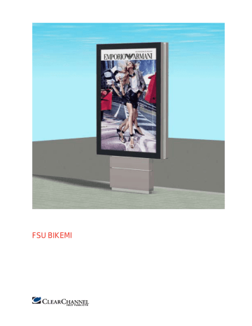 FSU BIKEMI Questo documento riproduce progetti originali. La Clear Channel Jolly Pubblicità Spa diffida la riproduzione anche parziale dei contenuti di questa pubblicazione richiamandosi alle norme vigenti sui diritti d’autore. "FSU BikeMi" L’Fsu BikeMi (Free Standing Unit) è una struttura informativa pubblica bene illuminata, che rende semplice agli utenti la lettura delle informazioni offerte. In una meravigliosa fusione di stile e funzionalità, la struttura comprende un pannello a doppia facciata retroilluminato, capace di portare la pubblicità o le informazioni urbane su entrambi i lati. Cartine, informazioni turistiche, informazioni di eventi pubblici e altre notizie locali possono essere comunicate facilmente dall’elegante display. Prodotta con acciaio verniciato a polveri termoindurenti, la struttura presenta un vetro di sicurezza temperato come standard. I pannelli pubblicitari sono progettati in modo da occupare il minimo spazio sul pavimento, permettendo così facile manutenzione e pulizia stradale. Le porte sono dotate di un dispositivo di sicurezza e vengono lasciate aperte per mezzo di due montanti idraulici su ognuna, mentre, come ulteriore caratteristica di sicurezza, sono state introdotte due nuove serrature antivandalo per scoraggiare ingressi non autorizzati. "FSU BikeMi" STRUTTURA - Profili in alluminio estruso - Accessori in fusione d’alluminio - Piastre d’ancoraggio alla fondazione in alluminio - Dimensioni d’ingombro fuori tutto: 1401x2500x236 mm CASSONE - Porte bifacciali in profilo estruso d’alluminio - Apertura/chiusura tramite martinetto, cerniere e serrature - Supporto di affissione in metacrilato opal diffondente (statico), rulli di trascinamento (scrolling) - Protezione delle affissioni in vetro Sécurit 6 mm - Dimensioni d’ingombro: 1401x1951x236 mm - Dimensioni visibili del manifesto: 1150x1695 mm ATTREZZATURA ELETTRICA (NORME CE) - 3 tubi fluorescenti da 58 W - 4 Motori elettrici di trascinamento da 26 w/cad DC - Controllo remoto delle funzioni (EM7 controller) - Modem gSM per controllo remoto (EM7 controller) - interruttore differenziale magnetotermico 30 mA, condensatori e reattori - griglia per la messa a terra posta sotto il plinto di fondazione - Assorbimento elettrico medio: 0,15 w/h - Assorbimento giornaliero, 3,60 kw/giorno ANCORAGGIO A TERRA - Mediante piastra e tirafondi di ancoraggio ,in acciaio zincato, annegati nel plinto di fondazione in calcestruzzo, adeguatamente dimensionato. TRATTAMENTO DI SUPERFICIE - Metallizzazione allo zinco degli acciai - Cromatazione alluminio - Finitura polvere poliestere secondo prescrizione Label Européen Qualicoat - Verniciatura a polveri termoindurenti di poliestere color grigio RAL 7011. "FSU BikeMi" DISEGNO TECNICO FSU BIKEMI
