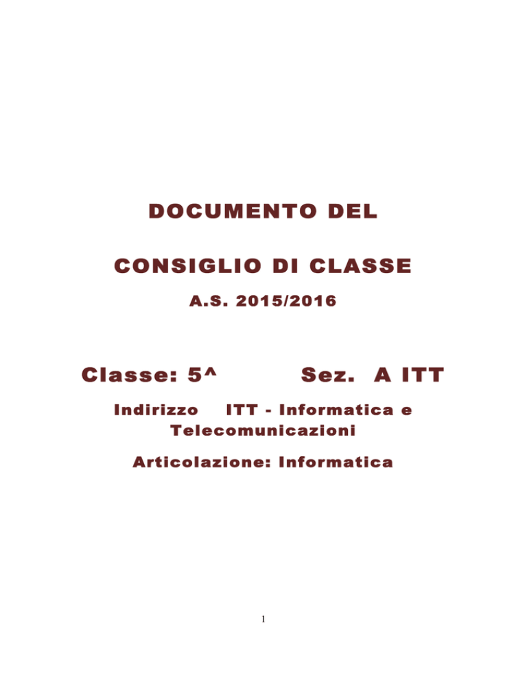 DOCUMENTO DEL CONSIGLIO DI CLASSE A.S. 2015/2016 Classe: 5^ Sez. A ITT Indirizzo ITT - Informatica e Telecomunicazioni Articolazione: Informatica 1 IIS "Guglielmo Marconi" Via Reno, snc – 04100 LATINA Tel. 0773.472005 - Fax 0773.410393 www.iismarconilatina.gov.it PREMESSA Il Consiglio di Classe nella seduta del 28 aprile 2015, sulla base della programmazione didattico-educativa annuale coordinata, redatta in attuazione degli obiettivi culturali e formativi specifici d'indirizzo e delle finalità generali contenute nel Piano dell'Offerta Formativa approvato dal Collegio dei Docenti, elabora il presente documento destinato alla Commissione d'Esame. Ai sensi delle vigenti disposizioni normative sugli Esami di Stato conclusivi del corso di studi, il documento esplicita i contenuti disciplinari, gli obiettivi,i metodi, i mezzi, i tempi del percorso formativo, nonché i criteri e gli strumenti di valutazione. INDICE Presentazione della scuola Strutture e risorse Profilo professionale Docenti componenti del C. di C. Elenco alunni che hanno frequentato la classe quinta Presentazione della classe Obiettivi Strategie Modalità d'intervento e strumenti Attività di recupero /potenziamento e approfondimento Verifiche e valutazione Attività curricolari Attività extracurricolari (di orientamento e stage aziendali) Parametri e criteri di attribuzione dei crediti scolastico e formativo Percorsi formativi delle singole discipline Simulazione delle prove d'esame e griglie di valutazione 2 PRESENTAZIONE DELLA SCUOLA L'Istituto di istruzione superiore "G. Marconi" di Latina è nato principalmente per erogare servizi ad un bacino d'utenza che si espande nell'intera zona nord della provincia. Questo si compone dell'Istituto Tecnico settore Tecnologico - Indirizzo Informatica e Telecomunicazioni, Istituto Tecnico settore Economico - Indirizzo Amministrazione, Finanza e Marketing e Liceo Scientifico opzione Scienze Applicate. E' attento alle grandi trasformazioni tecnologiche anche perché si propone una funzione importante non solo per l'educazione culturale, sociale e umana, ma anche professionale ed operativa. Riguardo al territorio della provincia di Latina, occorre considerare che il mondo del lavoro presenta aziende piccole e medie, che solo dopo il 1983 hanno trovato le condizioni attuali per la diffusione delle tecnologie informatiche. Dall'inizio degli anni '90 le aziende, nel territorio pontino, per essere competitive in un mercato sempre più internazionale, si sono orientate ad impiegare l'elaboratore nella produzione, nel marketing e in genere nel supporto alle decisioni strategiche di aziende. A ciò si aggiunge il fatto che il progresso tecnologico ha comportato uno spostamento della domanda di lavoro verso personale qualificato, soprattutto in relazione allo sviluppo delle tecnologie informatiche. In questo contesto, quindi l' I.I.S. "G. Marconi" di Latina ritiene, nell'ambito del suo piano dell'offerta formativa, che la formazione sia uno strumento di politica attiva nel mercato del lavoro, tendente ad adeguare le qualifiche professionali alle necessità del mercato, e divenendo, di conseguenza, un elemento chiave per dare maggiore flessibilità a quest'ultimo. Alla luce di quest'analisi, l' I.I.S. "G. Marconi" si propone di dare delle valide risposte dal punto di vista educativo e professionale, pertanto l’identità dell’Istituto tecnico, in particolare, è connotata da una solida base culturale a carattere scientifico-tecnologico, in linea con le indicazioni della Comunità Europea, costruita attraverso lo studio, l’approfondimento, l’applicazione di linguaggi e metodologie di carattere generale e specifico. STRUTTURE E RISORSE L'Istituto 'G. Marconi' di Latina presenta una ampia dotazione di laboratori. Nel triennio gli studenti possono accedere ai laboratori di: Informatica e Sistemi (Personal Computer con un'ampia gamma di software per sistemi di sviluppo di linguaggi di programmazione 3 e per lo studio dei microprocessori) Telecomunicazioni (Personal Computer e strumentazione e componentistica elettronica con programmi di progettazione CAD elettronico, PLC) Matematica (Personal Computer con dotazione di software specifico: Derive, ecc.) Laboratorio Linguistico Multimediale Laboratorio di Fisica Laboratorio di Biologia Laboratorio di Chimica Tutti i laboratori sono collegati fra loro tramite rete Intranet e sono forniti di Lavagne Interattive Multimediali. Altri strumenti a disposizione dei docenti nello svolgimento in aula delle attività didattiche e comunemente usati sono: Lavagna luminosa per la proiezione di lucidi con schermo; Televisione con video registratore; Registratore; Lavagne Interattive Multimediali Display LCD per la proiezione su schermo di immagini provenienti da computer. 4 PROFILO DELL'INDIRIZZO ITT (Indirizzo Informatica e Telecomunicazioni) Il Diplomato in “Informatica e Telecomunicazioni”: - ha competenze specifiche nel campo dei sistemi informatici, dell’elaborazione dell’informazione, delle applicazioni e tecnologie Web, delle reti e degli apparati di comunicazione; - ha competenze e conoscenze che, a seconda delle diverse articolazioni, si rivolgono all’analisi, progettazione, installazione e gestione di sistemi informatici, basi di dati, reti di sistemi di elaborazione, sistemi multimediali e apparati di trasmissione e ricezione dei segnali; - ha competenze orientate alla gestione del ciclo di vita delle applicazioni che possono rivolgersi al software: gestionale – orientato ai servizi – per i sistemi dedicati “incorporati”; - collabora nella gestione di progetti, operando nel quadro di normative nazionali e internazionali, concernenti la sicurezza in tutte le sue accezioni e la protezione delle informazioni (“privacy”). È in grado di: - collaborare, nell’ambito delle normative vigenti, ai fini della sicurezza sul lavoro e della tutela ambientale e di intervenire nel miglioramento della qualità dei prodotti e nell’organizza