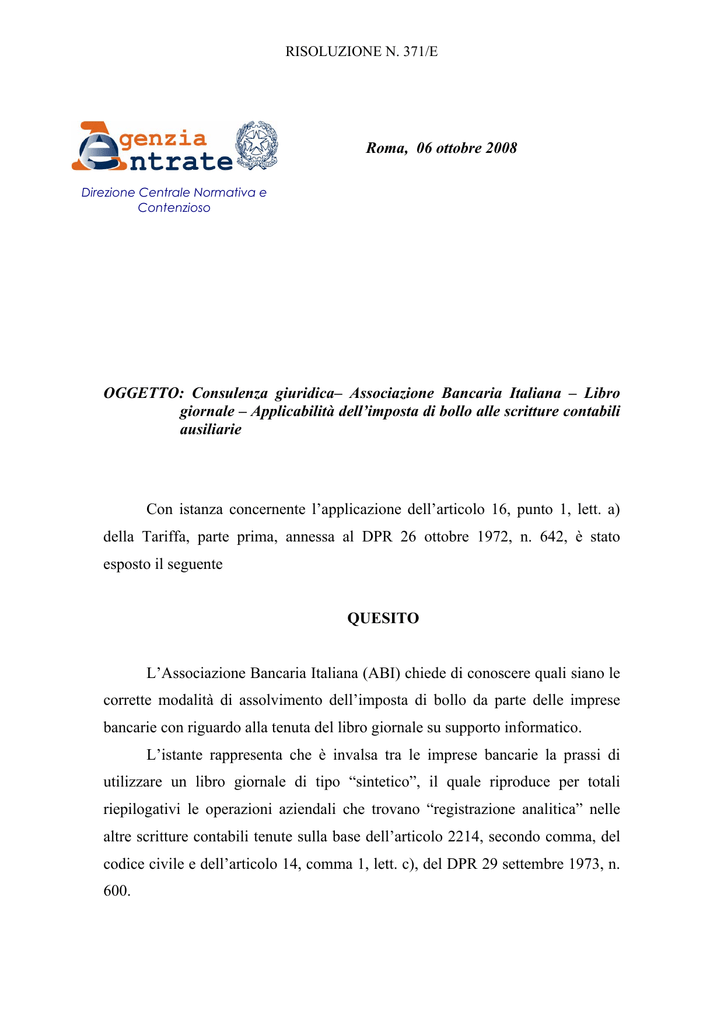 RISOLUZIONE N. 371/E Roma, Roma, 06 ottobre 2008 Direzione Centrale Normativa e Contenzioso Prot. n. 2008/137243 OGGETTO: Consulenza giuridica– Associazione Bancaria Italiana – Libro giornale – Applicabilità dell’imposta di bollo alle scritture contabili ausiliarie Con istanza concernente l’applicazione dell’articolo 16, punto 1, lett. a) della Tariffa, parte prima, annessa al DPR 26 ottobre 1972, n. 642, è stato esposto il seguente QUESITO L’Associazione Bancaria Italiana (ABI) chiede di conoscere quali siano le corrette modalità di assolvimento dell’imposta di bollo da parte delle imprese bancarie con riguardo alla tenuta del libro giornale su supporto informatico. L’istante rappresenta che è invalsa tra le imprese bancarie la prassi di utilizzare un libro giornale di tipo “sintetico”, il quale riproduce per totali riepilogativi le operazioni aziendali che trovano “registrazione analitica” nelle altre scritture contabili tenute sulla base dell’articolo 2214, secondo comma, del codice civile e dell’articolo 14, comma 1, lett. c), del DPR 29 settembre 1973, n. 600. 2 Al riguardo l’ABI precisa che: • il predetto secondo comma dell’articolo 2214 del codice civile dispone che l’imprenditore che esercita un’attività commerciale deve tenere oltre al libro giornale ed al libro degli inventari “anche le altre scritture che siano richieste dalla natura e dalle dimensioni dell’impresa”; • l’articolo 14, comma 1, lett. c), DPR n. 600 del 1973 obbliga le imprese commerciali a tenere, oltre al libro giornale ed ai registri ai fini dell’IVA, anche le scritture ausiliare nelle quali “devono essere registrati gli elementi patrimoniali e reddituali, raggruppati in categorie omogenee, in modo da desumere chiaramente e distintamente i componenti positivi e negativi che concorrono alla determinazione del reddito”. Ciò premesso, l’ABI chiede di sapere se l’articolo 7, comma 3, del decreto ministeriale 23 gennaio 2004, recante “Modalità di assolvimento degli obblighi fiscali relativi ai documenti informatici ed alla loro riproduzione in diversi tipi di supporto” secondo cui “l’imposta sui libri e sui registri di cui all’art. 16 della tariffa, allegata al decreto del Presidente della Repubblica 26 ottobre 1972, n. 642, tenuti su supporto di memorizzazione ottico o con altro mezzo idoneo a garantire la non modificabilità dei dati memorizzati, è dovuta ogni 2500 registrazioni o frazioni di esse (…)” sia da riferirsi alle annotazioni “per totali riepilogativi” sul libro giornale ovvero alle registrazioni delle operazioni “elementari” sulle scritture sistematiche (quali, ad esempio, le c.d. scritture ausiliarie), ancorché talvolta definite in senso atecnico “sezionali del libro giornale”, siano esse tenute in forma cartacea ovvero informatica. SOLUZIONE INTERPRETATIVA PROSPETTATA L’ABI rileva, preliminarmente, che i libri obbligatori e la modalità della loro tenuta sono individuati dal codice civile e non dalla normativa fiscale. Rappresenta che non costituisce violazione della normativa tributaria in 3 materia di imposta di bollo la scelta dell’imprenditore di tenere il libro giornale in forma sintetica, qualora lo stesso sia regolarmente assoggettato all’imposta di bollo. Precisa, inoltre, che le diverse scritture contabili sistematiche, siano esse tenute in forma cartacea ovvero informatica (quali, ad esempio, le c.d. scritture ausiliarie) – ancorché talvolta definite in senso atecnico “sezionali del libro giornale” – contenenti la rappresentazione in termini quantitativi e/o monetari dei singoli atti dell’impresa, regolarmente confluiti nel libro giornale, non costituiscono presupposto impositivo dell’imposta di bollo. L’istante perviene alle predette conclusioni sulla scorta delle seguenti motivazioni. In primo luogo l’ABI rileva che anche la Banca d’Italia ha riconosciuto legittime le scritture contabili tenute in forma sintetica purché siano evitate sintesi “eccessive ed equivoche” e il collegamento con altre scritture, anche se non bollate e vidimate, renda sempre possibile ed agevole l’accertamento dello stato patrimoniale dell’azienda e della gestione (nota della Banca d’Italia del 12 febbraio 1974, prot. n. 21679). In senso conforme si è pronunciata la Corte di Cassazione con la sentenza del 19 dicembre 1991, n. 13672. Ne consegue che va considerata legittima la facoltà di esporre nel libro giornale dati per sintesi di gruppi omogenei e cronologicamente distinti. In riferimento al criterio da adoperare ai fini della determinazione dell’imposta di bollo, viene rilevato che l’articolo 16, punto 1, lett. a), della Tariffa, annessa al DPR 26 ottobre 1972, n. 642 assoggetta ad imposta di bollo, fin dall’origine, i libri di cui all’articolo 2214, primo comma, del Codice civile (libro giornale, libro degli inventari) e che l’applicazione dell’imposta di bollo prevista dal predetto articolo 16 per “ogni altro registro” non è più ancorata al carattere contabile o commerciale di essi o all’obbligatorietà o meno della loro tenuta. Rileva inoltre l’associazione istante che le modifiche apportate dalla legge 4 8 agosto 1994, n. 489 (soppressione dell’obbligo della vidimazione annuale dei registri e dei libri contabili obbligatori) e dalla legge 18 ottobre 2001, n. 383 (soppressione dell’obbligo della bollatura e vidimazione iniziale), hanno fatto venir meno l’obbligo della bollatura e della vidimazione di cui agli articoli 2215 e 2216 del codice civile. Da ultimo l’istante fa presente che i documenti (informatici o meno) da cui emergono, anche analiticamente, i movimenti che interessano le voci sintetiche del libro giornale possono essere assimilati alle scritture contabili previste dalla normativa civilistica e alle scritture ausiliarie richieste dalla normativa fiscale, per le quali resta ferma l’applicazione dell’imposta di bollo solo in caso d