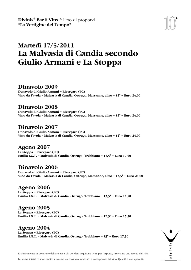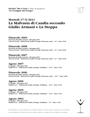 Divinis® Bar à Vins è lieto di proporvi “La Vertigine del Tempo” Martedì 17/5/2011 La Malvasia di Candia secondo Giulio Armani e La Stoppa Dinavolo 2009 Denavolo di Giulio Armani ~ Rivergaro (PC) Vino da Tavola ~ Malvasia di Candia, Ortrugo, Marsanne, altro ~ 12° ~ Euro 24,00 Dinavolo 2008 Denavolo di Giulio Armani ~ Rivergaro (PC) Vino da Tavola ~ Malvasia di Candia, Ortrugo, Marsanne, altro ~ 12° ~ Euro 24,00 Dinavolo 2007 Denavolo di Giulio Armani ~ Rivergaro (PC) Vino da Tavola ~ Malvasia di Candia, Ortrugo, Marsanne, altro ~ 12° ~ Euro 24,00 Ageno 2007 La Stoppa ~ Rivergaro (PC) Emilia I.G.T. ~ Malvasia di Candia, Ortrugo, Trebbiano ~ 13,5° ~ Euro 17,50 Dinavolo 2006 Denavolo di Giulio Armani ~ Rivergaro (PC) Vino da Tavola ~ Malvasia di Candia, Ortrugo, Marsanne, altro ~ 13,5° ~ Euro 24,00 Ageno 2006 La Stoppa ~ Rivergaro (PC) Emilia I.G.T. ~ Malvasia di Candia, Ortrugo, Trebbiano ~ 13,5° ~ Euro 17,50 Ageno 2005 La Stoppa ~ Rivergaro (PC) Emilia I.G.T. ~ Malvasia di Candia, Ortrugo, Trebbiano ~ 12,5° ~ Euro 17,50 Ageno 2004 La Stoppa ~ Rivergaro (PC) Emilia I.G.T. ~ Malvasia di Candia, Ortrugo, Trebbiano ~ 13° ~ Euro 17,50 Esclusivamente in occasione della serata a chi desidera acquistare i vini per l’asporto, riserviamo uno sconto del 10%. Le nostre iniziative sono dirette a favorire un consumo moderato e consapevole del vino. Qualità e non quantità. Giulio Armani e la Reinvenzione dei Vins Orange Nel 2002, dopo che per alcuni anni La Stoppa non aveva più prodotto vini bianchi, l’enologo Giulio Armani tenta la vinificazione sulle bucce di una piccola partita di Malvasia di Candia (con l’aggiunta minoritaria di alcuni altri vitigni locali) per ottenere un vino con forte connotazione territoriale. Anche se recentemente in zona vengono prodotti vinelli bianchi giovani e freschi, spesso frizzanti, la tradizione vuole che la malvasia venisse vinificata, appunto, con macerazione, dando vita a vini di colore accentuato e con una notevole presenza tannica. Quindi, nonostante l’operazione segni un punto di rottura con le attuali modalità di produzione, non è altro che una riproposizione di procedure antiche. D’altronde all’epoca questa tendenza si stava diffondendo un po’ ovunque in Italia grazie al lavoro di altri vignaioli “estremi”, come Gravner, Radikon, Maule, ecc. Quindi, non una operazione isolata, ma la condivisione di un progetto comune con altri produttori. Nasce prima Ageno all’interno de La Stoppa e, negli anni successivi, Giulio Armani inizia una proprio attività parallela, sempre in zona, e crea il Dinavolo; vino analogo all’Ageno, ma con un uvaggio leggermente diverso, composto da Malvasia, Ortrugo, Marsanne ed un altro vitigno non ancora identificato, ma legato alle tradizioni locali. L’esperienza maturata negli anni novanta con il Vigna del Volta, sempre da uve Malvasia, ma passite, permette di portare la produzione di questi vini verso un nuovo orizzonte. La modalità è per certi versi semplice: raccolta delle uve a giusta maturità e con massima condizione sanitaria; pigiatura e lunga macerazione a contatto con le bucce, senza aggiunta di anidride solforosa. Questa procedura permette di estrarre dalle bucce tutte le sostanze pregiate in essa contenute, ma conferisce anche un colore molto carico al vino (da cui la dicitura di Orange Wine, alla quale io preferisco la versione francese di Vin Orange) ed una tannicità inusuale per i vini bianchi. Da questo nasce l’esigenza effettiva di indicare una nuova tipologia di vino per questi prodotti. Non si tratta, ovviamente, di vini rossi perché i pigmenti contenuti nelle bucce mantengono una tonalità diversa; ma nemmeno di vini bianchi, perché la loro struttura è diversa dal vino bianco così come lo conosciamo. Oltre al colore, naturalmente ambrato, troviamo una presenza di tannino importante, ovviamente legata anche al tipo di uva utilizzato; gli aromi si arricchiscono di componenti provenienti dalle bucce, nel caso di questi vini molto frequente la liquirizia, ed non è rara una nota di infusione, tipica della lunga macerazione. Infine bisogna anche tenere in considerazione la predisposizione del vitigno a questo tipo di procedura. La tendenza attuale è quella di applicare la stessa metodologia a tutti i vitigni, ma i risultati mi sembrano ancora incerti. Solo il tempo ci dirà… I commenti di Maurizio Landi L’occasione è stata veramente interessante per cominciare a capire bene la consistenza di questo progetto; l’opportunità di assaggiare quattro annate per ciascuno dei due vini permette di coglierne meglio, da un lato la territorialità intesa anche come aderenza alle condizioni dell’annata e dall’altro la capacità evolutiva di questi vini, che si dimostra molto interessante. Le note caratteristiche della Malvasia sono in bella evidenza e la capacità del vitigno di evolvere nel tempo è del tutto rispettata. La qualità dei singoli vini non è nemmeno in discussione. Quello che lascia perplesso, almeno per quanto mi riguarda, è una notevole discordanza tra la componente olfattiva con note così calde ed avvolgenti, confermate nella componente olfattiva, anch’essa intensa e “dolce”, seguite però da un approccio gustativo molto più aggressivo. In particolare il finale, comune a tutti i vini assaggiati, è ruvido, quasi allappante. È ovvio che siamo di fronte ad una tipologia di vino nuova, anche se ancorata a tradizioni antiche. Quindi è indispensabile avvicinarsi a questi vini con un atteggiamento diverso dal solito; questo richiede anche una disponibilità ad abbandonare alcuni preconcetti maturati nel tempo. Ma forse ne vale la pena, anche se ritengo che il progetto presenti ancora qualche asperità tipicamente giovanile. Per venire ai vini; partendo da Dinavolo 2009, giovanissimo ma già morbido ed accattivante, si tratta di un vino veramente notevole, grande ed intenso. L’unico aspetto negativo, un finale pungente, probabilmente dovuto ad un