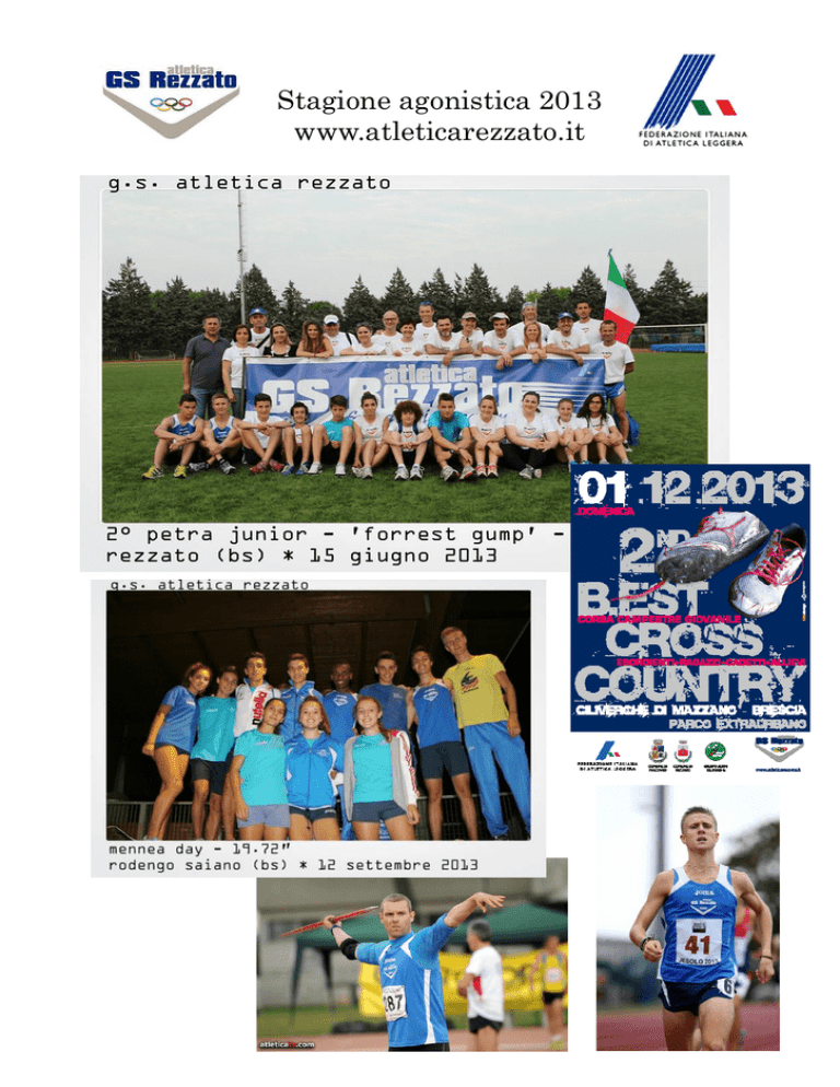 Stagione agonistica 2013 www.atleticarezzato.it Stagione agonistica 2013 Un’altra annata di grande atletica si è conclusa con risultati ben oltre le possibilità della nostra piccola società. Ancora una volta la grande passione degli “addetti ai lavori” unita alla viva collaborazione ed al supporto di molti genitori ha contribuito ad ampliare le prospettive della nostra società organizzando due splendide manifestazioni (2^Petra Junior e 2^ B.est Cross Country) nell’arco dell’anno trascinati dall’entusiasmo di quasi 500 gare effettuate dai nostri atleti nell’intera stagione!!! Prima di passare ad un’analisi dettagliata per ogni categoria ecco una sintesi dei risultati e dell’attività svolta dal G.S. Atletica Rezzato nella stagione agonistica 2013. - 4 partecipazioni ai Campionati Italiani di cui 1 argento e 1 bronzo ai Campionati italiani master indoor di Ancona 1 argento ai Campionati italiani di decathlon master a Gorizia 1 partecipazione ai Campionati Italiani allievi indoor di Ancona 1 partecipazione ai Campionati Italiani allievi di Jesolo - 5 atleti nei primi 50 posti delle graduatorie nazionali di specialità - 11 risultati nella top ten ai Campionati Regionali di cui 3 ori (110hs-asta-200mt) ai C.R. master35 di Desenzano del Garda 1argento (salto triplo) ai C.R. cadetti indoor di Saronno 1 bronzo(1500mt) ed 1 quarto posto(800mt)ai C.R. allievi di Mariano Comense 1 argento (salto triplo) 1 bronzo(lungo) 1 quarto(300hs) 1 quinto(1000mt) 1 nono (100hs) posto ai C.R. cadetti di Busto Arsizio - 11 Titoli provinciali, 2 secondi e 3 terzi posti conquistati nelle diverse discipline e categorie - 7 record di società migliorati - 2 convocazioni per la rappresentativa provinciale Allievi/junior “Meeting interregionale di Cuneo” - 2 convocazioni per la rappresentativa provinciale Ragazzi/Cadetti “Trofeo delle province di Cross” - 8 convocazioni per la rappresentativa provinciale cadetti/e “Trofeo dei Laghi 2012” - 3 convocazioni per la rappresentativa provinciale Rag/Cad “Trofeo internazionale Citta di Majano” - 2 convocazioni per il raduno regionale autunnale settore lanci/mezzfonod/marcia di Lecco - 3° squadra classificata al “ 2° Petra Junior Meeting” - organizzazione del “2° Petra Junior Meeting” 9^prova Trofeo Forrest Gump - organizzazione del “2° B-est cross” 5^prova di cross giovanile - 38 manifestazioni provinciali alle quali l’Atletica Rezzato ha presenziato con almeno un atleta - 36 manifestazioni regionali alle quali l’Atletica Rezzato ha presenziato con almeno un atleta - 9 manifestazioni nazionali alle quali l’Atletica Rezzato ha presenziato con almeno un atleta - 489 gare ( 45 nazionali, 143 regionali, 301 provinciali) disputate dagli atleti dell’Atletica Rezzato Un'inverno da record L’inverno costituisce per l’atletica, sport estivo e da vivere all’aria aperta, un lungo periodo “letargico” dove gli atleti si rifugiano in palestra o in sala pesi mentre la pista resta privilegio di pochi specialisti. Anche quest’anno, tuttavia, la fredda atmosfera invernale è stata riscaldata dal fermento dei nostri giovani sia in campestre che nella stagione indoor ravvivata dalle nuove trasferte in terra emiliana e bergamasca. Andando con ordine i primi ad essere ricordati sono sicuramente i nostri “mezzofondisti doc” sotto la guida attenta dell’ottimo coach Massimo Botta. Per alcuni di loro si trattava ormai del terzo anno di cross e la maggiore esperienza li ha portati ad affrontare sfide sempre più impegnative ben oltre i confini provinciali tra monti inospitali e pianure ghiacciate della lombardia. Boifava Alessia (6° ai campionati provinciali di Cross a Concesio) Corselli Lorenzo (12° ai campionati provinciali di Cross a Concesio) Facchin Stefano (1° al Cross di Chiari, 3° ai campionati provinciali, 16° ai campionati regionali) Zecchi Riccardo (15° al Cross di Pompiano) Soncina Simone (2° al Cross di Ciliverghe , 27° ai campionati regionali di cross) Elisa Morandini (26° ai campionati provinciali di Cross a Concesio) Tra tutti loro spicca il nome di Stefano Facchin in grado di tornare vincitore dal cross di Chiari oltre a segnare il miglior piazzamento ai campionati regionali sfiorando la convocazione al criterium nazionale. Al nome di Stefano va sicuramente affiancata Alessia Boifava entrambi hanno infatti ottenuto la convocazione al “Trofeo delle province di cross” svoltosi a Cortenova difendendo i colori della rappresentativa bresciana. Anche la nostra società si è schierata “in prima linea” nel calendario provinciale di cross dando vita (con un ingente spiegamento di forze!!!) al primo Best Cross Country; manifestazione giovanile di corsa campestre dove oltre ai nostri atleti più accreditati hanno partecipato anche molti “non mezzofondisti” mantenendo alto l’onore della nostra squadra tra cui Verzeletti Matteo, Maramai Eleonora, Facchin Pietro,Foschetti Leonardo, Mazza Alessandro, Foletti Roberto, Fasciolo Francesco, Pedrotti Chiara La stagione invernale non è stata solo fatica e sudore in campestre. Grazie ai nuovi impianti indoor di Bergamo e Parma anche saltatori e velocisti hanno potuto “scatenarsi” in una vera e propria stagione indoor che ci ha regalato ben due partecipazioni ai campionati italiani di Ancona merito di Simone Soncina nei 1000mt allievi e Burri Alessandro argento nei 60hs e bronzo nel pentathlon master. A loro va sicuramente aggiunto Pietro Facchin campione provinciale e argento in un’estenuante gara di salto triplo ai campionati regionali cadetti di Saronno. A questi nomi si aggiunge poi una lunga serie di atleti che si sono “rodati” nel corso dell’inverno nelle rispettive discipline preparandosi al meglio alla stagione estiva. Ecco la lista completa Burri Alessandro (vicecampione italiano e campione provinciale master 60hs) Soncina Simone (15° campionati italiani indoor allievi) Facchin Pietro (campione provinciale e vicecampione regionale di