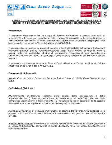 LINEE GUIDA PER LA REGOLAMENTAZIONE DEGLI ALLACCI ALLE RETI IDRICHE E FOGNARIE IN GESTIONE ALLA GRAN SASSO ACQUA S.P.A. Premessa: Il presente documento ha lo scopo di fornire indicazioni e prescrizioni utili ai progettisti, alle imprese, nonché a tutti i soggetti coinvolti nella progettazione e realizzazione dei lavori di ricostruzione e/o riparazione di edifici, aggregati, che hanno subito danni per effetto del sisma del 6/4/2009. Il documento ha inoltre lo scopo di fornire a tutti gli addetti del settore indicazioni tecniche generali per la regolamentazione degli allacciamenti di utenza idrici e fognari alle reti pubbliche al fine di perseguire l’obiettivo di una complessiva razionalizzazione dei punti di consegna delle utenze idriche e dei relativi scarichi fognari. Il presente documento integra le Norme Contrattuali e la Carta del Servizio Idrico Integrato della Gran Sasso Acqua S.p.a. Documenti richiamati: Norme Contrattuali e Carta del Servizio Idrico Integrato della Gran Sasso Acqua S.p.a. Definizioni (Idrico): Allacciamento di Utenza: Insieme delle opere, delle attrezzature e delle apparecchiature (tubazioni, saracinesche, misuratori di utenza) che nel loro complesso permettono il trasferimento, la misurazione ed il controllo della risorsa idrica dalla rete principale al al punto di consegna contrattuale. Punto di consegna: E’ il punto individuato al confine tra la proprietà pubblica e la privata ove termina la responsabilità contrattuale del gestore ed inizia quella privata. Misuratore di utenza: Strumento di misura fiscale della quantità di acqua (espressa in volume) transitante attraverso il punto di consegna ai fini della sua successiva contabilizzazione. 1 Nicchia o Armadio: Manufatto di alloggiamento a parete atto a contenere tutte le apparecchiature idrauliche dell’allacciamento di utenza. Pozzetto: Manufatto di alloggiamento stradale Viene prevalentemente autorizzato nella realizzazione di utenze ad uso di cantiere Definizioni (Fognario): Allacciamento Fognario: Impianto su proprietà pubblica o privata che permette l’immissione in fognatura di acque reflue e/o meteoriche di un insediamento e che comprende, tra l’altro, la tubazione di allacciamento a valle del pozzetto di ispezione e prelievo fino all’innesto con il collettore fognario pubblico. Le opere costituenti l’allacciamento (sia su proprietà privata che su proprietà pubblica) ad eccezione dell’eventuale pozzetto d’innesto (camera di immissione) resteranno di proprietà privata. Acqua meteorica: acqua di pioggia direttamente incidente sulle superfici urbanizzate ed anche acqua della stessa origine che provenendo da altre aree circostanti può interessare le medesime superfici per scorrimento superficiale. Acqua usata: acqua la cui natura è modificata per effetto della sua utilizzazione. Per tutte le altre definizioni si rimanda alle Norme Contrattuali e Carta del Servizio Idrico Integrato della Gran Sasso Acqua S.p.a. Le Tipologie di allacciamento (idrico) Di seguito sono riportate le diverse tipologie di allaccio idrico realizzabili. Allaccio di utenza singola. In caso di allaccio di un’utenza singola, atta ad alimentare un’unica unità immobiliare, con installazione di un unico misuratore di utenza, il punto di consegna è sempre ubicato al confine tra la proprietà pubblica con la privata, all’interno di un manufatto (nicchia, armadio o similari), di proprietà del richiedente l’allaccio, in posizione di accessibilità alla lettura. 2 La realizzazione dello scavo a sezione obbligata trasversalmente all’asse longitudinale della tubazione avviene in corrispondenza del punto ove, previa verifica eseguita dai tecnici dell’ azienda erogatrice, si intende posizionare il misuratore di utenza (punto di consegna). Lo scavo e l’allacciamento idraulico vengono eseguiti secondo lo schema riportato in figura: 3 Le dimensioni della nicchia per l’alloggiamento del punto di consegna e di misura sono riportate nello schema seguente: 4 Allaccio di utenza singola ad uso cantiere. Per le utenze singole ad uso cantiere, il punto di consegna è ubicato, salvo in casi preventivamente verificati ed autorizzati dall’azienda erogatrice, al confine tra la proprietà pubblica e l’area di cantierizzazione, in un punto dove dovrà essere realizzato un pozzetto stradale di proprietà del richiedente l’allacciamento, al cui interno saranno collocate le apparecchiature idrauliche di misura (misuratore di utenza) di intercettazione (saracinesche, valvole di ritegno) ed accessorie (scarico, anti manomissione) costituenti il gruppo di misura. Le dimensioni del pozzetto per l’alloggiamento del misuratore sono riportate nello schema seguente: 5 6 Tipologie di allacciamento ad uso idropotabile – Predisposizione idrica per allacci da 2 a 5 utenze. La tipologia di allacciamento idrico ad uso idropotabile di più utenze, dalla rete di servizio stradale, anche chiamata “predisposizione idrica” per installazione di misuratori di utenza, si compone dell’insieme dei lavori e delle opere edili stradali, murarie ed idrauliche che nel loro insieme concorrono alla costruzione dell’apprestamento. Generalmente per questa tipologia di allacciamento di utenza la predisposizione idraulica derivante è simile a quella descritta nel caso di allacciamento singolo, variando il diametro della tubazione di allacciamento in ingresso. La realizzazione dello scavo a sezione obbligata avviene trasversalmente all’asse longitudinale della tubazione in corrispondenza del punto ove, previa verifica preliminare da eseguirsi in contraddittorio con i tecnici dell’ azienda erogatrice, si intende posizionare il punto di consegna per l’alloggiamento dei misuratori Lo scavo e l’allacciamento idraulico vengono eseguiti secondo lo schema riportato in figura. Nel caso specifico di alloggiamento dei misuratori al confine tra la proprietà pubblica e la privata, e per un numero di contatori maggiore di due, dovrà essere pre
