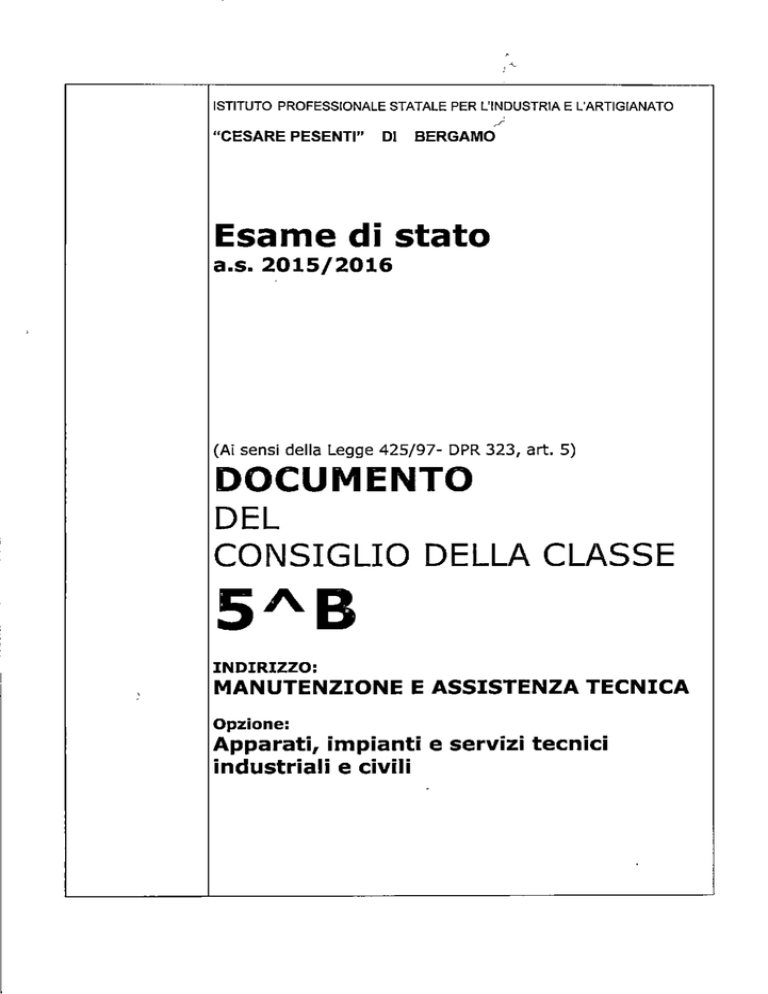ISTITUTO PROFESSIONALE STATALE PER L'INDUSTRIA E L'ARTIQIANATO "CESARE PESENTI" DI BERGAMO Esame di stato a.s. 2015/2016 (Ai sensi della Legge 425/97- DPR 323, art. 5) DOCUMENTO DEL CONSIGLIO DELLA CLASSE INDIRIZZO: MANUTENZIONE E ASSISTENZA TECNICA Opzione: Apparati, impianti e servizi tecnici industriali e civili INDICE >Percorso formativo e presentazione della classe >Profilo professionale >Progetto Alternanza Scuola-Lavoro >Patto Educativo di Corresponsabilità >Criteri di valutazione d'Istituto >Testi delle prove d'esame simulate (1a - 2a - 3a prova) >Criteri di valutazione (1a - 2a - 3a prova ) >Consuntivi offerte formative >Lavori di ricerca presentati dai candidati >Informazioni aggiuntive >Libri di testo in uso >Consiglio di classe Ministero dell'Istruzione, Università e della Ricerca Istituto di Istruzione Superiore Statale "CESARE PESENTI" Via Ozanam, 27 - 24126 Bergamo B 035-319416 S 035-319351 e-mail uffici: infogiistitutoDesenti.it pec: bqis021002(à>pec.istruzione.it PERCORSO FORMATIVO E PRESENTAZIONE DELLA CLASSE La classe era composta ad inizio dell'a.s. da 20 alunni, tutti maschi, di cui 17 provenienti dallo stesso gruppo classe, un allievo ripetente proveniente dalla classe 5B dello scorso a.s. del corso di Istruzione Professionale del medesimo Istituto, un alunno proveniente dalla classe quarta di un Istituto Tecnico ad indirizzo Meccanico ed un alunno proveniente dalla classe quarta del corso di Istruzione Professionale, con il medesimo indirizzo ma di un altro Istituto; quest'ultimo allievo si è ritirato nel marzo 2016. Nella classe sono presenti un alunno diversamente abile ed uno studente portatore di DSA. La classe è quindi attualmente formata da 19 allievi. Irisultati hanno permesso di effettuare, spesso a fatica, per interesse debole e frequenza non sempre costante, la programmazione nel rispetto delle Linee Guida Ministeriali. Gli allievi hanno dimostrato dall'inizio dell'anno scolastico un comportamento non sempre corretto e poco disponibile nel l'affrontare le problematiche della classe; un numero significativo di studenti ha fatto registrare ritardi alle lezioni e assenze, anche strategiche. L'interesse si è rivelato limitato e settoriale nei confronti delle discipline, l'attenzione e la partecipazione andavano continuamente sollecitate; il lavoro assegnato per casa, quando svolto, è stato affrontato in modo superficiale e poco puntuale; spesso si è solo limitato alla ripetizione mnemonica dei contenuti essenziali e non ad una rielaborazione personale degli stessi. Gli allievi, complessivamente, hanno dimostrato di possedere un metodo di studio solo finalizzato all'interrogazione o alla verifica proposta. Ciò ha permesso di acquisire una visione poco organica delle singole discipline. Dal punto di vista del profìtto la classe appare così diversificata in fasce, poco omogenee nella preparazione; in taluni casi si evidenziano carenze, anche gravi, dovute ad applicazione poco continua, a studio prettamente mnemonico e a scarsa precisione nel lessico, che in alcuni momenti risulta poco adeguato. IIC.d.C. ritiene che gli alunni siano stati non sempre ricettivi al processo di formazione, nonostante una serie di strategie adottate dal C.d.C. stesso e condivise dagli allievi, attraverso un patto educativo di corresponsabilità stipulato all'inizio di quest'anno scolastico. In tale patto sono state fissate scadenze, obiettivi e compiti, che docenti, genitori ed allievi erano tenuti a rispettare (vedi Patto Educativo di Corresponsabilità). Ministero dell'Istruzione, Università e della Ricerca Istituto di Istruzione Superiore Statale "CESARE PESENTI" Via Ozanam, 27 - 24126 Bergamo © 035-319416 a 035-319351 e-mail uffici: info^istitutopesenti.it pec: [email protected] li programma ipotizzato da ciascun docente è stato svolto anche se, per quanto concerne alcuni argomenti, si sono operate delle scelte, in itinere, in relazione a problemi contingenti, di cui spesso gli alunni si sono fatti carico, e alle lacune di base presenti in molti di loro. È stato costantemente contemplato un programma di recupero delle unità formative in itinere per ogni singola disciplina ed attività mirate di rinforzo svolte durante le ore curricolari, nel tentativo di poter tempestivamente recuperare lacune più o meno gravi, stimolando continuamente gli allievi ad un atteggiamento più responsabile e produttivo in classe e ad uno studio più profìcuo a casa. Non sono stati effettuati durante tutto l'anno scolastico interventi di recupero extracurricolari. Le programmazioni di ogni singola disciplina sono state suddivise in unità formative nell'intento di individuare gli obiettivi e i contenuti fondamentali, ritenuti indispensabili per il raggiungimento delle competenze previste. Per la misurazione sono state somministrate verifiche formative e sommative, volte ad accertare le conoscenze, le competenze e il raggiungimento di capacità quali l'analisi, la sintesi e la rielaborazione. Nel processo di valutazione il C.d.C, considerate le indicazioni dei criteri di valutazione d'Istituto alla luce delle direttive Ministeriali, si è attenuto alla griglia di valutazione allegata al presente documento. Valida è stata anche l'esperienza di stage/alternanza scuola-lavoro effettuata nei primi mesi dell'anno scolastico presso piccole, medie e grandi aziende presenti sul territorio, dove gli allievi, grazie alle loro capacità e alla competenza e alla guida dei tutor, hanno svolto attività attinenti al proprio profilo professionale, abbracciando così un'esperienza utile per un futuro ingresso nel mondo del lavoro. Tale esperienza è risultata molto costruttiva per la figura professionale dei ragazzi e motivante per l'apprendimento. L'attività, della durata di 80 ore per l'a.s. in corso, ha completato il percorso previsto iniziato durante la frequenza della classe terza. Occorre mettere in evidenza che molti studenti, nei momenti formativi vissuti fuori dall'Istituzione Scolastica, si
