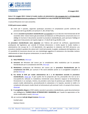 23 maggio 2013 Entro il 31 maggio 2013 i titolari di studio medico ed odontoiatrico che occupano da 1 a 10 dipendenti dovranno obbligatoriamente predisporre il DOCUMENTO di VALUTAZIONE DEI RISCHI (DVR). L’autocertificazione non è più consentita. Il DVR potrà essere redatto: 1) come per il passato, seguendo qualunque procedura di compilazione purché conforme alle previsioni del D.Lgs.81/08 e smi (articoli 17, 28 e 29 del TUS), 2) ovvero secondo le procedure standardizzate (consigliabile) di cui al decreto interministeriale del 30 novembre 2012. Coloro hanno già provveduto ad elaborare un DVR potranno conservarlo (non vi è obbligo di riscrivere il documento secondo le procedure standardizzate, però permane l’obbligo di aggiornare il documento nel rispetto degli art. 17,18,29 del D.Lgs 81/08 e smi). Le procedure standardizzate sono check-list con l’elenco dei pericoli da verificare, appositamente predisposte dal legislatore, per aziende di limitata dimensione e rischio (quale lo studio medico o odontoiatrico che occupa da 1 a 10 dipendenti), che agevolano la redazione del DVR attraverso una procedura standard e guidata che valuta tutti i rischi (ed essendo -le griglie- predisposte dal legislatore, non c’è possibilità di trascurane alcuno) con una metodologia oggettiva di valutazione che dovrebbe mettere relativamente al riparo da grosse contestazioni, in caso di verifiche. LEGGI GLI ALLEGATI: 1) Nota FNOMCeO, clicca qui 2) Istruzioni del Ministero del Lavoro per la compilazione della modulistica per le procedure Standardizzate per la compilazione del DVR, clicca qui. 3) Modulistica predisposta dal Ministero del Lavoro per le procedure Standardizzate per la compilazione del DVR, per scaricare il file word editabile (anche se è consigliabile compilarlo a penna) clicca qui. 4) Fac Simile di DVR per studio odontoiatrico da 1 a 10 dipendenti secondo le procedure standardizzate, clicca qui. Vi giro quello che ho preparato per me, precisando che non so se è ineccepibile.Ho utilizzato la modulistica ministeriale senza alterarne neppure la formattazione. Ovviamente è un esempio, minimo, da prendere come base di partenza per elaborare il DVR del proprio studio odontoiatrico, personalizzando la valutazione e le risposte, secondo la realtà e la complessità del proprio studio (locali ed attrezzature), gli eventuali rischi e la propria forza lavoro, clicca qui. 5) È consigliabile allegare al DVR redatto secondo la procedura standardizzata, quale documentazione non obbligatoria, l’ELENCO DELLE ATTREZZATURE E MANSIONI, per il quale ho approntato un fac simile modificabile in word, clicca qui. 6) per scaricare tutti gli allegati insieme clicca qui. Cordiali saluti. Gaetano Ciancio Via SS. Martiri Salernitani, 31 - 84123 Salerno - tel. 089.226566 e-mail: [email protected] - fax: 089.252363 ALLEGATO n.1 Istruzioni del Ministero del Lavoro per la compilazione della modulistica per le procedure Standardizzate per la compilazione del DVR . PROCEDURE STANDARDIZZATE PER LA VALUTAZIONE DEI RISCHI ai sensi dell’art. 29 D.Lgs. 81/2008 1 INDICE I. II. Procedura standardizzata per la valutazione dei rischi ai sensi dell’articolo 6, comma 8, lettera f) e dell’art. 29, comma 5 del D.Lgs. 81/2008 e s.m.i. pag. 3-11 Modulistica per la redazione del documento di valutazione dei rischi aziendale pag.12-25 2 SCHEMA DELLA PROCEDURA STANDARDIZZATA Azioni Moduli* Istruzioni e (disponibili e gestibili supporti anche in formato PASSO N. 2 PASSO N. 1 elettronico) Descrizione generale dell’azienda Descrizione dell’azienda, del ciclo Descrizione delle lavorazioni aziendali e lavorativo/attiv identificazione delle mansioni ità e delle mansioni Individuazione Individuazione dei pericoli presenti in azienda dei pericoli presenti in azienda MODULO N. 1.1 Valutazione dei rischi associati ai pericoli individuati e identificazione delle misure di prevenzione e protezione attuate Identificazione delle mansioni ricoperte dalle persone esposte e degli ambienti di lavoro interessati in relazione ai pericoli individuati. Individuazione di strumenti informativi di supporto per l’effettuazione della valutazione dei rischi (registro infortuni, profili di rischio, banche dati su fattori di rischio indici infortunistici, liste di controllo, ecc.). MODULO N.3 (colonne dalla n.1 alla n.3) MODULO N.3 (colonna n.4) Effettuazione della valutazione dei rischi per tutti i pericoli individuati: PASSO N. 3 - - informativi Paragrafo 4.1 MODULO N. 1.2 MODULO N. 2 Paragrafo 4.2 Paragrafo 4.3 in presenza di indicazioni legislative specifiche sulle modalità valutative, mediante criteri che prevedano anche prove, misurazioni e parametri di confronto tecnici; in assenza di indicazioni legislative specifiche sulle modalità di valutazione, mediante criteri basati sull’esperienza e conoscenza dell’azienda e, ove disponibili, sui dati desumibili da registro infortuni, indici infortunistici, dinamiche infortunistiche, profili di rischio, liste di controllo, norme tecniche, istruzioni di uso e manutenzione, ecc. Individuazione delle adeguate misure di prevenzione e protezione Qualora si verifichi che non tutte le adeguate misure di prevenzione e protezione previste dalla legislazione sono state attuate, si dovrà provvedere con interventi immediati. 3 PASSO N. 4 Definizione del programma di miglioramento Indicazione delle misure di prevenzione e protezione attuate Individuazione delle misure per garantire il MODULO N. 3 (colonne dalla 6 alla miglioramento nel tempo dei livelli di sicurezza 8) Individuazione delle procedure per la attuazione delle misure MODULO N.3 (colonna 5) Paragrafo 4.4 *Altra eventuale documentazione da tenere a disposizione (a supporto della valutazione effettuata e, comunque, ove richiesto dalla normativa) 4 I Procedura Standardizzata per la valutazione dei rischi ai sensi dell’articolo 6, comma 8, lettera f) e dell’art. 29, comma 5 del D.Lgs. 81/2008 e s.m.i. 1. Scopo Scopo della presente procedura è